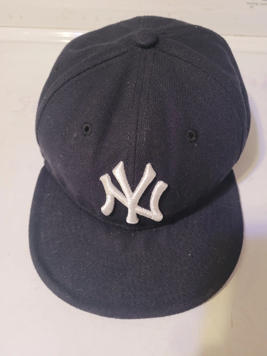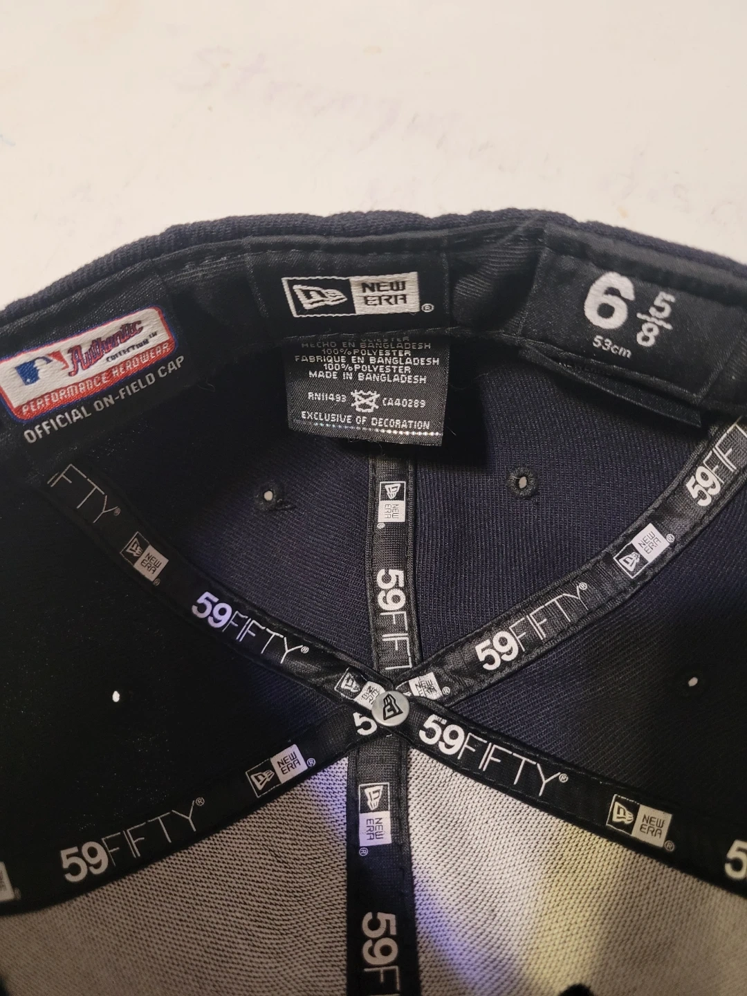 This is a New Era 59FIFTY fitted baseball cap for the New York Yankees. It's a size 6 5/8. The cap is made of polyester and features embroidered team logo. It's an official on-field cap.