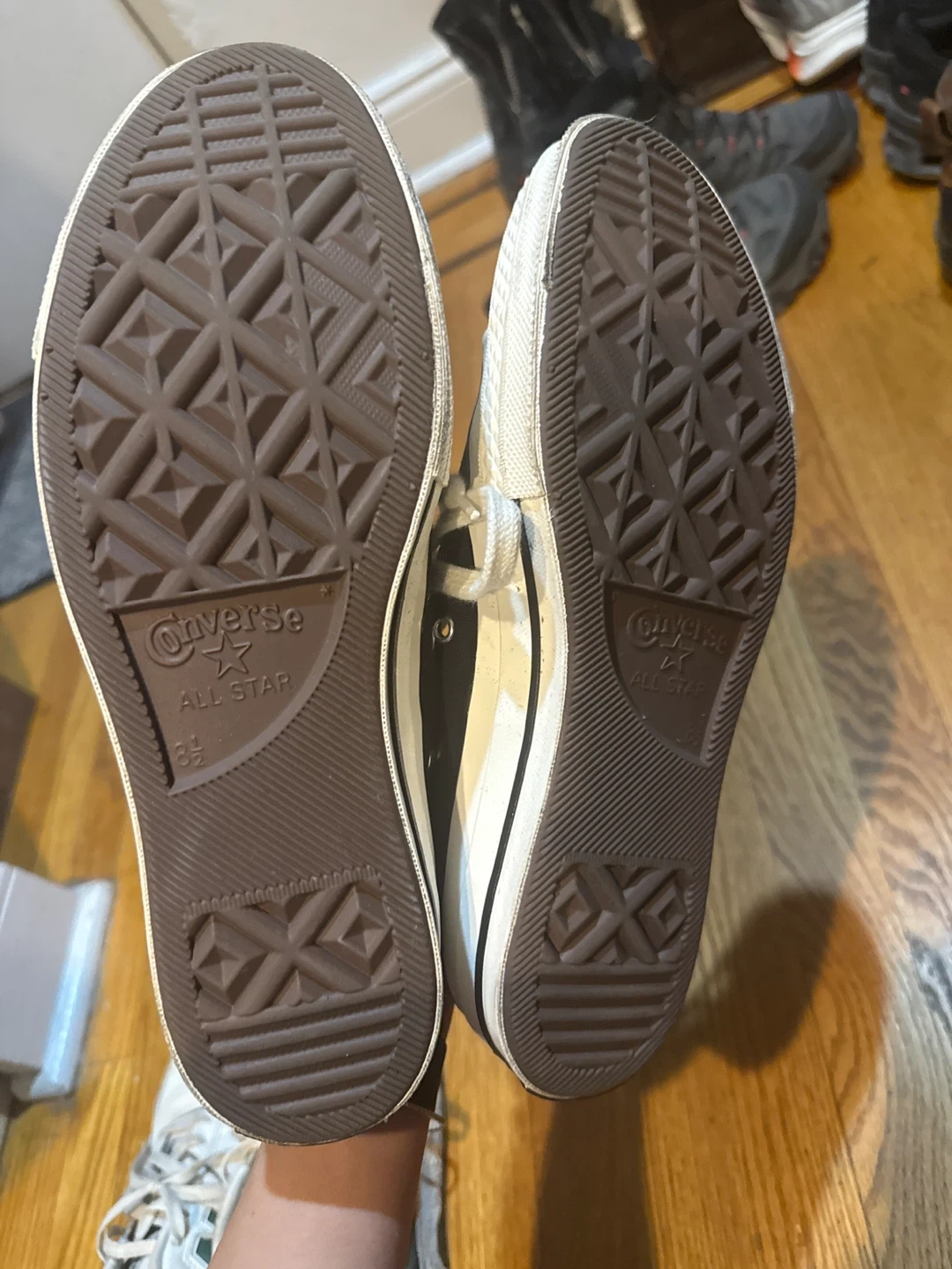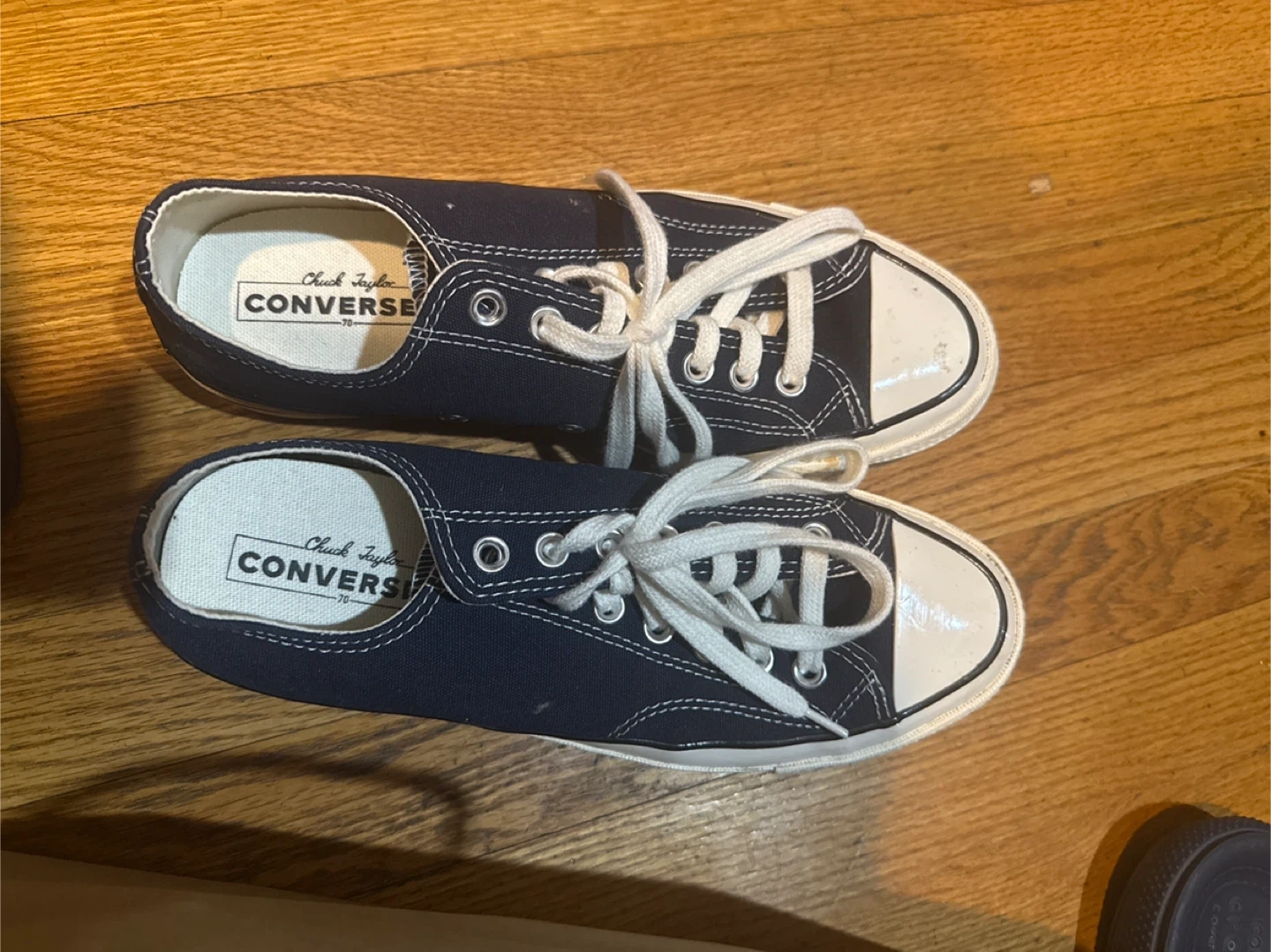Navy blue Converse Chuck Taylor All Star low top sneakers. Lace-up closure with white laces. Rubber sole.
