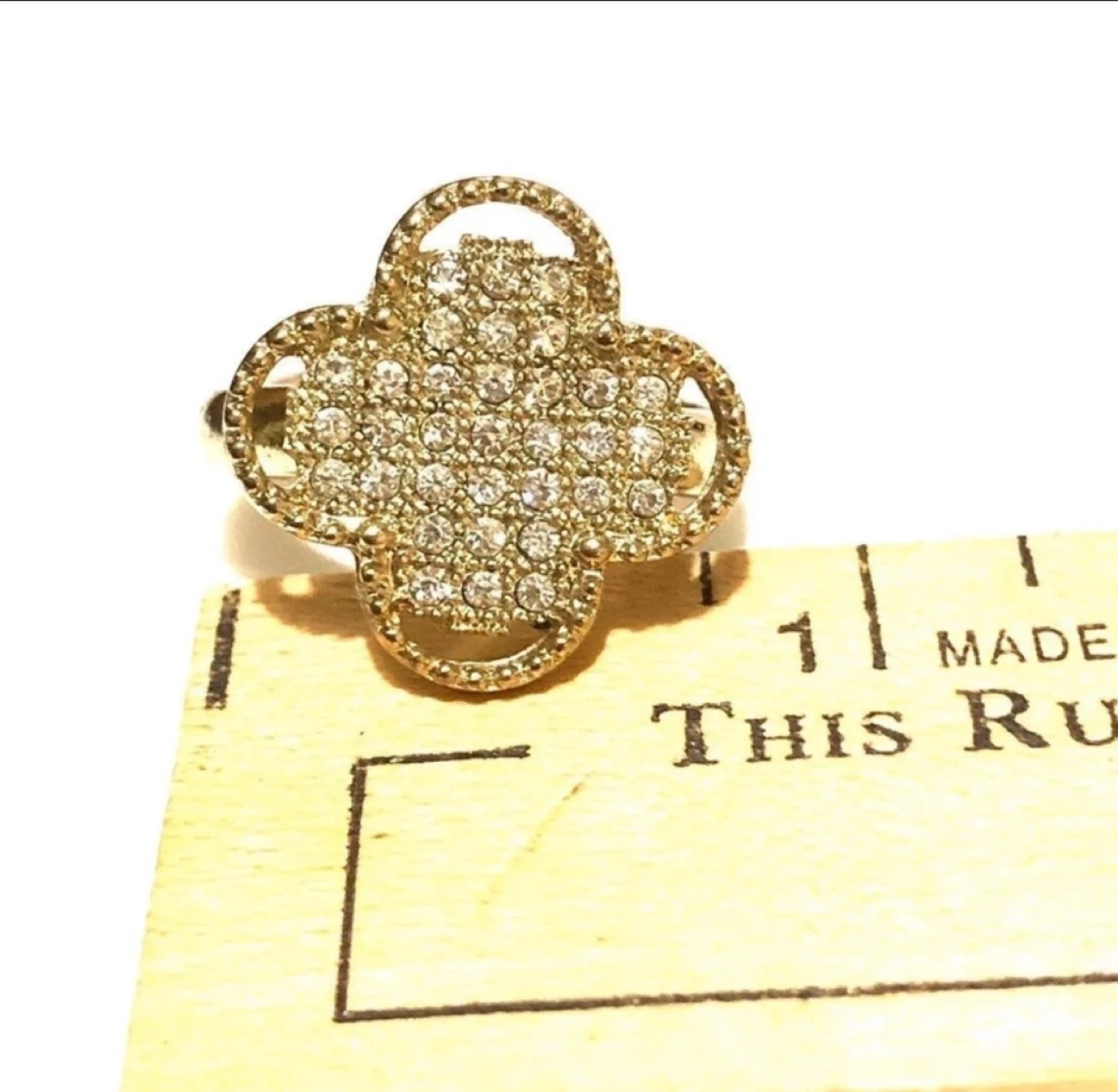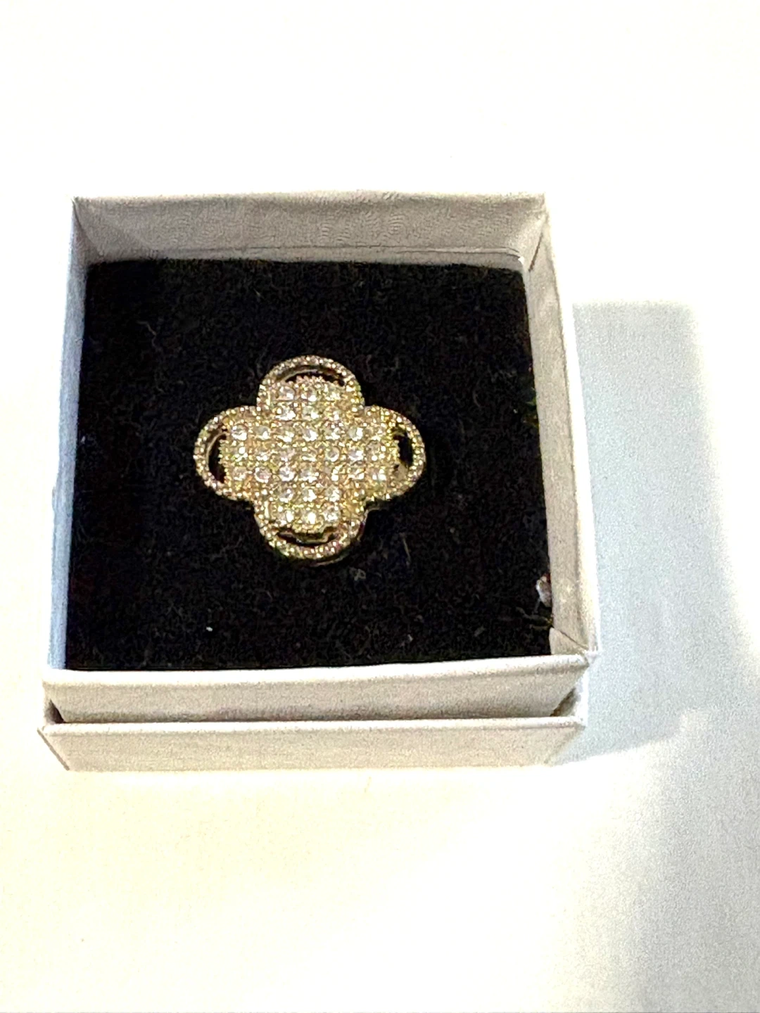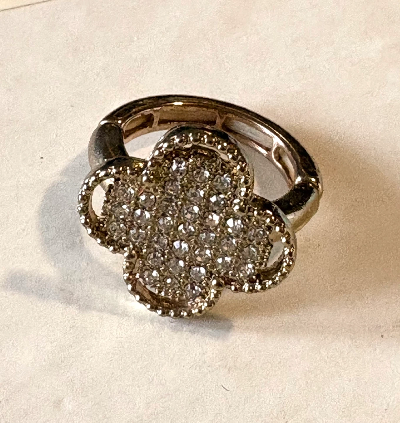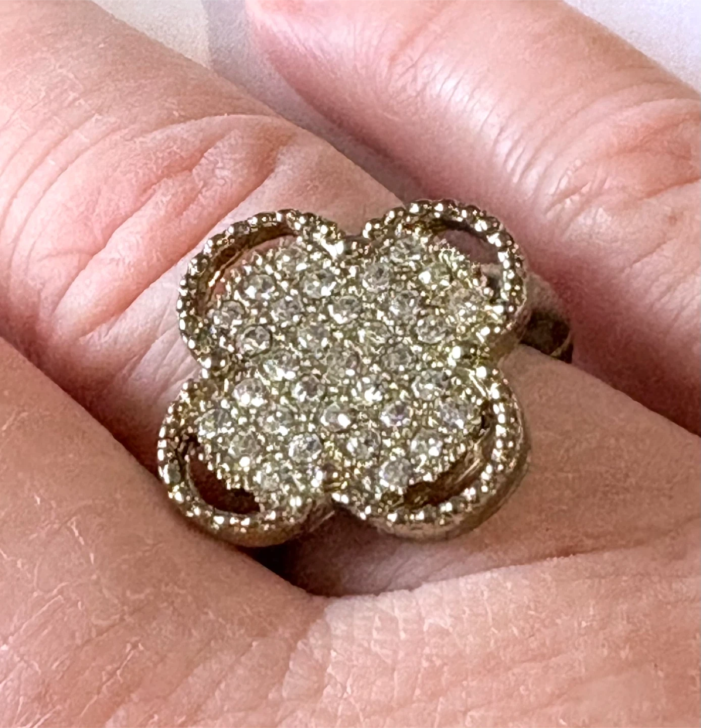 Sparkly ring with a clover design, encrusted with small crystals. Band is silver-toned metal.