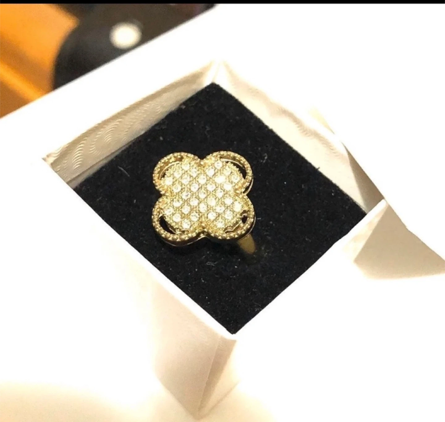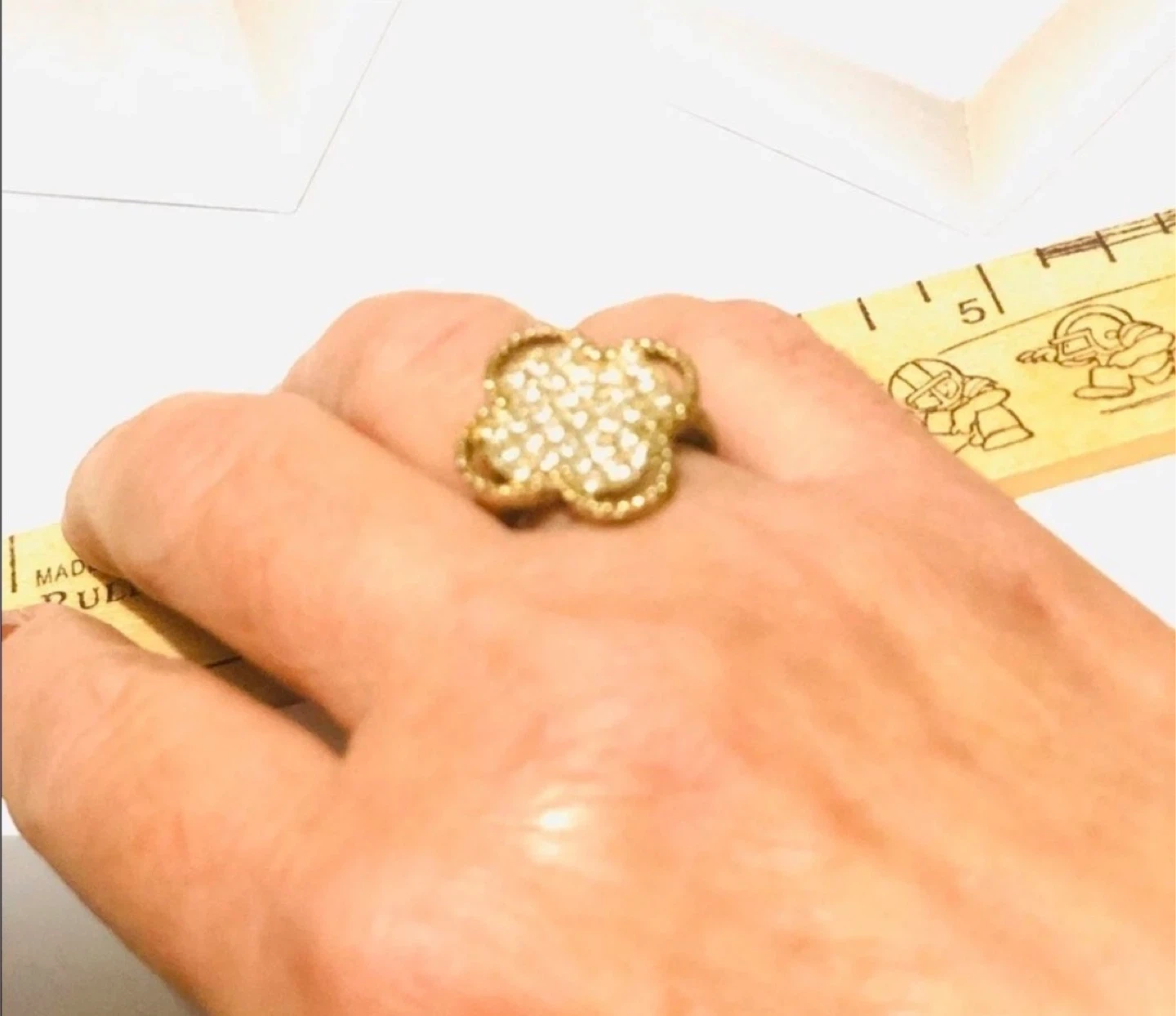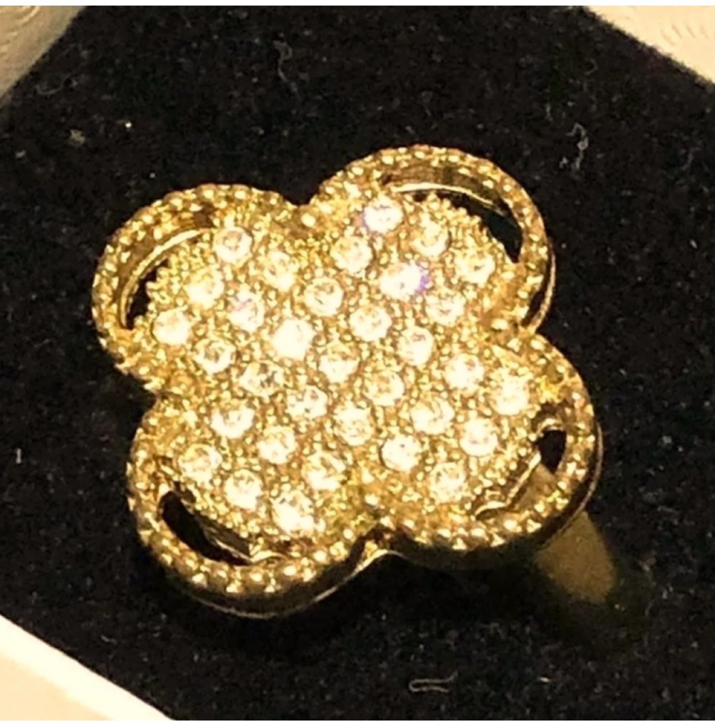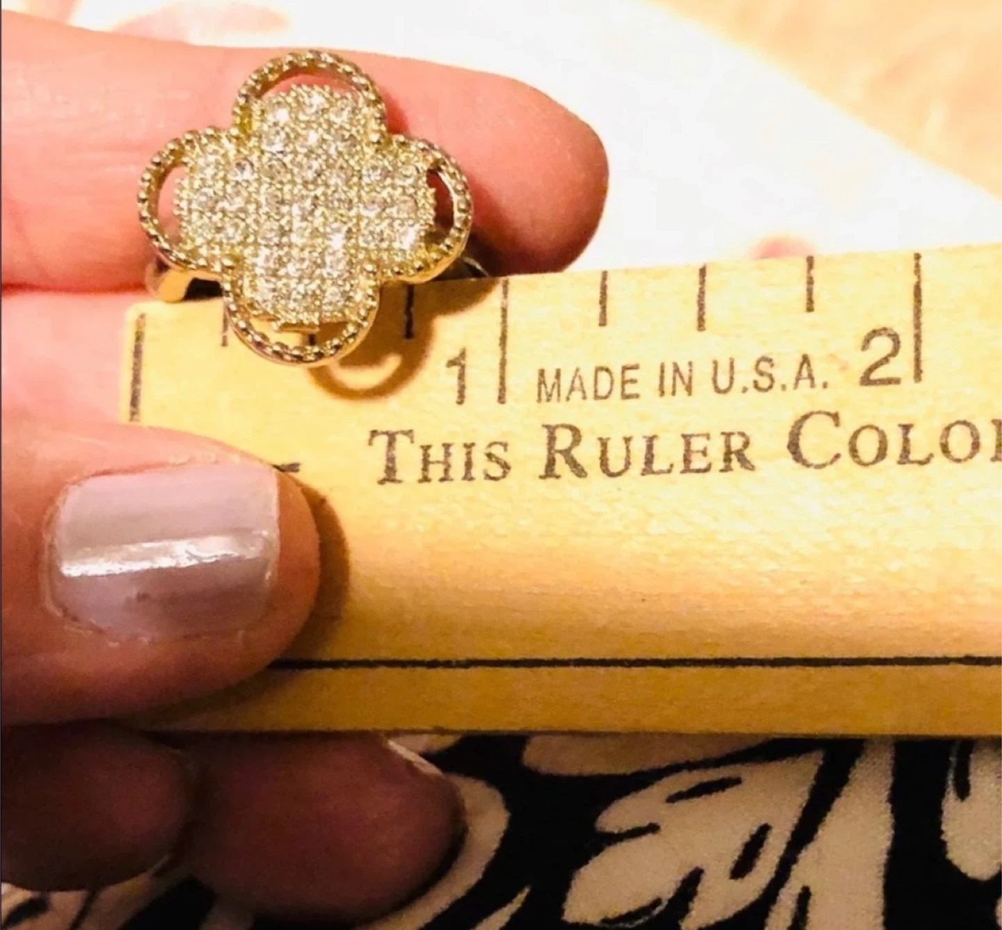 Sparkly ring with a clover design, encrusted with small crystals. Band is silver-toned metal.