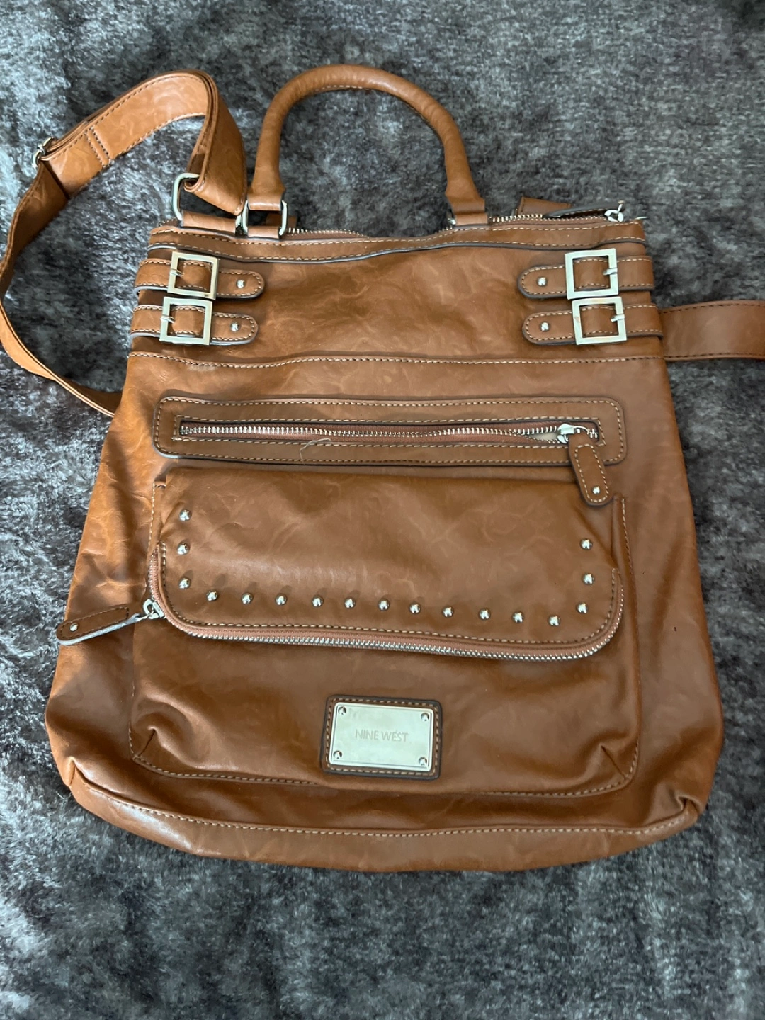 Stylish brown tote bag. Features two top handles, a detachable shoulder strap, and silver-toned hardware. Multiple pockets. Zipper closure. Great for everyday use.