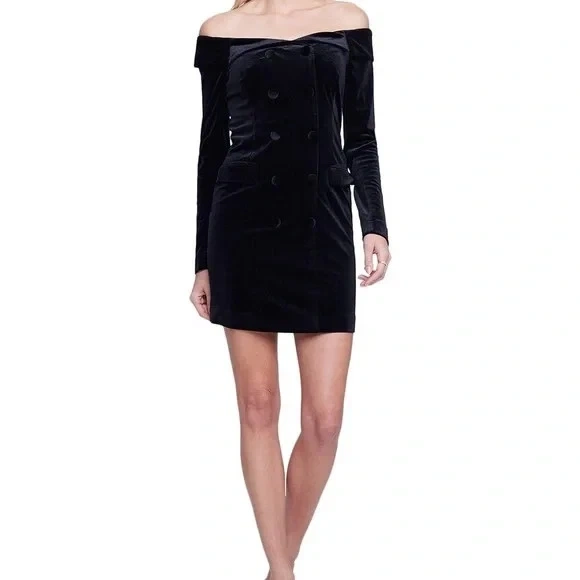New with tags. Solid pattern, long sleeves, off-the-shoulder neckline. Zip closure. Occasion: Party/Cocktail. Dry clean only. Black velvet fabric (90% polyester, 10% spandex). Accented with buttons. Short dress length. Lined. Women's size 10.