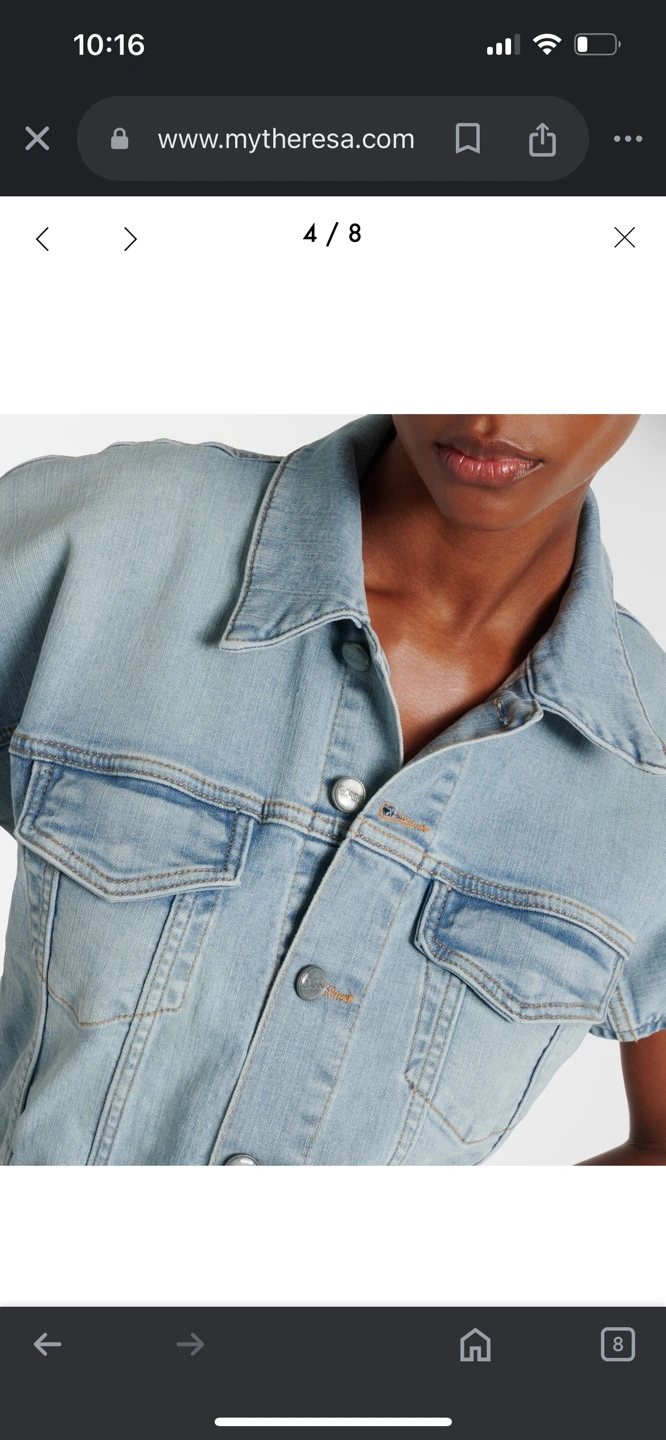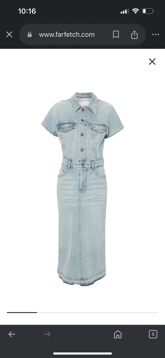 Stunning light wash denim midi dress. Short sleeves, collared neckline, button front closure. Relaxed fit.