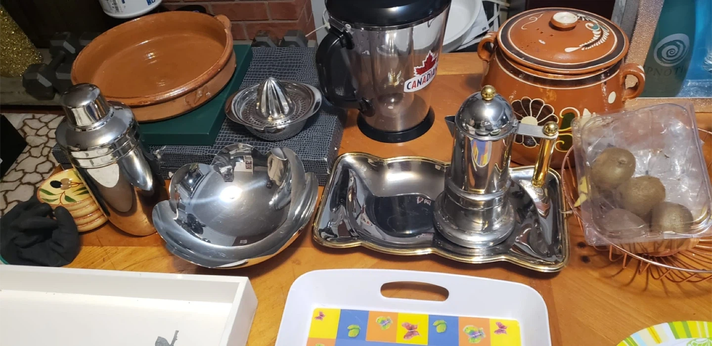 Selling a mixed lot of kitchenware items! Includes a cocktail shaker, citrus juicer, serving bowls, a stainless steel blender with a Canadian flag sticker, a decorative pot, and serving trays. Perfect for stocking up your kitchen or adding some variety to your collection