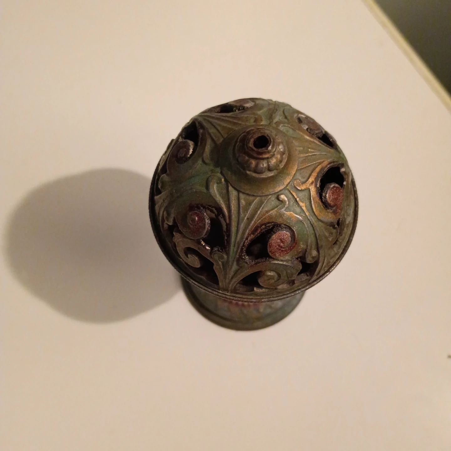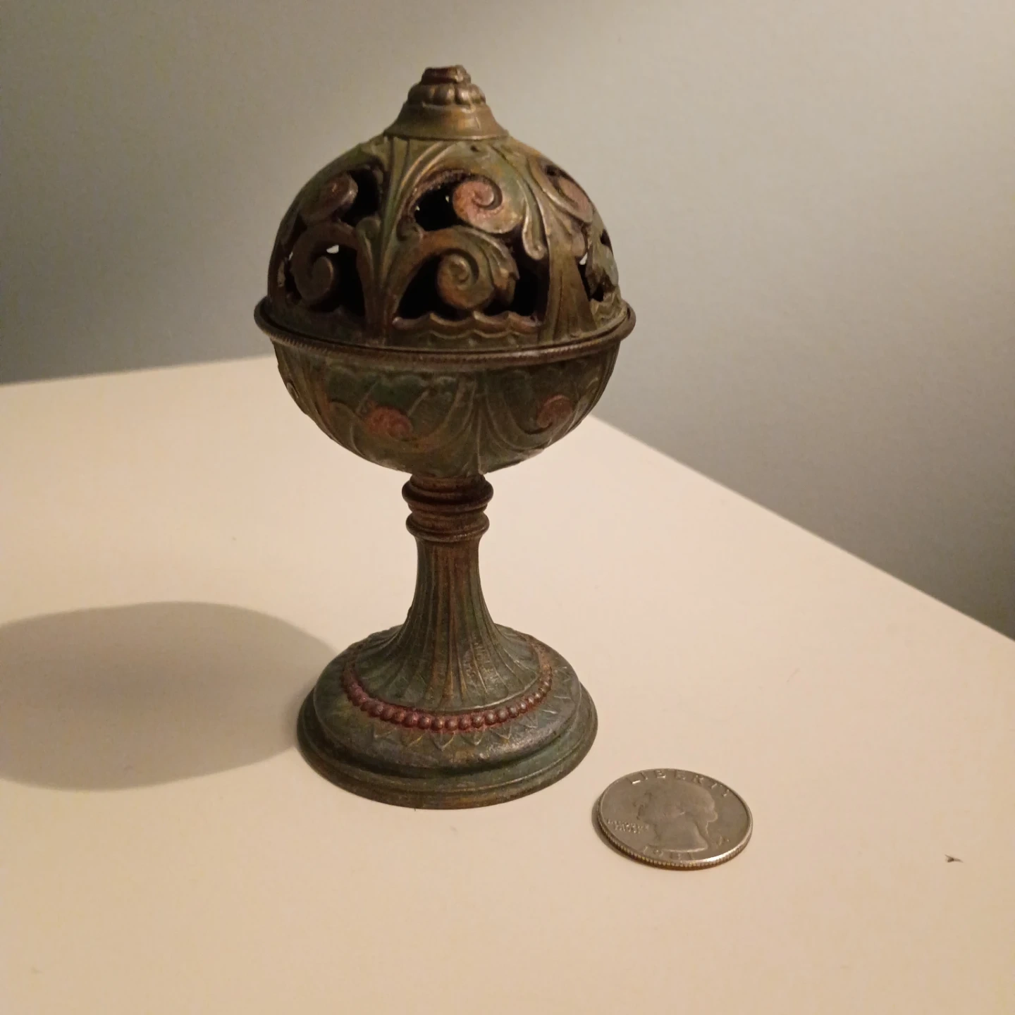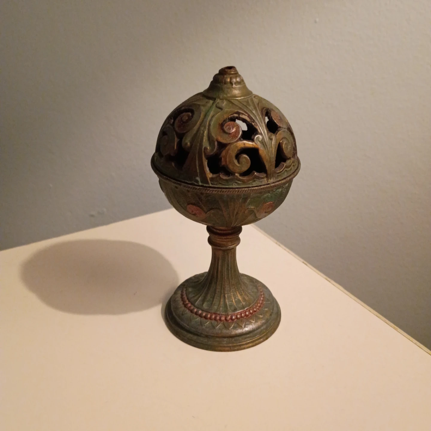 This is a vintage metal incense burner with intricate detailing. It's designed with an ornate, spherical top with cutouts and a decorative base. This burner can hold incense cones or perhaps small coals for aromatherapy.