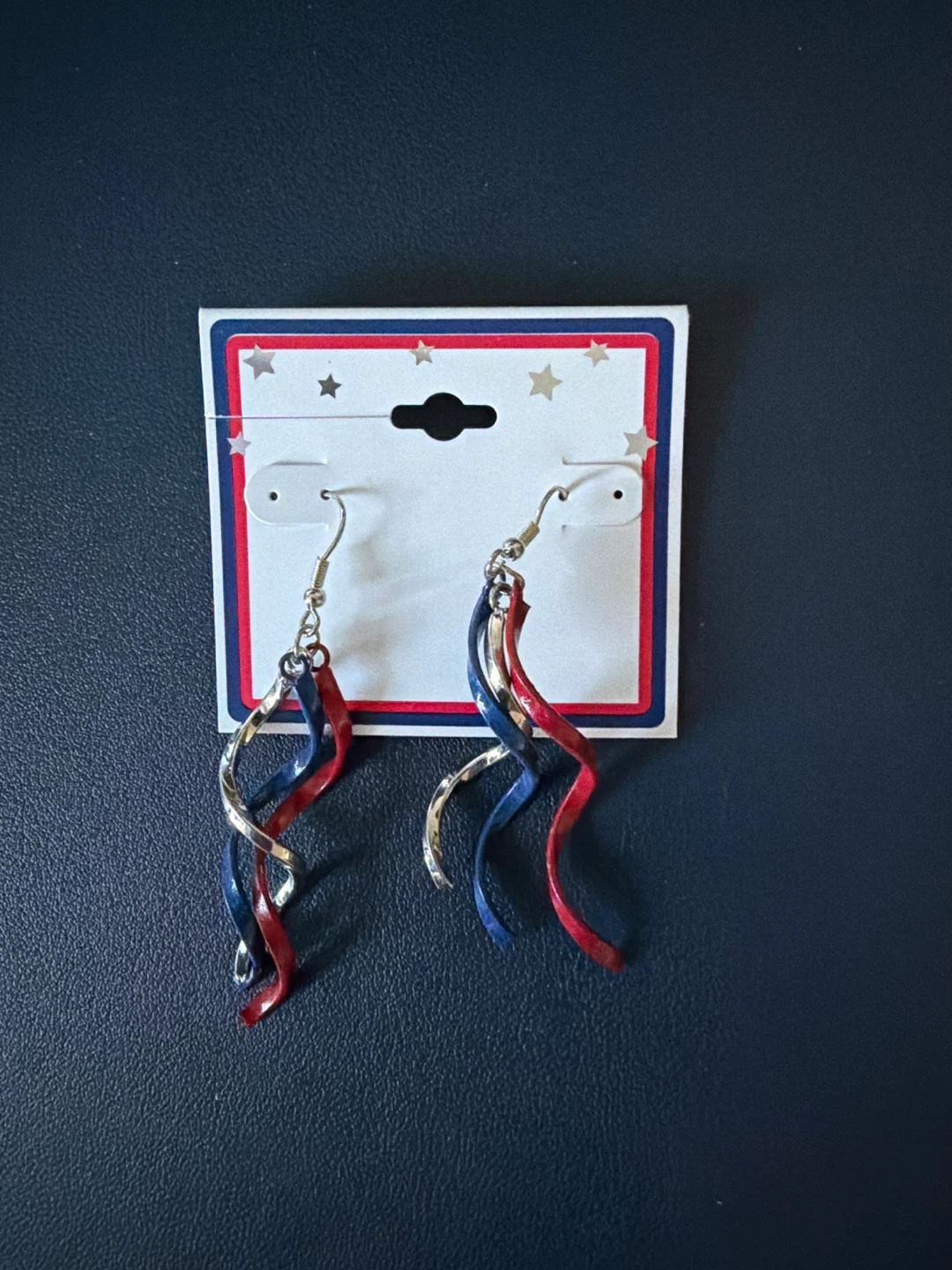 These fun dangle earrings feature a patriotic swirl design in red, white, and blue. They're lightweight and perfect for showing your spirit! Fish hook backs for easy wear.