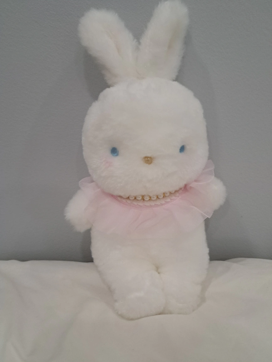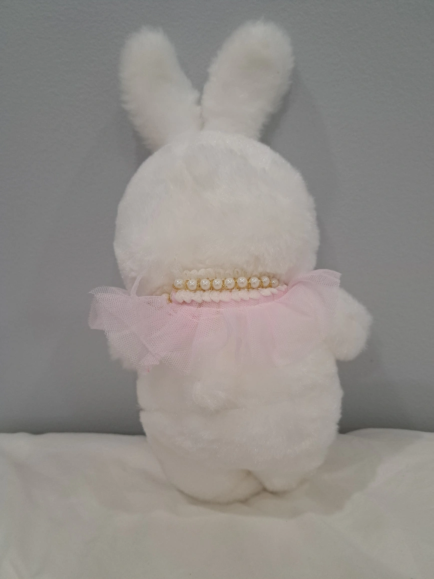 Cute white plush bunny with a pink tulle bow and pearl necklace.
