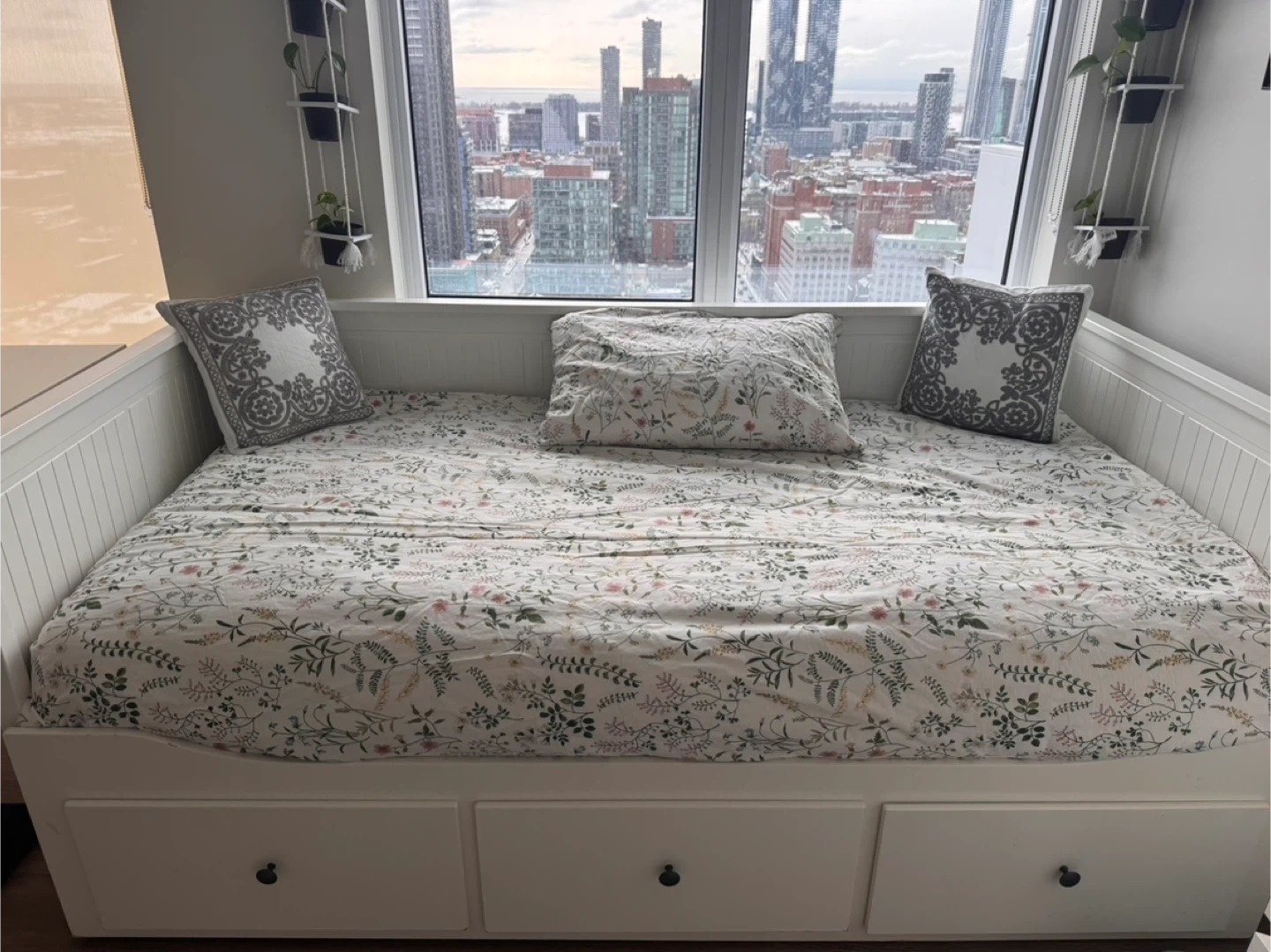 White daybed featuring three integrated storage drawers. This daybed offers a compact sleeping solution with convenient under-bed storage. This bed can become a double bed, and I can disassemble it if needed