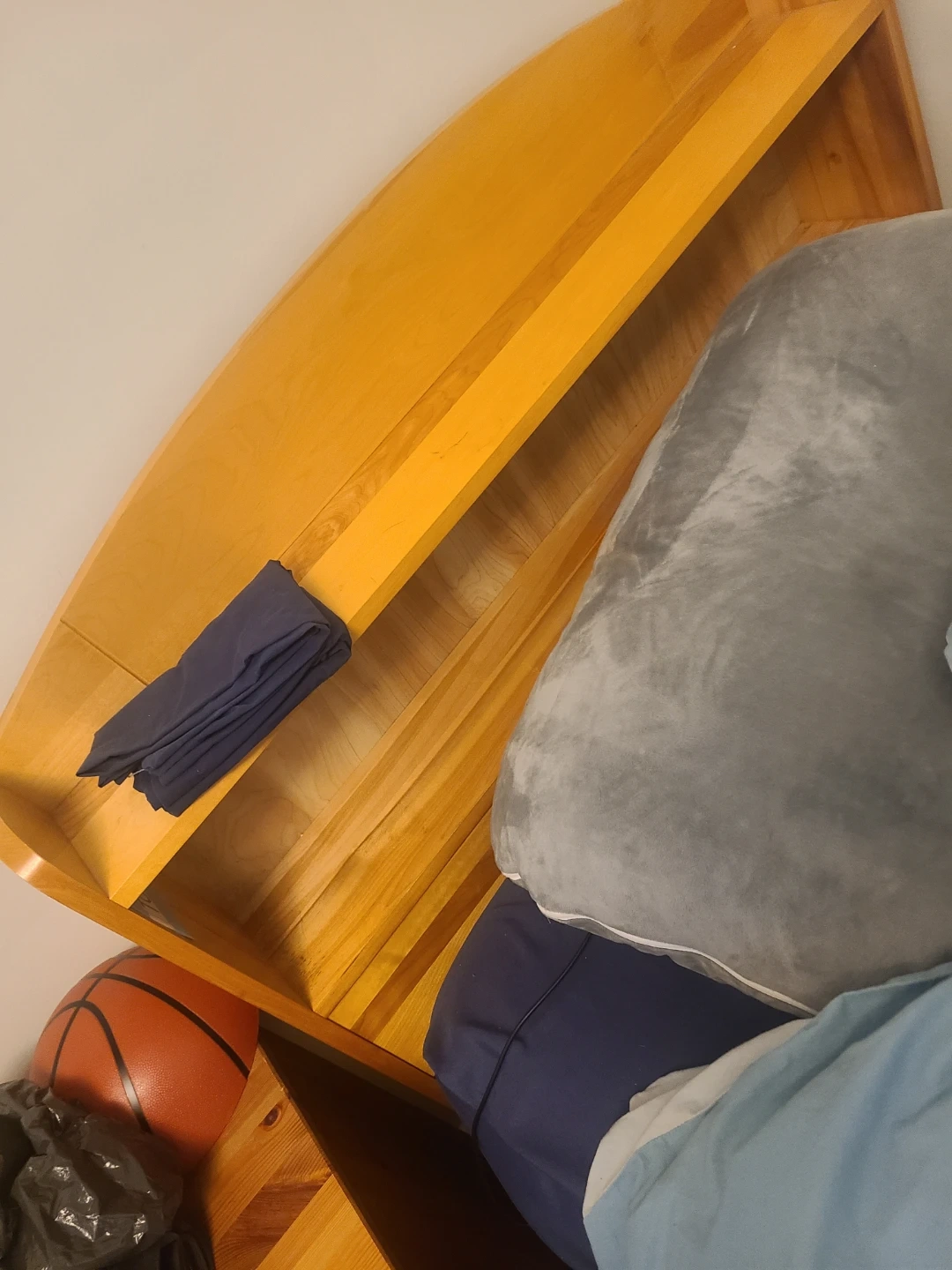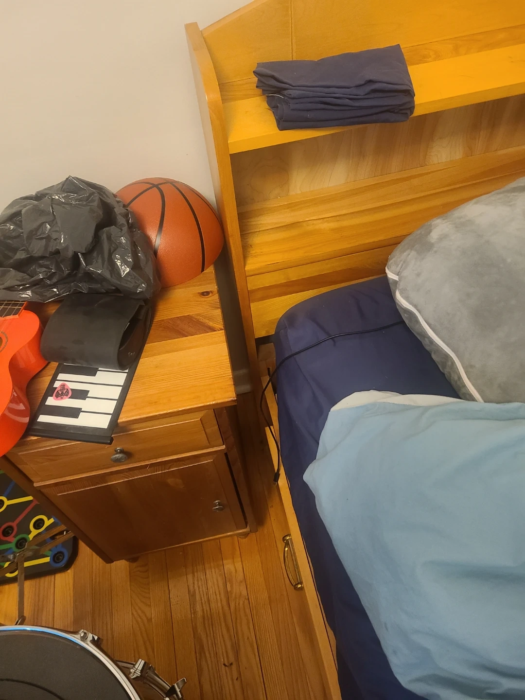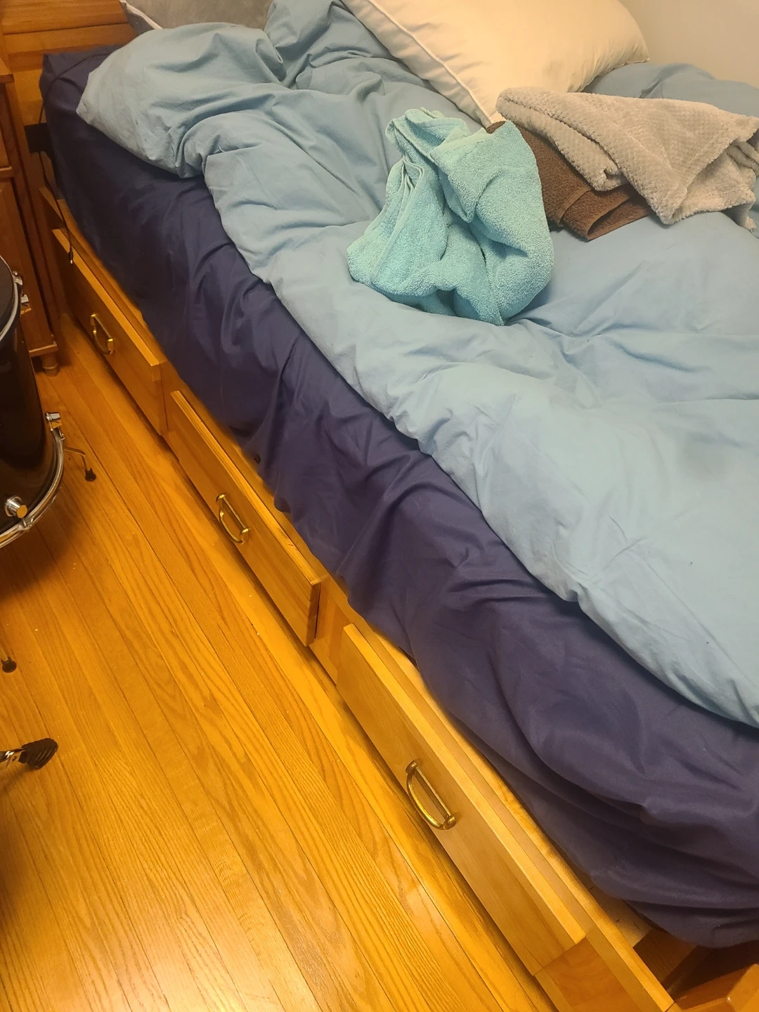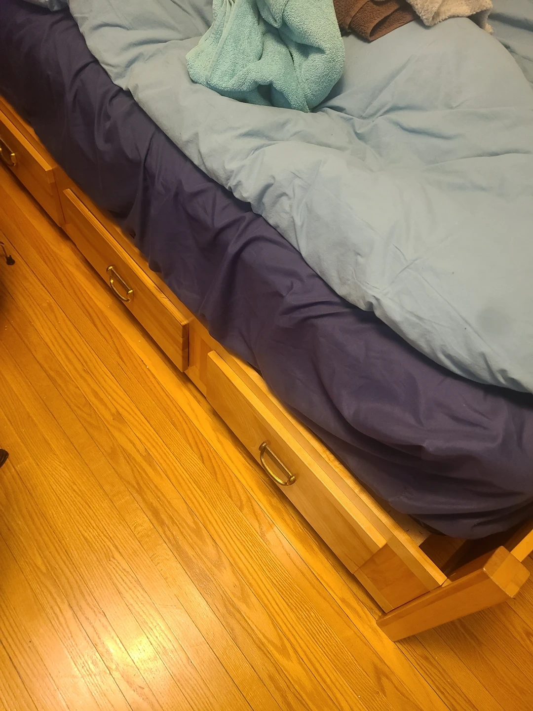 Wooden bed frame with four built-in drawers for storage. The drawers have simple gold-coloured handles. The bed frame is made of light-coloured wood.
