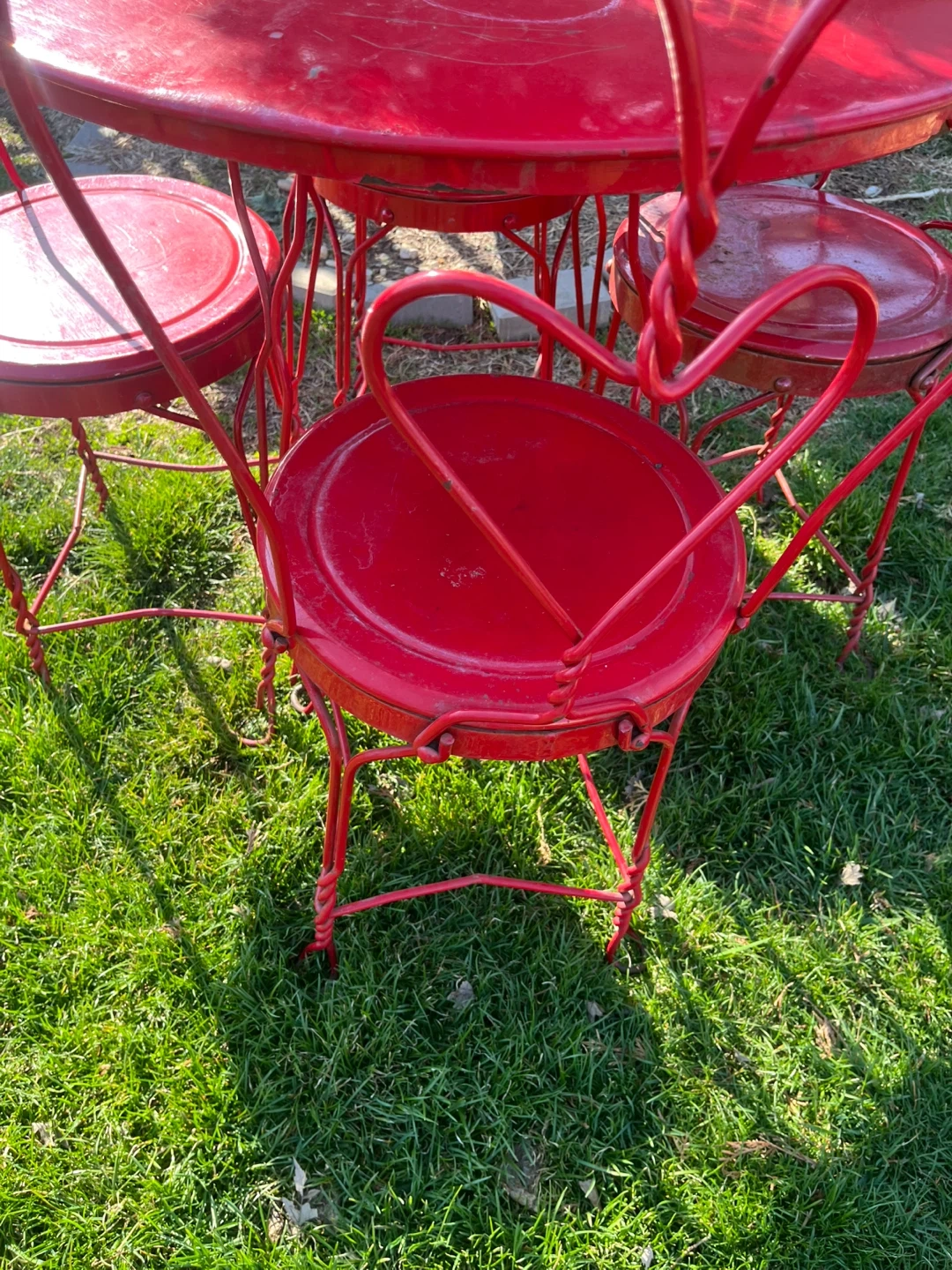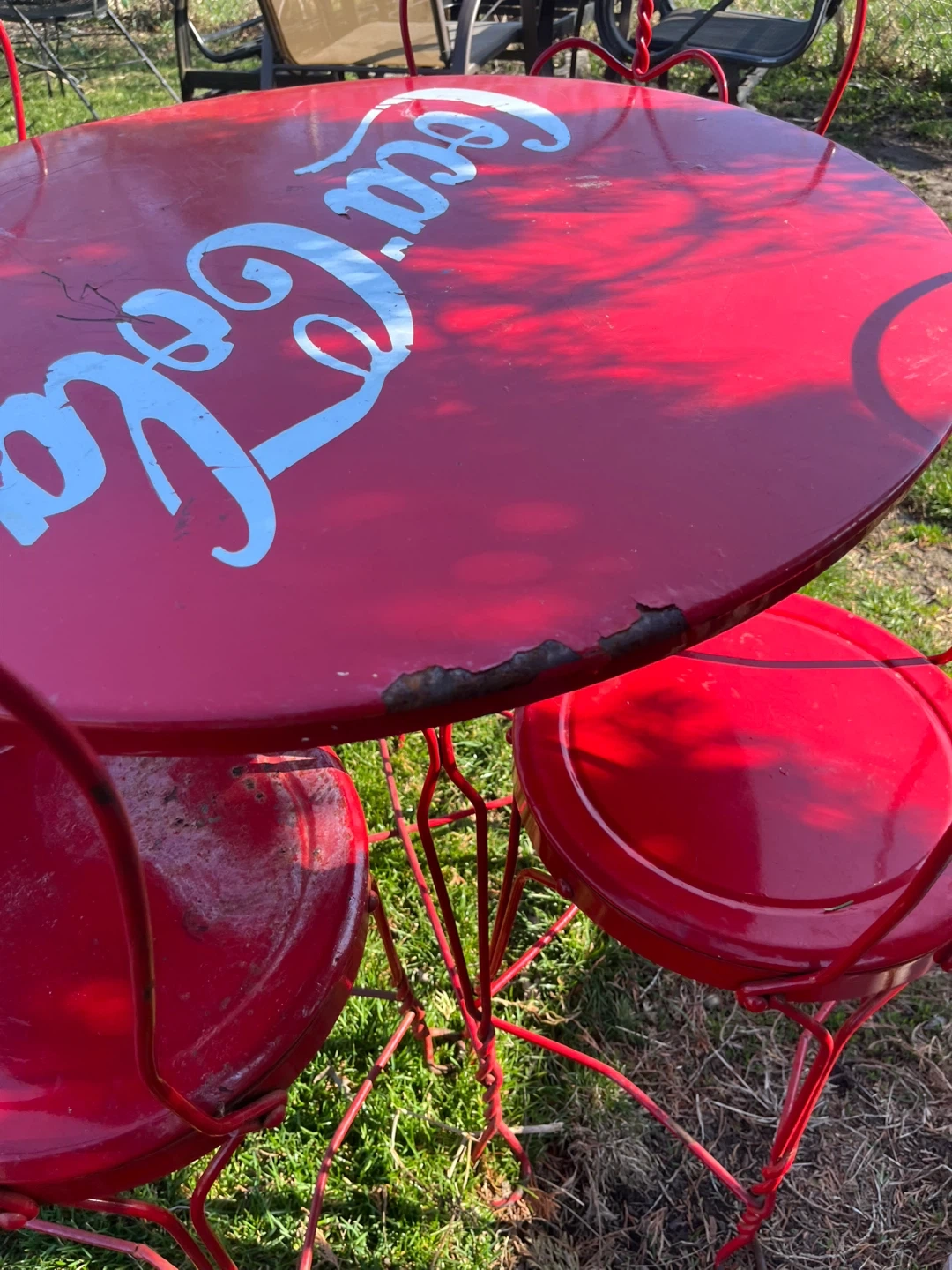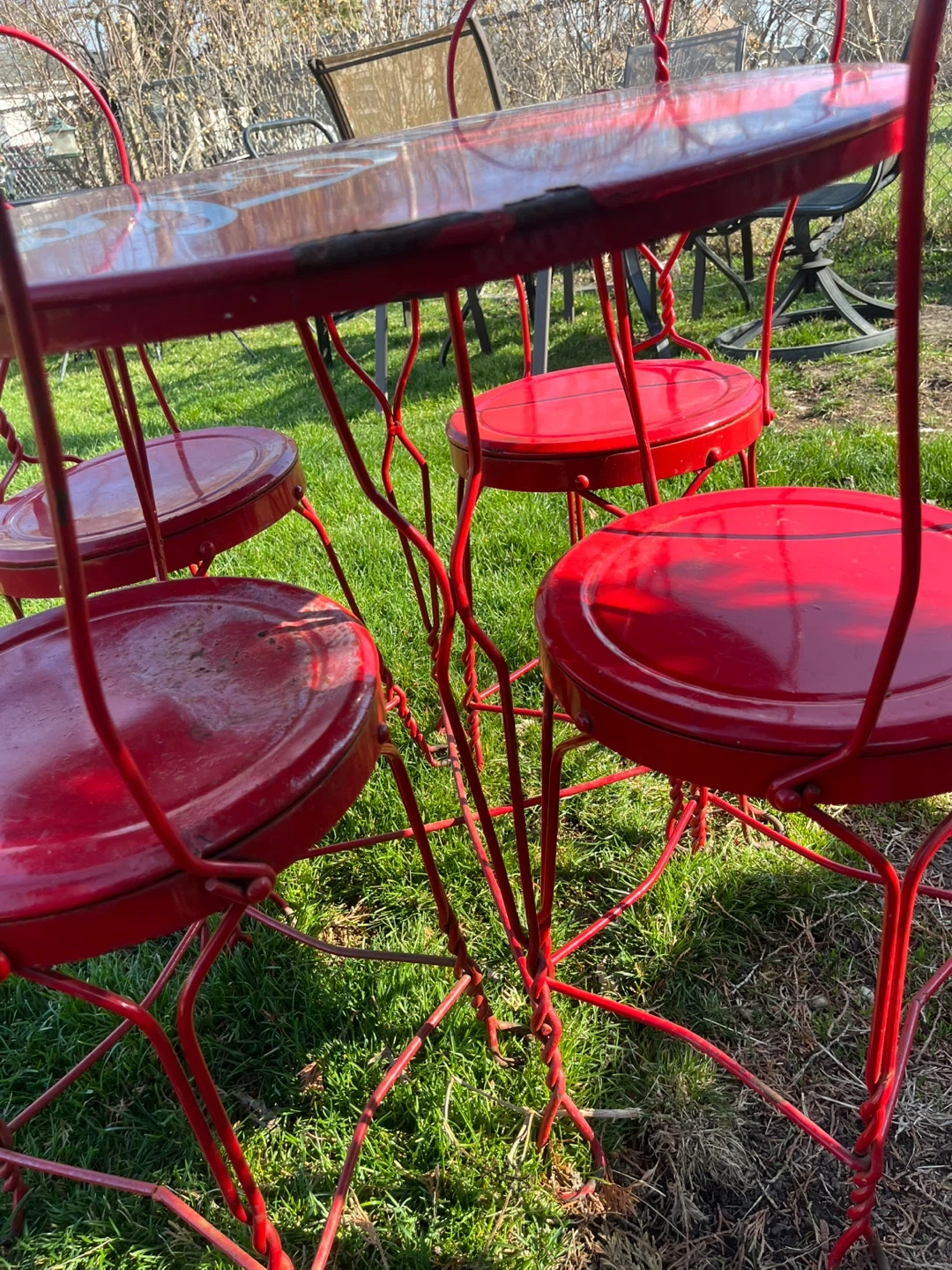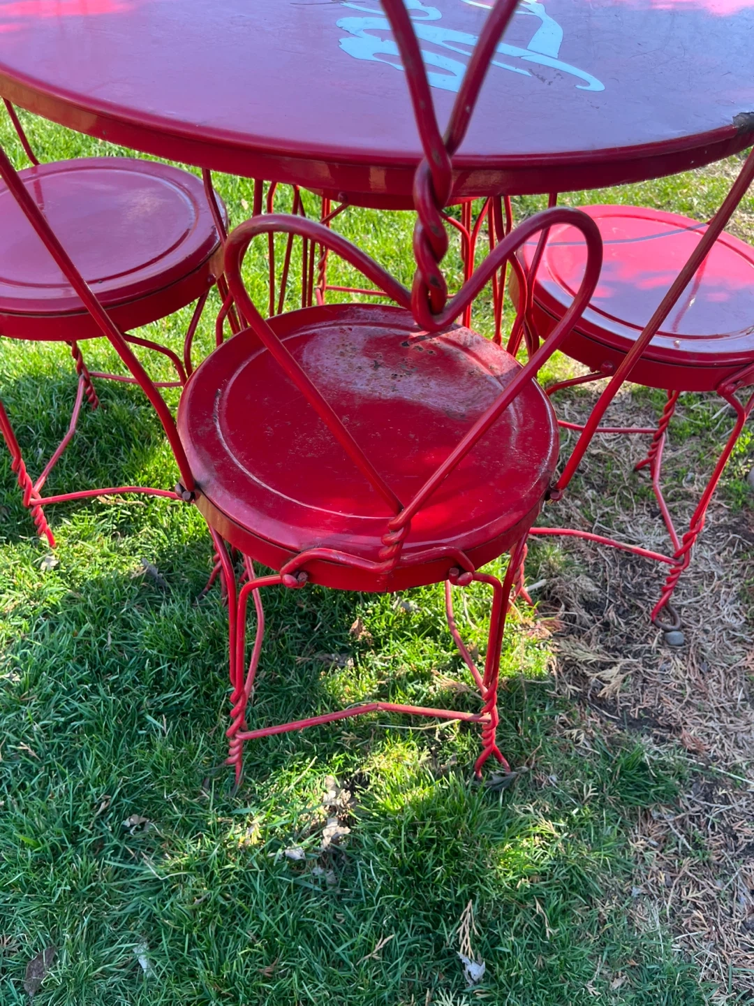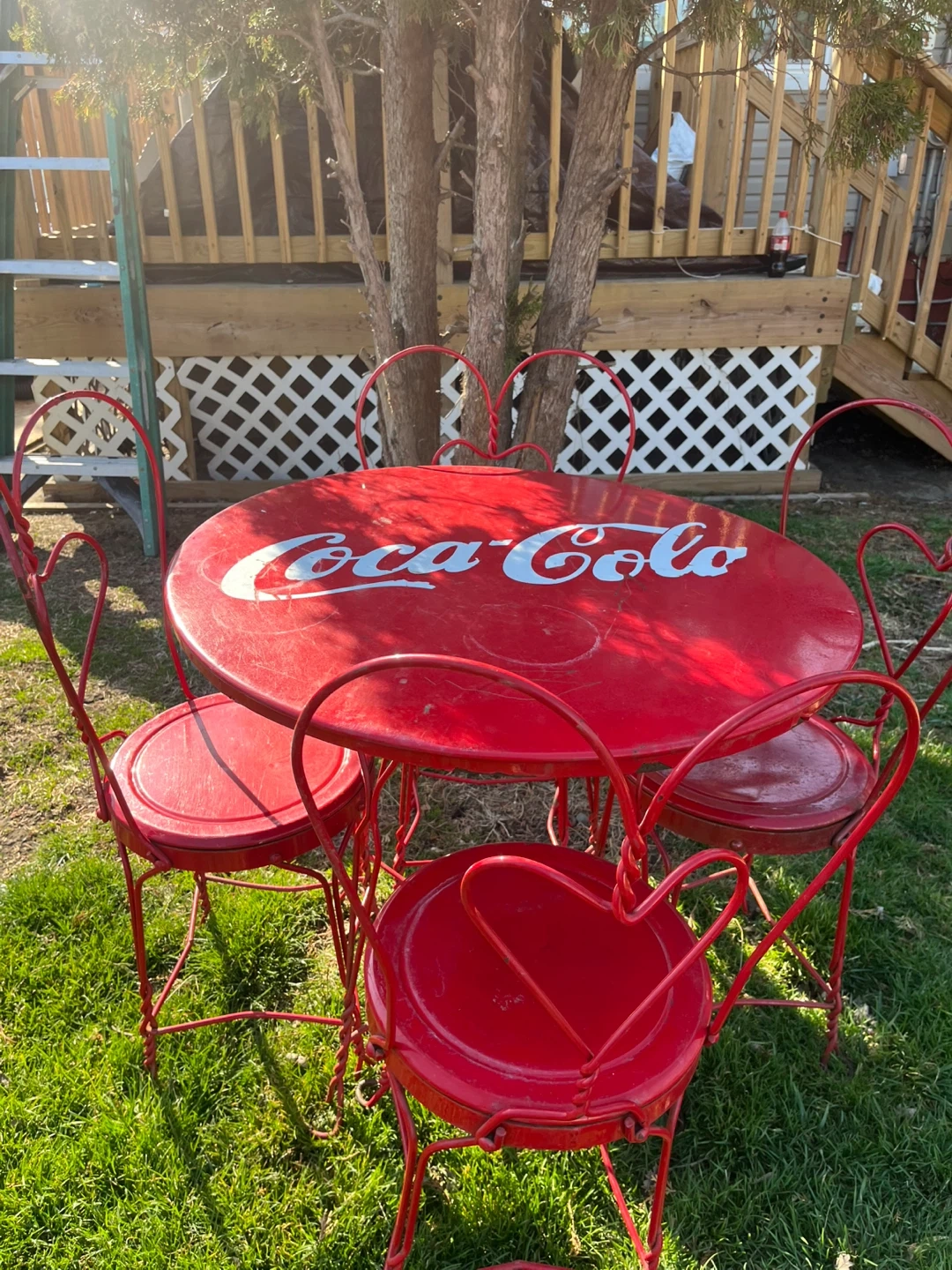 Retro red Coca-Cola metal bistro set. Includes one round table and four chairs with heart-shaped backs. Some wear on table edge consistent with age and use.