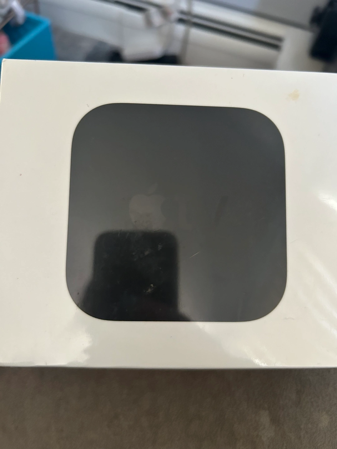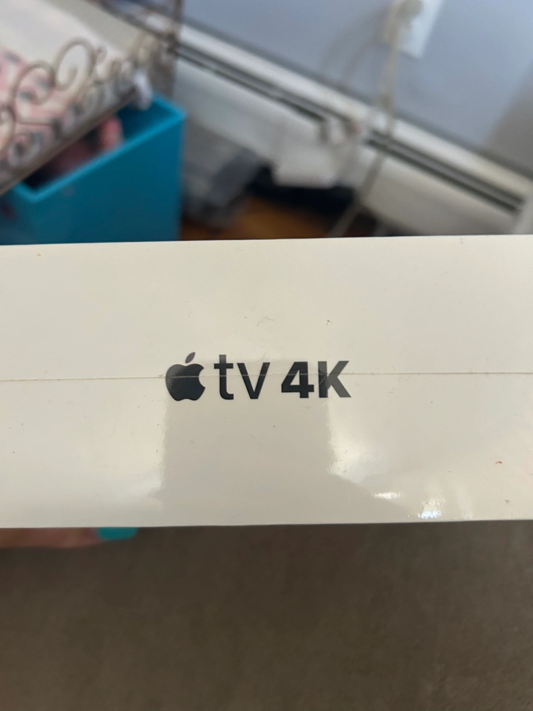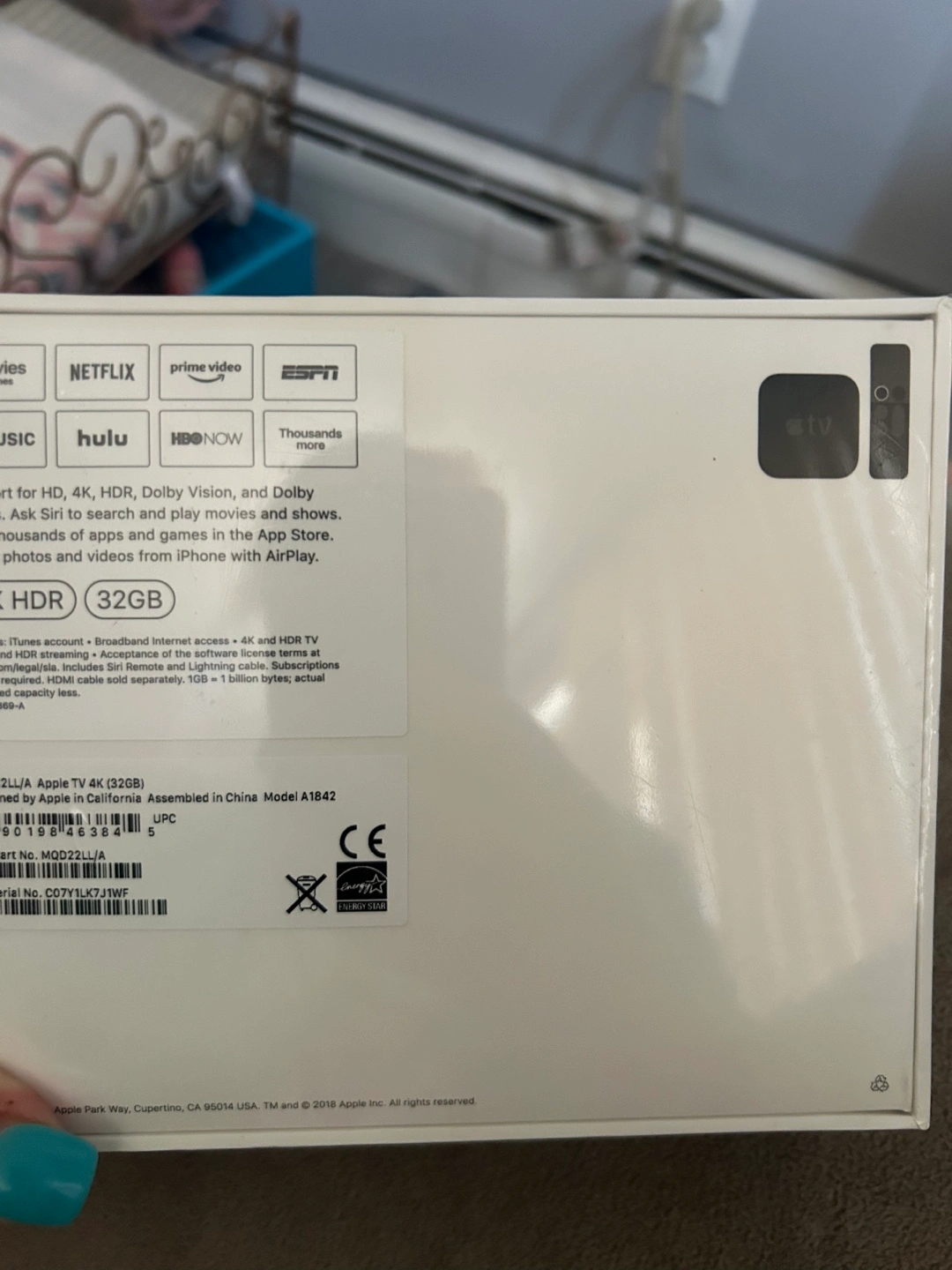 Selling an Apple TV 4K (32GB) with model number A1842. It supports 4K, HDR, Dolby Vision, and Dolby Atmos for a great viewing experience. The box is included!