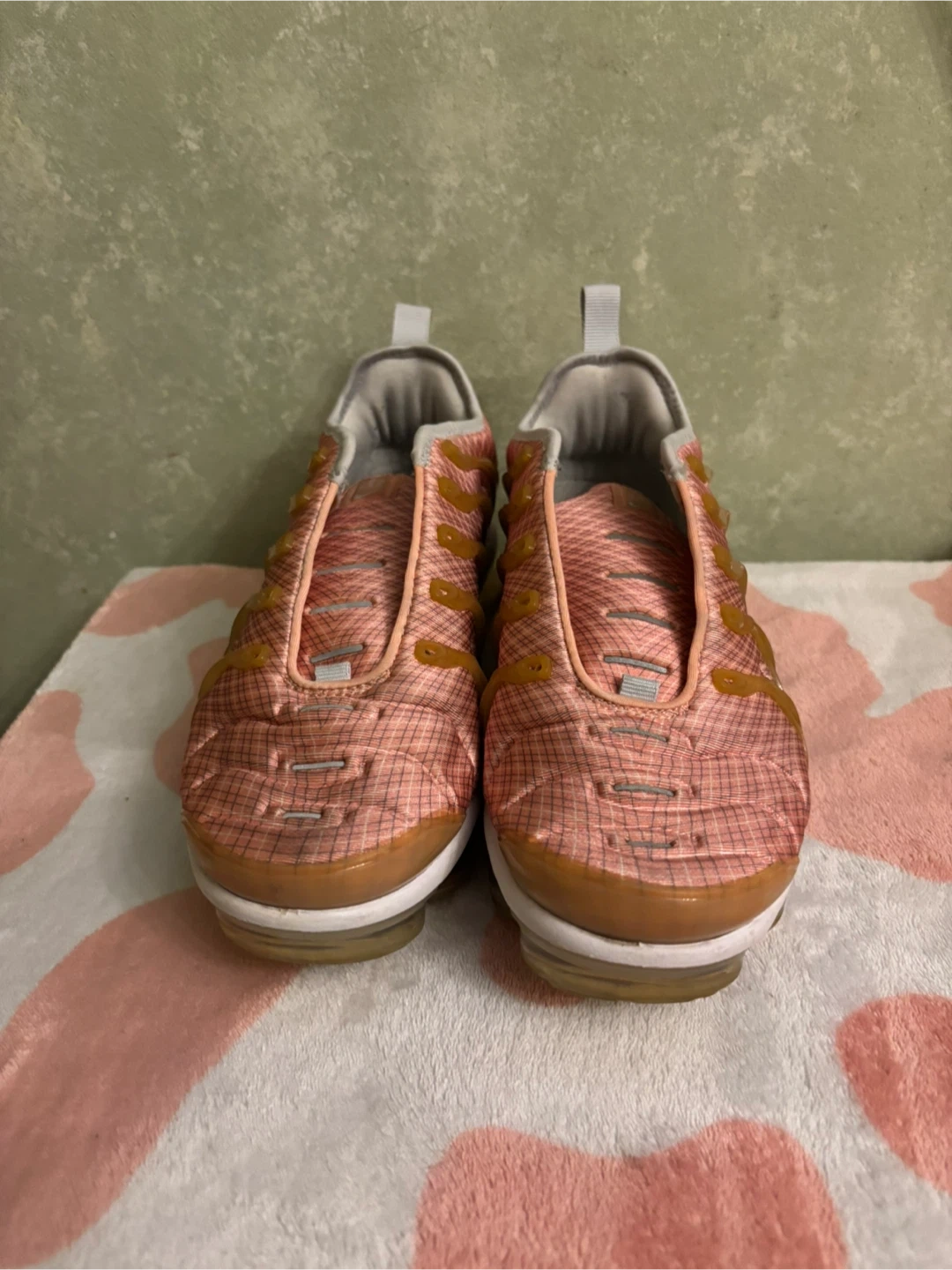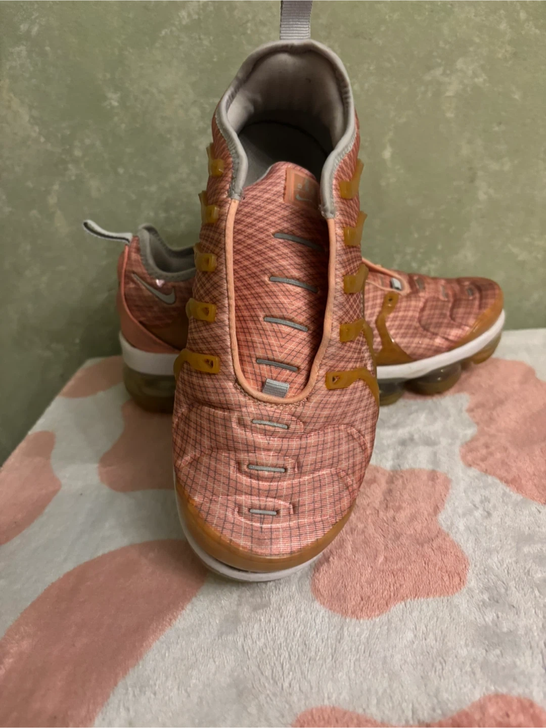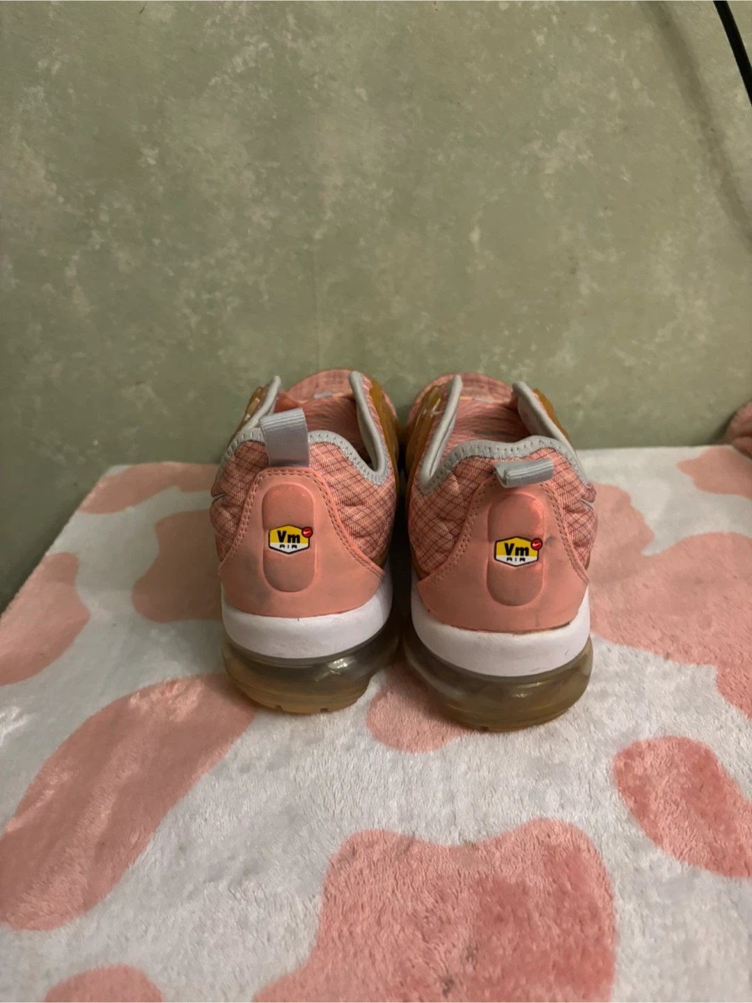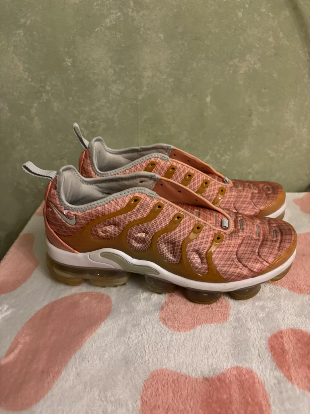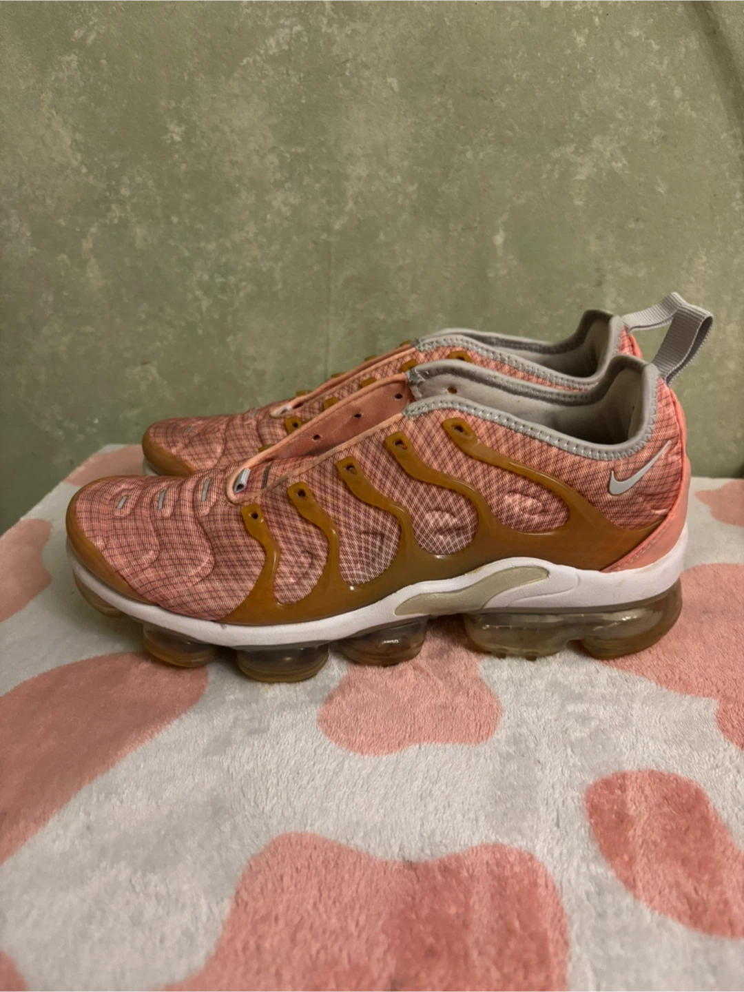 These Nike Air VaporMax Plus sneakers come in a stylish pink and tan colorway. They feature a comfortable cushioned sole and a breathable mesh upper. Perfect for everyday wear and light athletic activities!