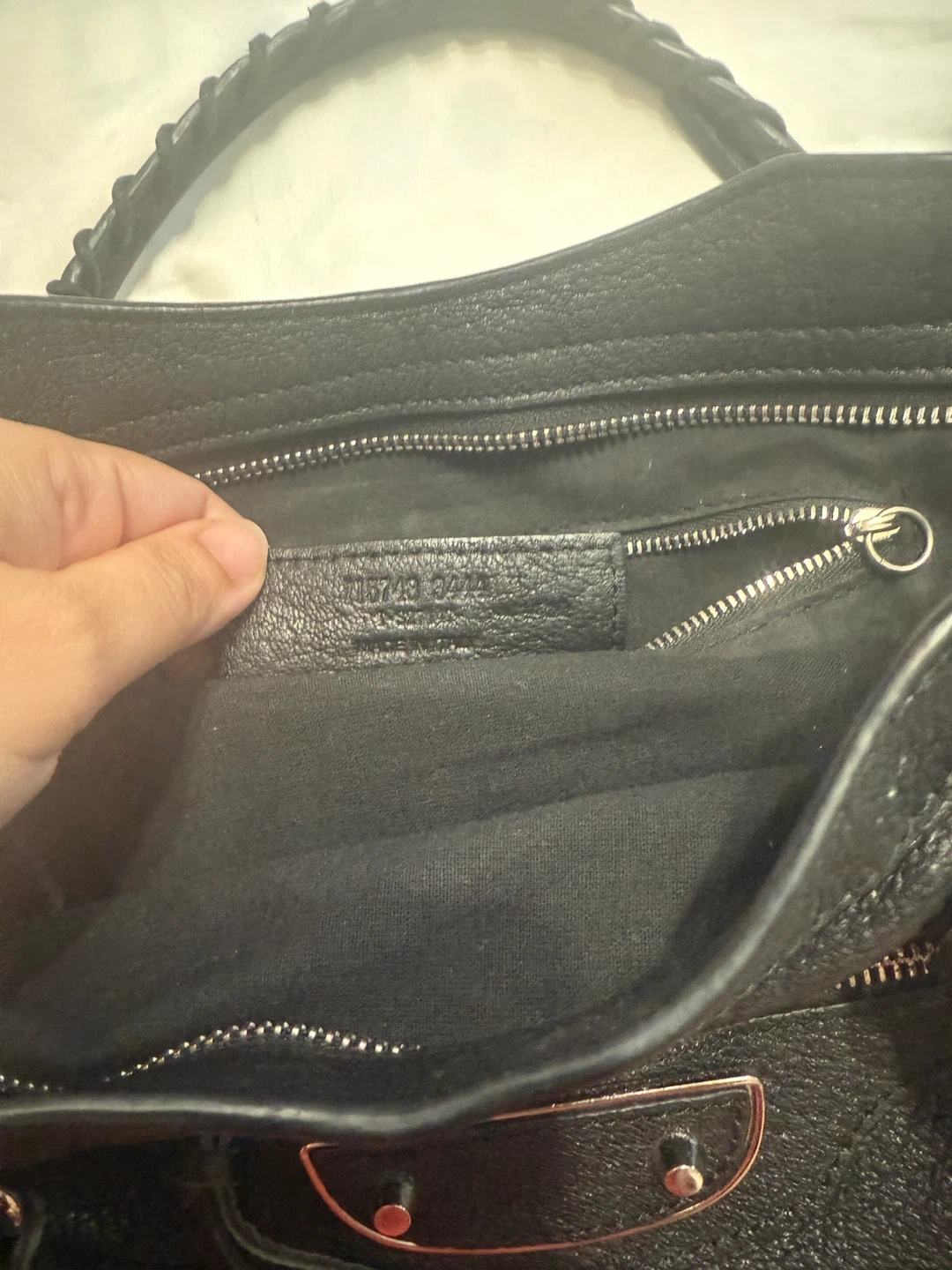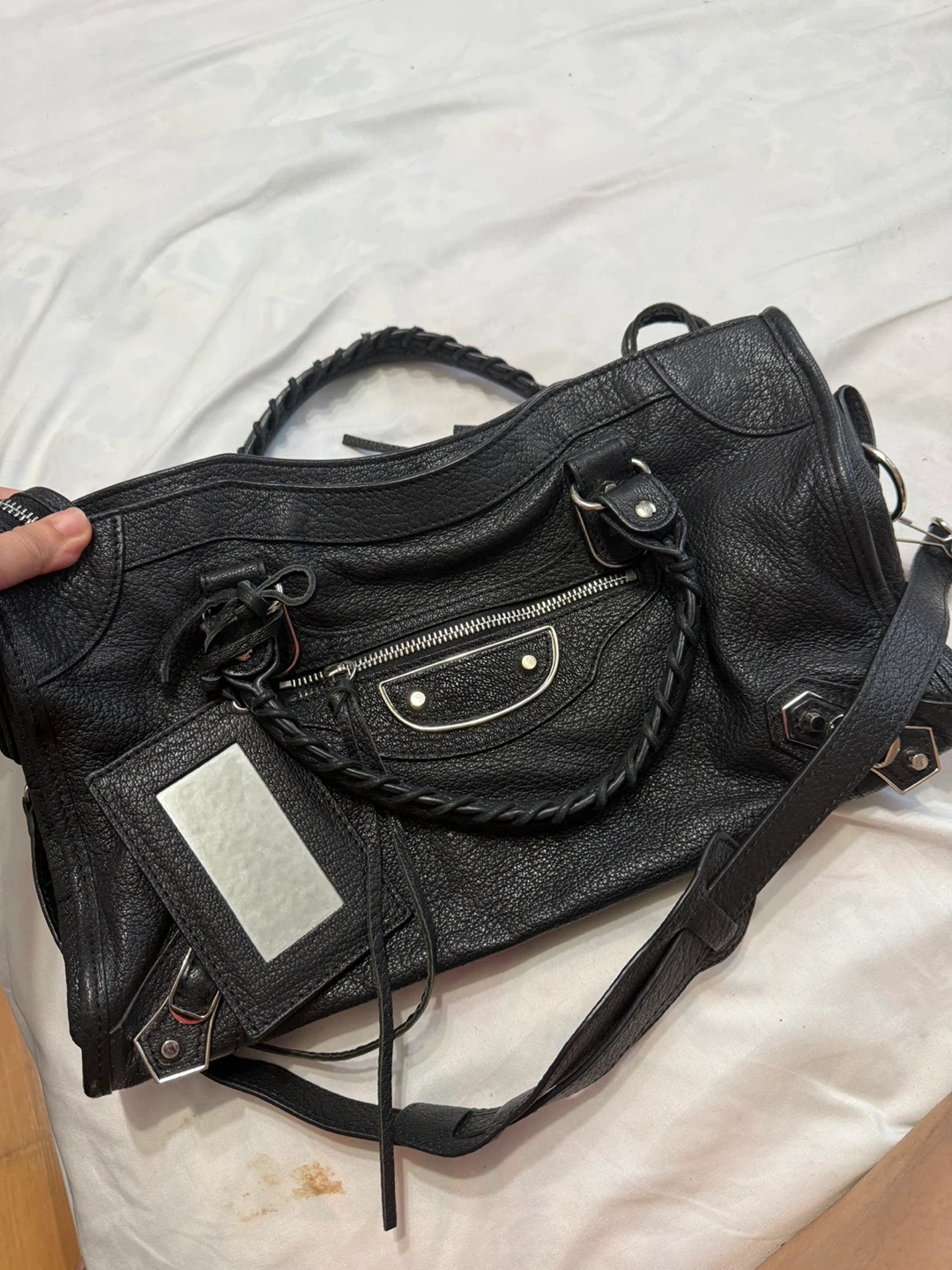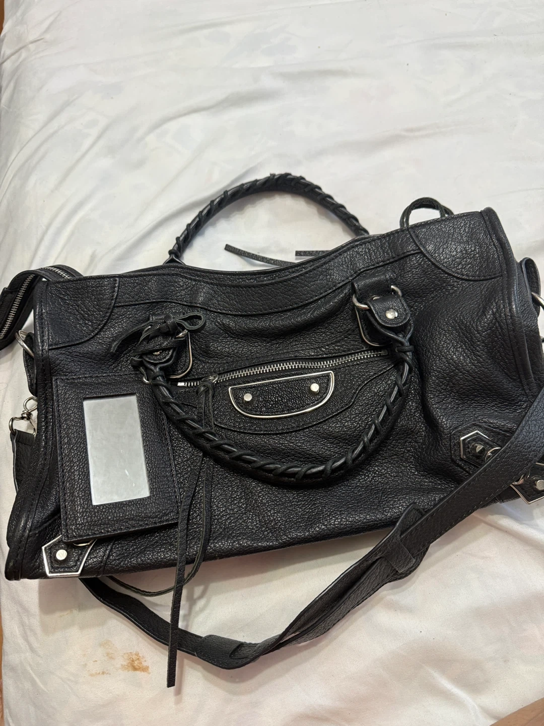 This is a black leather Balenciaga City bag. It features braided handles and a detachable shoulder strap. Interior shows embossed branding and serial number.