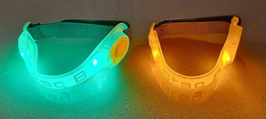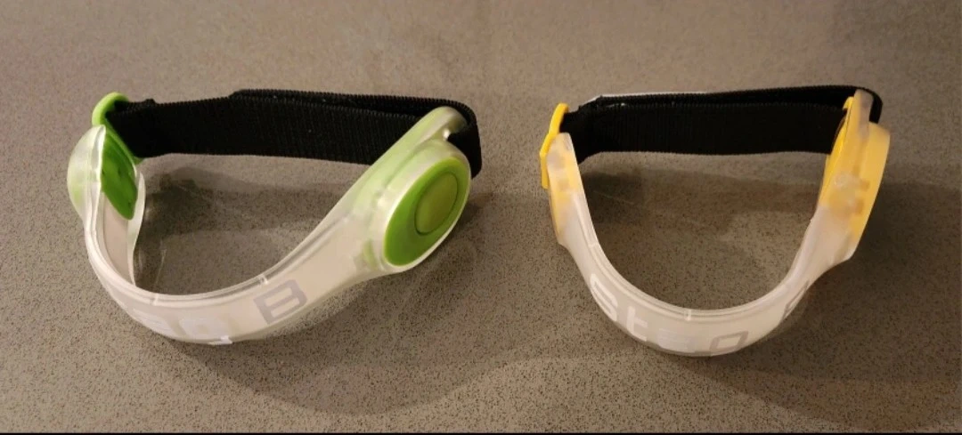 This is a set of two LED armbands, one green and one yellow. They're great for increasing visibility during nighttime activities! Simple adjustable strap for a secure fit.