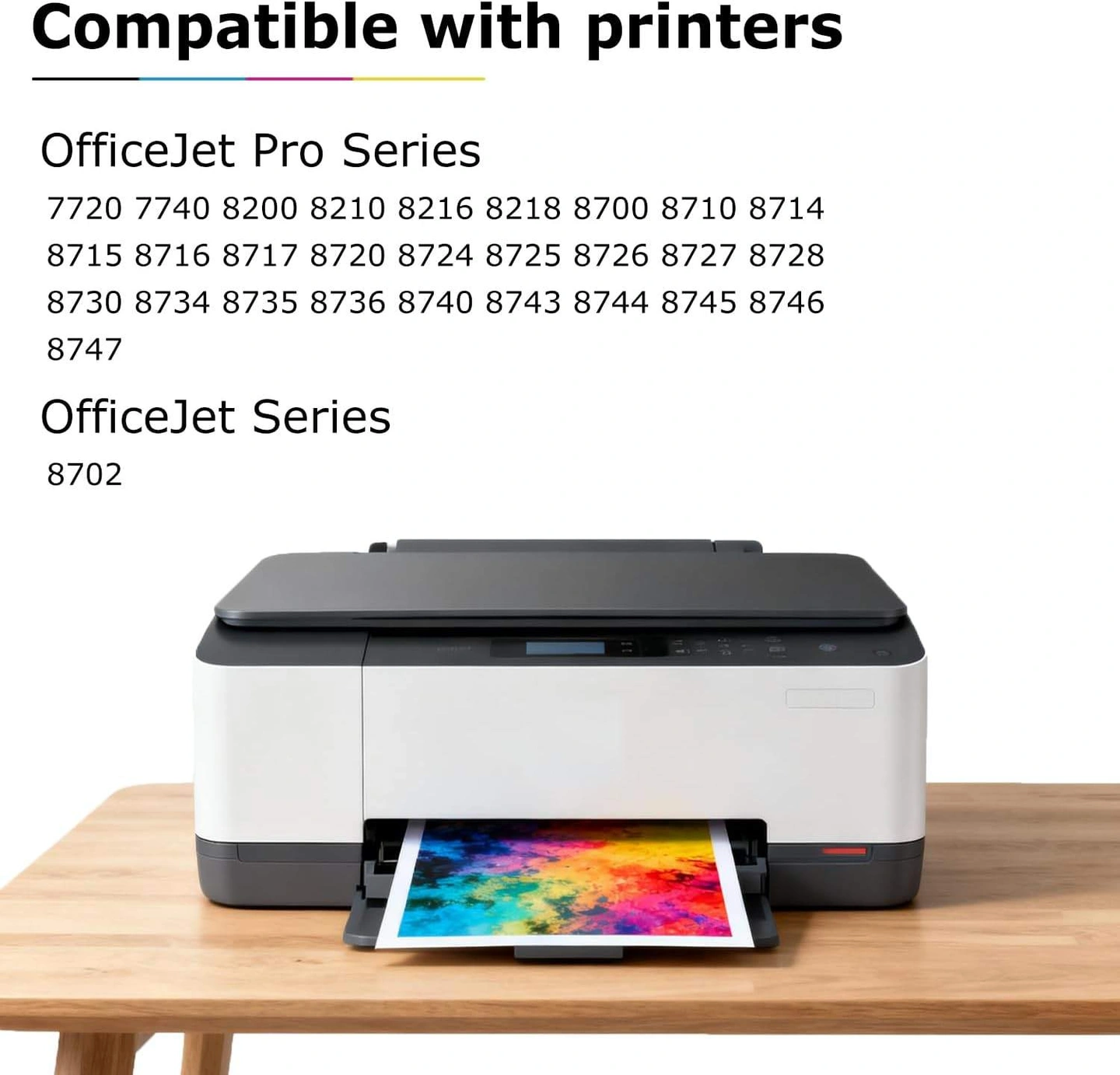 They're compatible with the OfficeJet Pro Series 7720, 7740, 8200, 8210, 8216, 8218, 8700, 8710, 8714, 8715, 8716, 8717, 8720, 8724, 8725, 8726, 8727, 8728, 8730, 8734, 8735, 8736, 8740, 8744, 8745, 8746, 8747 printers and OfficeJet Series 8702 printers. Each black cartridge yields up to 2000 pages, while each color cartridge yields up to 1600 pages.