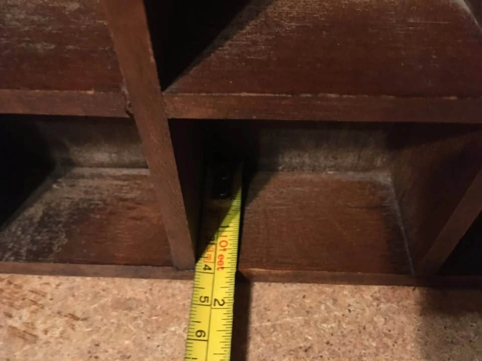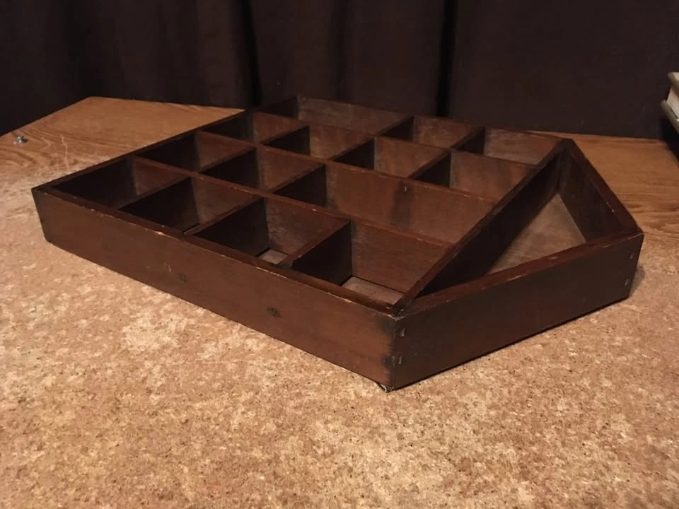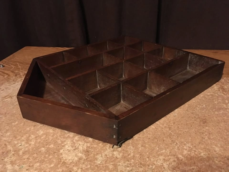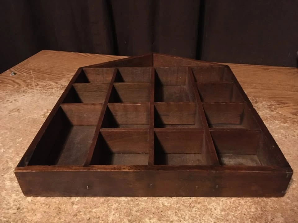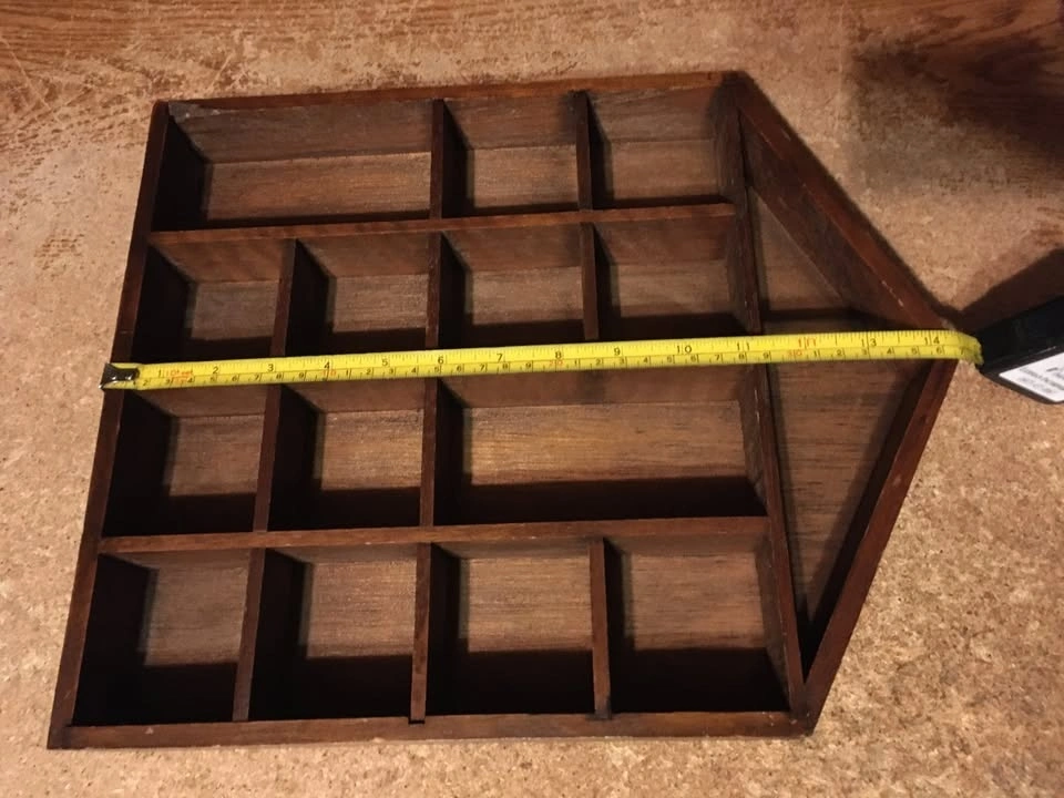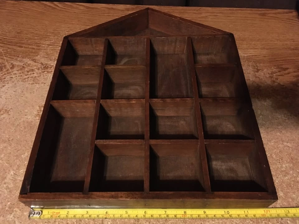 Good condition with 14 slots for miniatures, two of which are double the size of the other twelve. Has two parts on the back for hanging. Shows some wear. Weighs just under 24 ounces.
