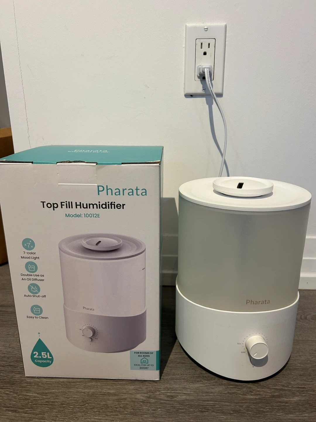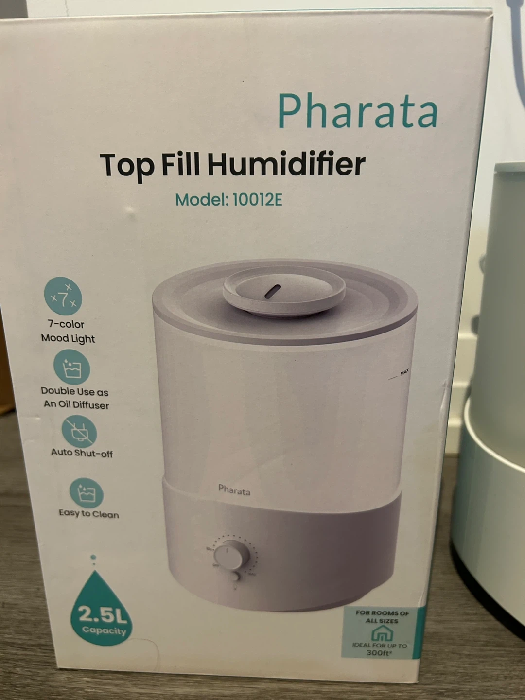 This Pharata Top Fill Humidifier has a 2.5L capacity and a max mist output of 180ml/h. It features a 7-color mood light and can also be used as an oil diffuser. Suitable for rooms up to 300 sq ft, it includes an auto shut-off function.