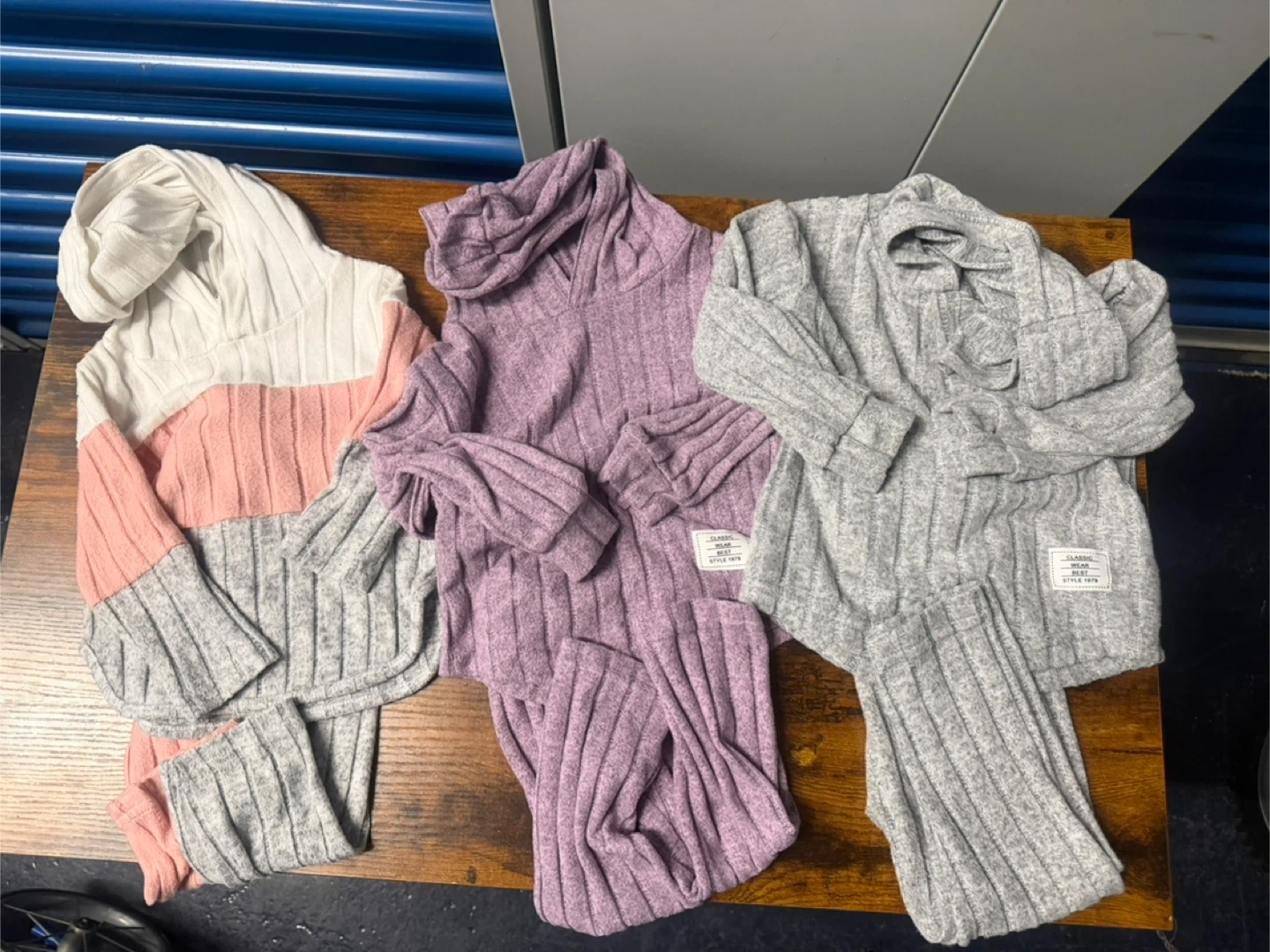Three comfortable ribbed loungewear sets. Each set includes a long-sleeve top and matching pants. One set features a color-block design with white, pink, and gray. The other two sets are solid lavender and gray. Made from a soft, stretchy knit fabric. All 3 sets for $10.