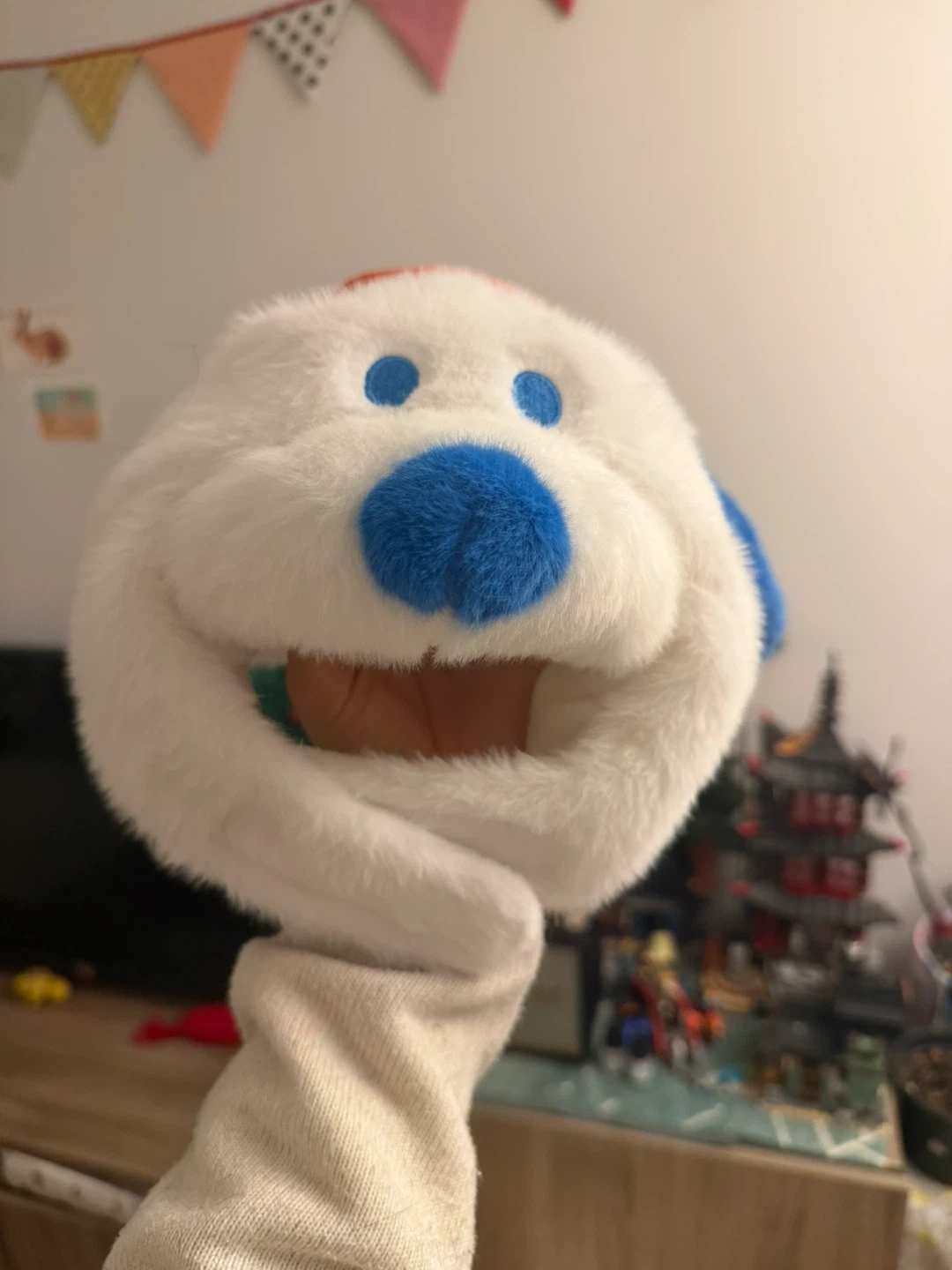 This adorable Penuts pet hat features a white plush design with blue accents and an orange tuft. Keep your furry friend stylish and warm!