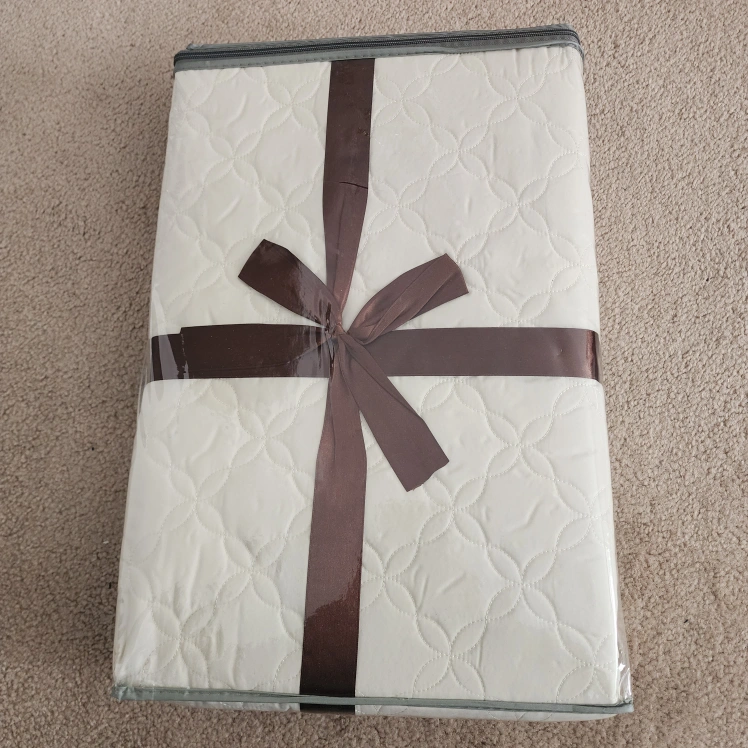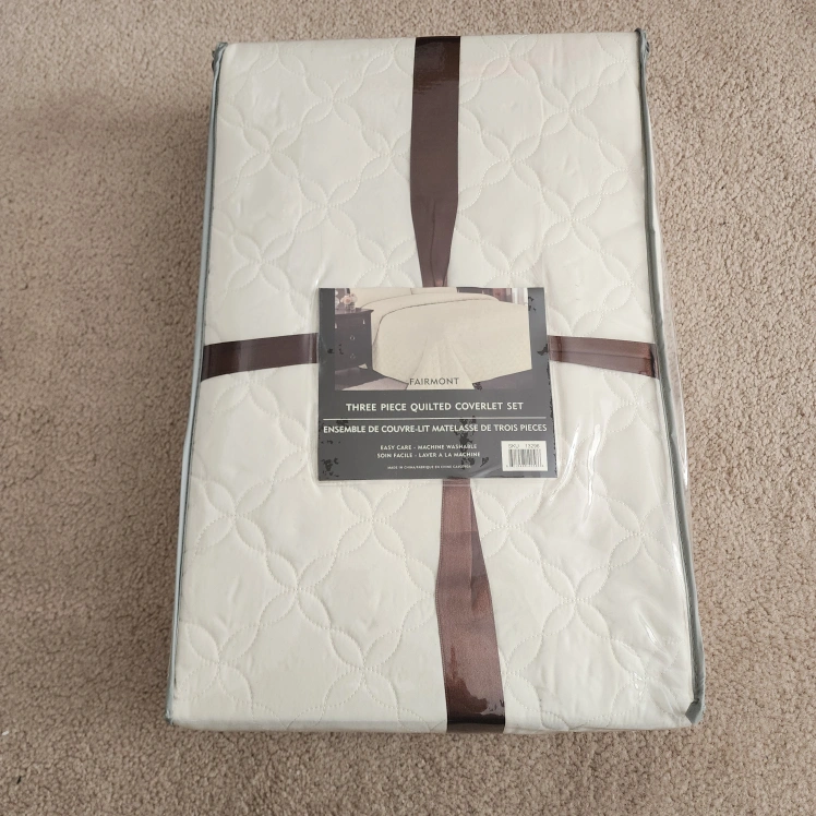 Brand new, three-piece quilted coverlet set. Off-white colour, easy care, machine washable. Comes in a plastic storage bag with a brown ribbon.