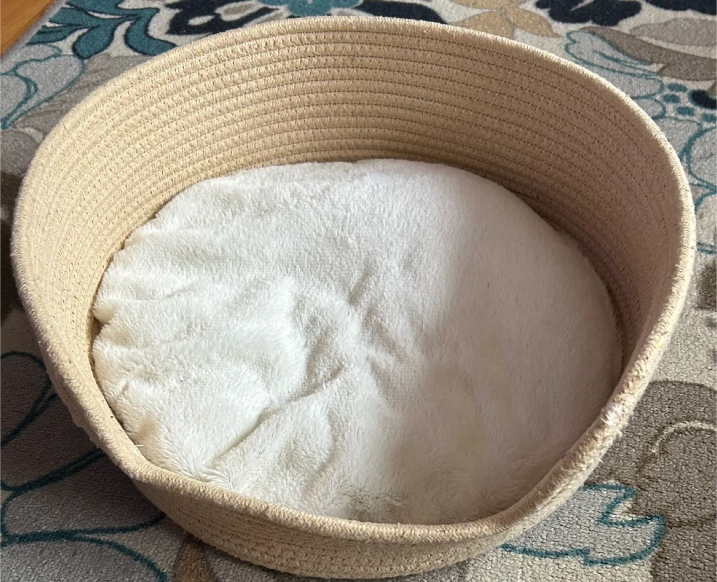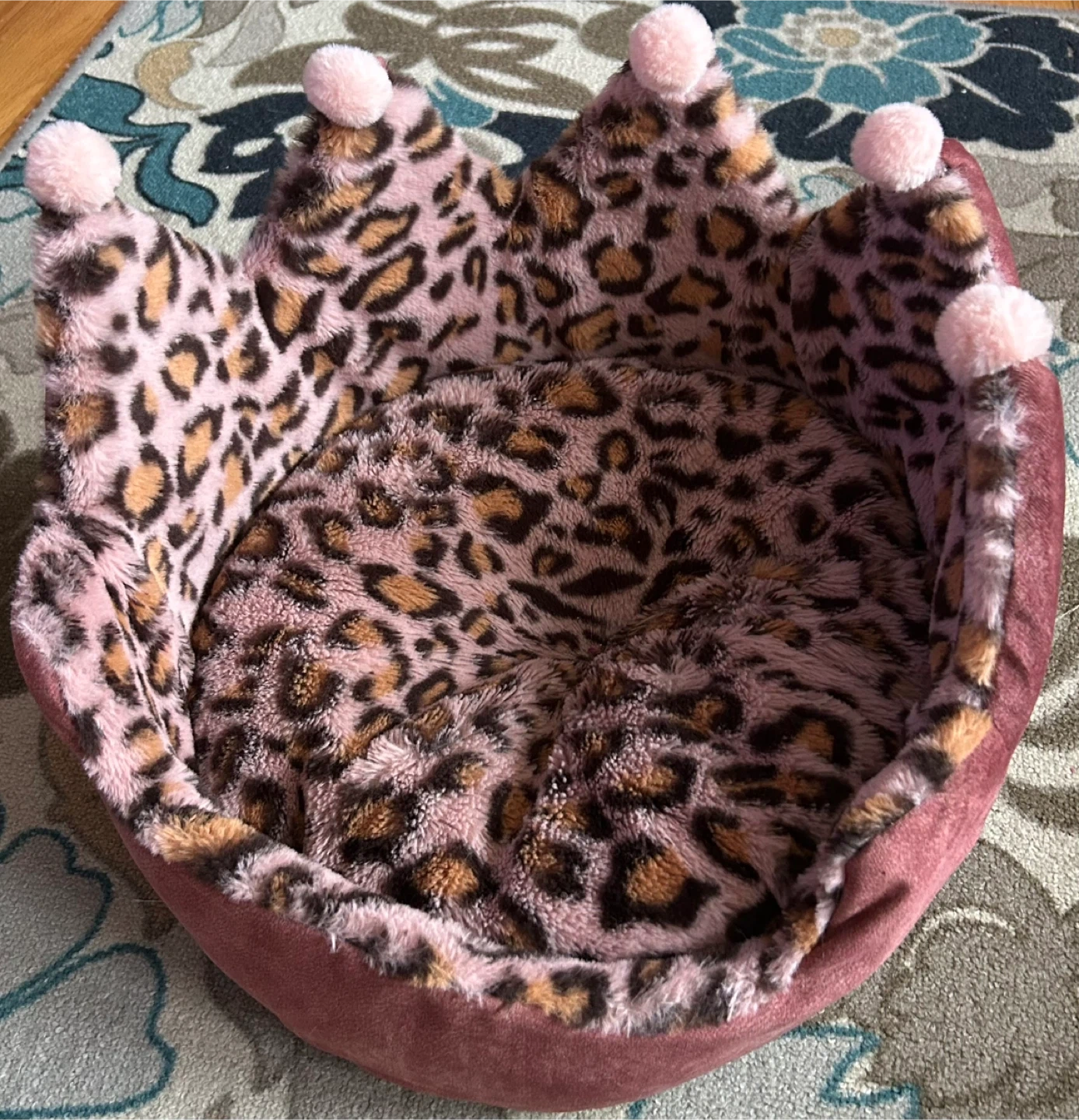 This adorable gently used (barely used )pet bed is shaped like a crown with a fun leopard print interior and soft pink pom-poms! It's made with plush, cozy material for your furry friend's comfort. The exterior is a dusty rose velvet-like fabric. Comes with a separate, circular woven basket bed with a white fluffy cushion. Perfect for small dogs or cats!