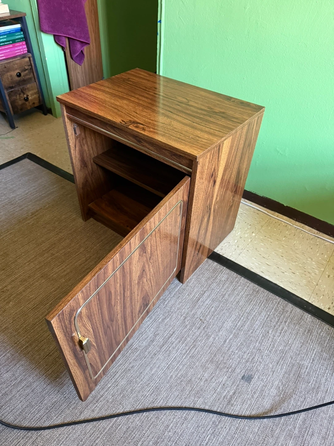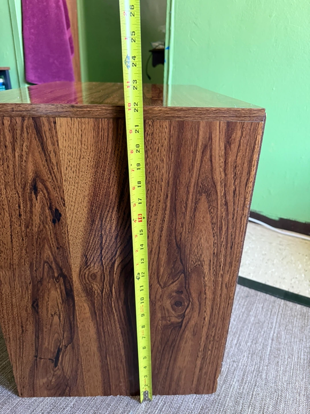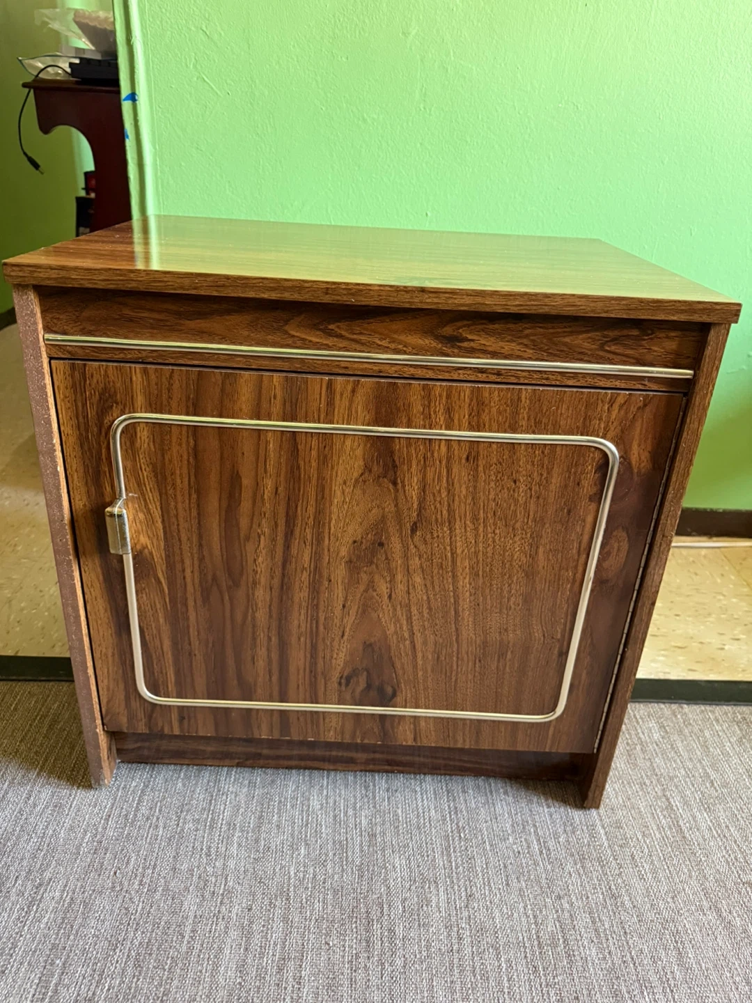 This is a small side table with a wood-grain finish and a cabinet door. It has two interior shelves. Dimensions: Approximately 18 inches high, 16 inches wide. Very good condition brand new and it has been cleaned very well.