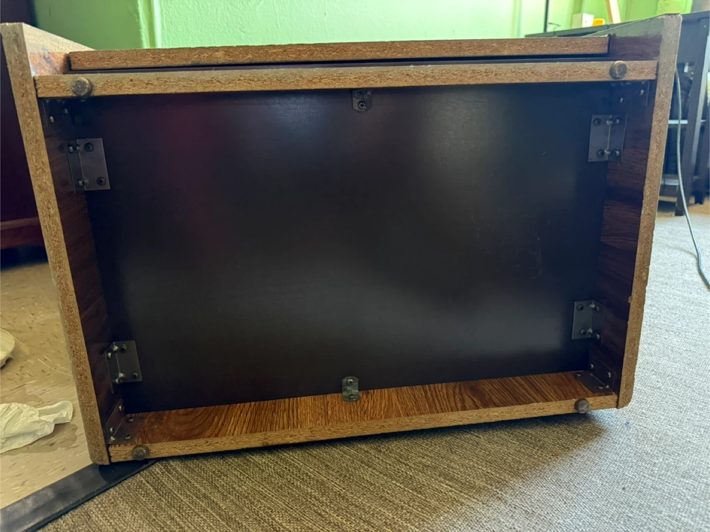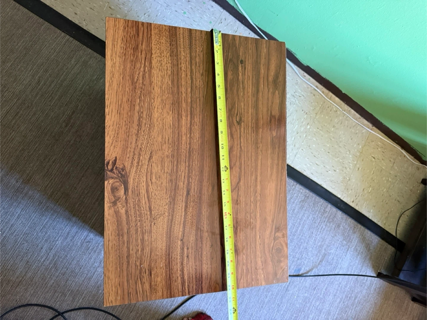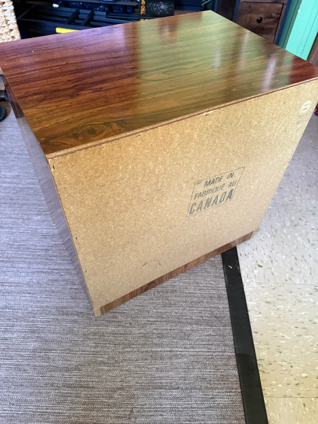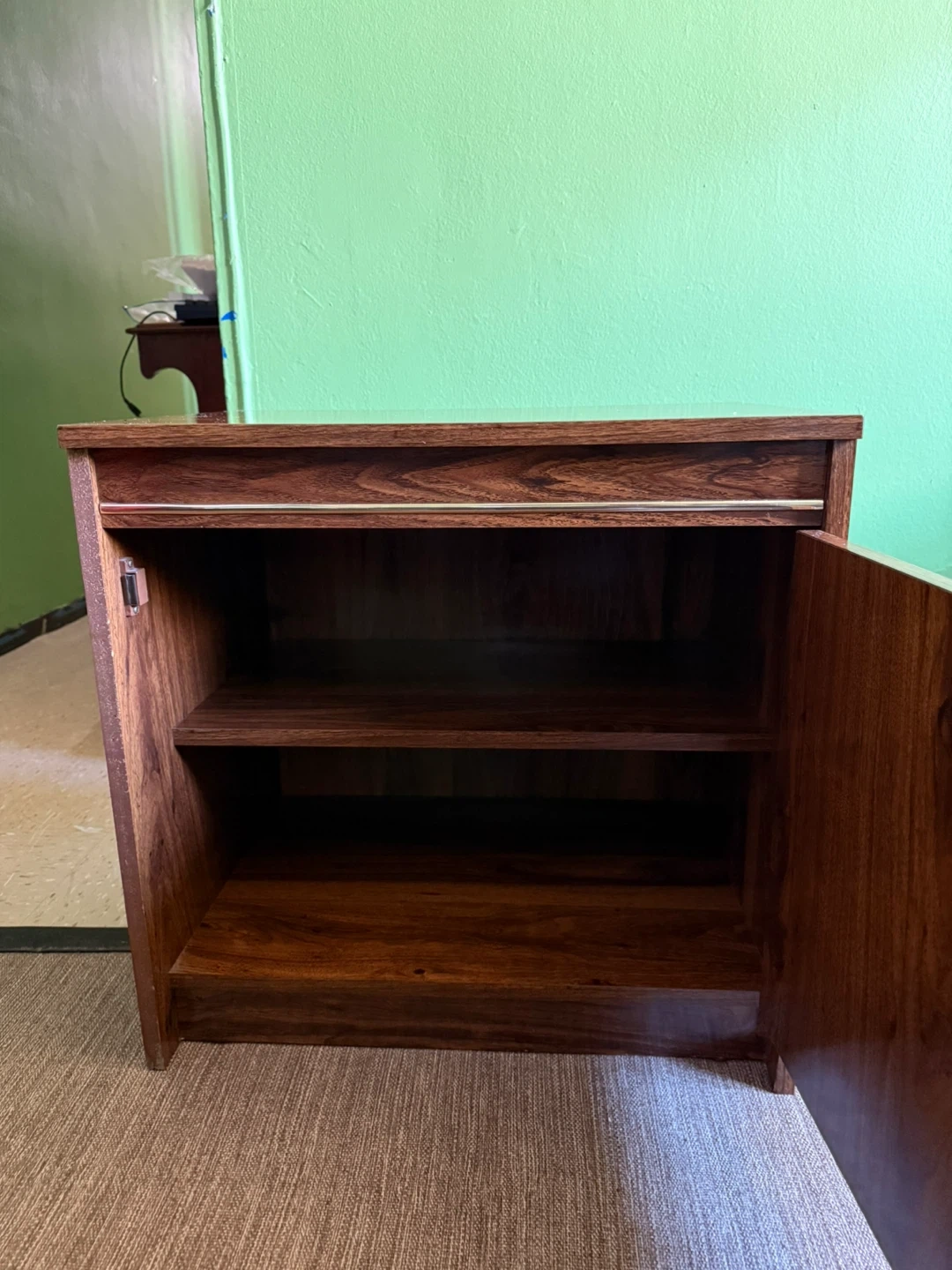 This is a small side table with a wood-grain finish and a cabinet door. It has two interior shelves. Dimensions: Approximately 18 inches high, 16 inches wide. Very good condition brand new and it has been cleaned very well.