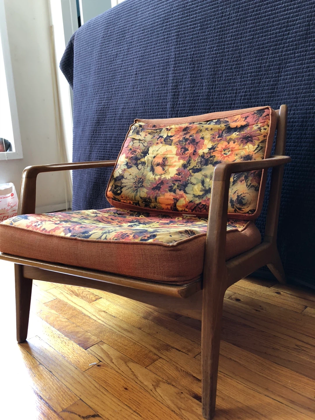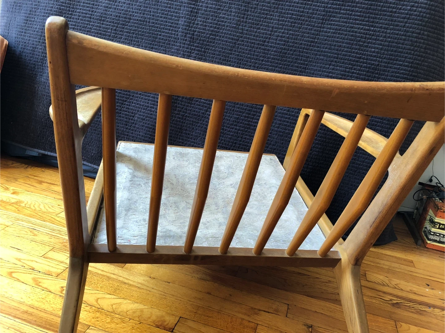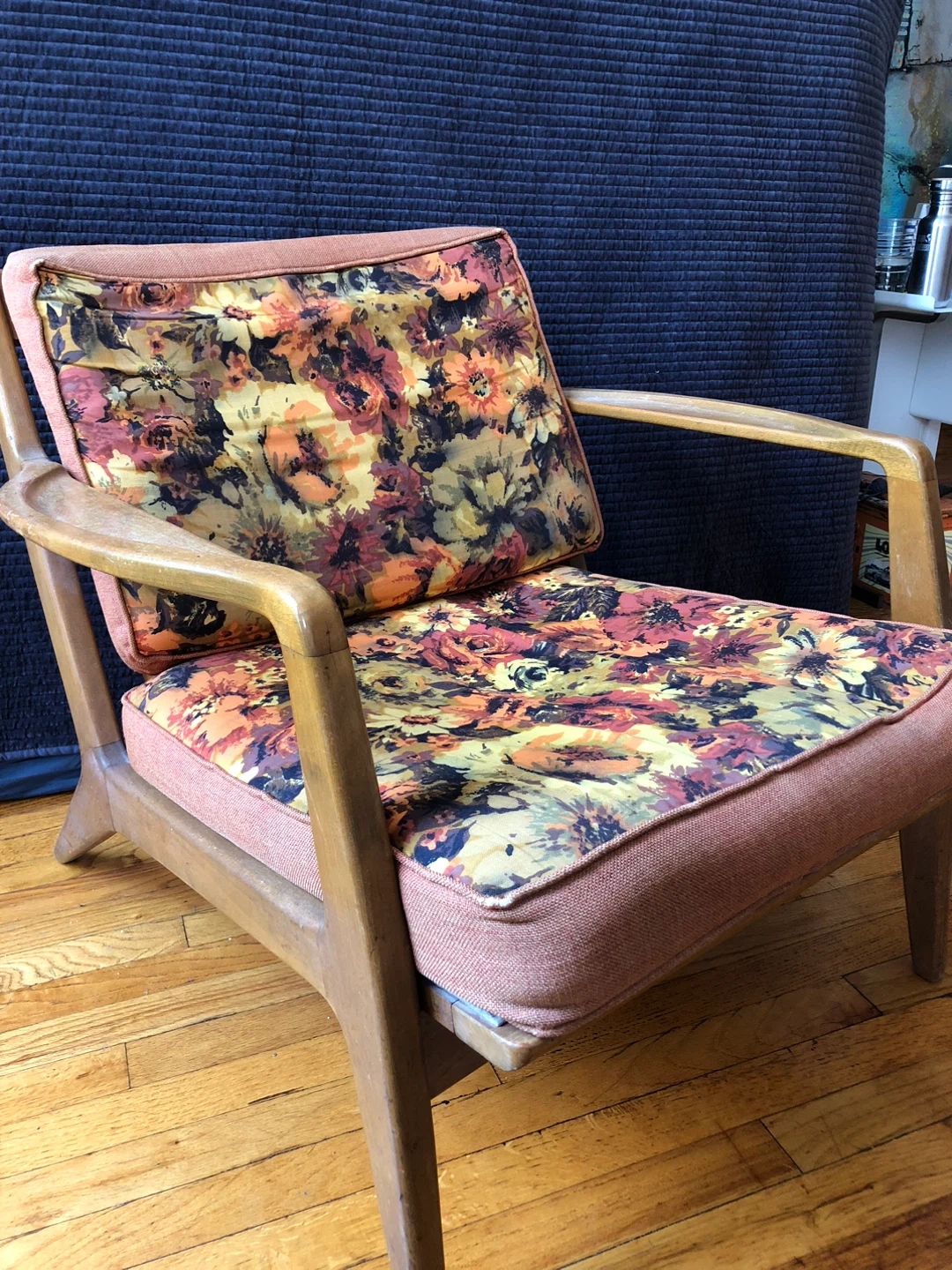 Mid-century modern chair with hardwood frame. Authentic vintage item; shows some wear to the finish as might be expected but nothing egregious. Cushions are a bit flat but you can always replace the foam rubber. Pick on Central Park North.