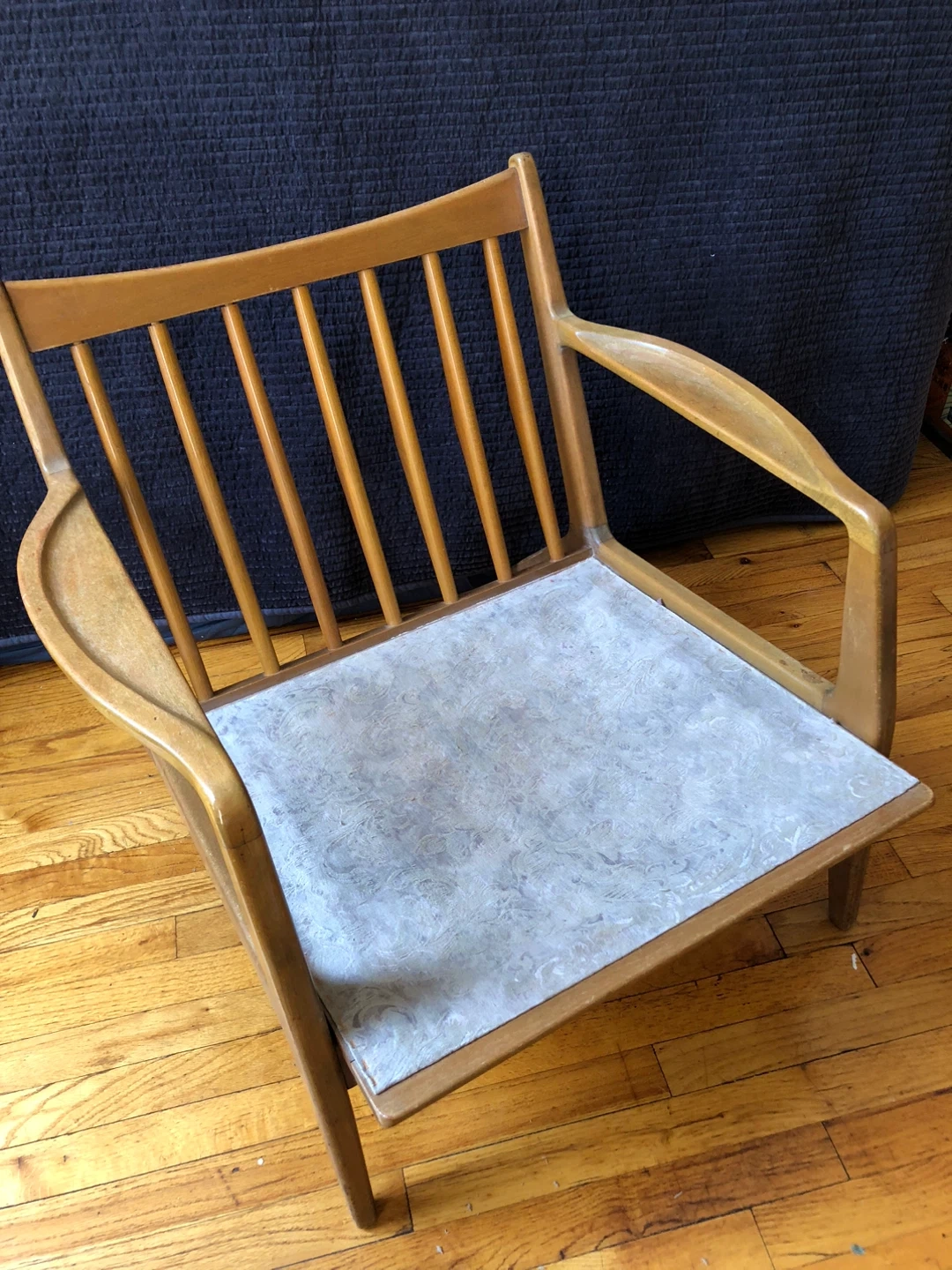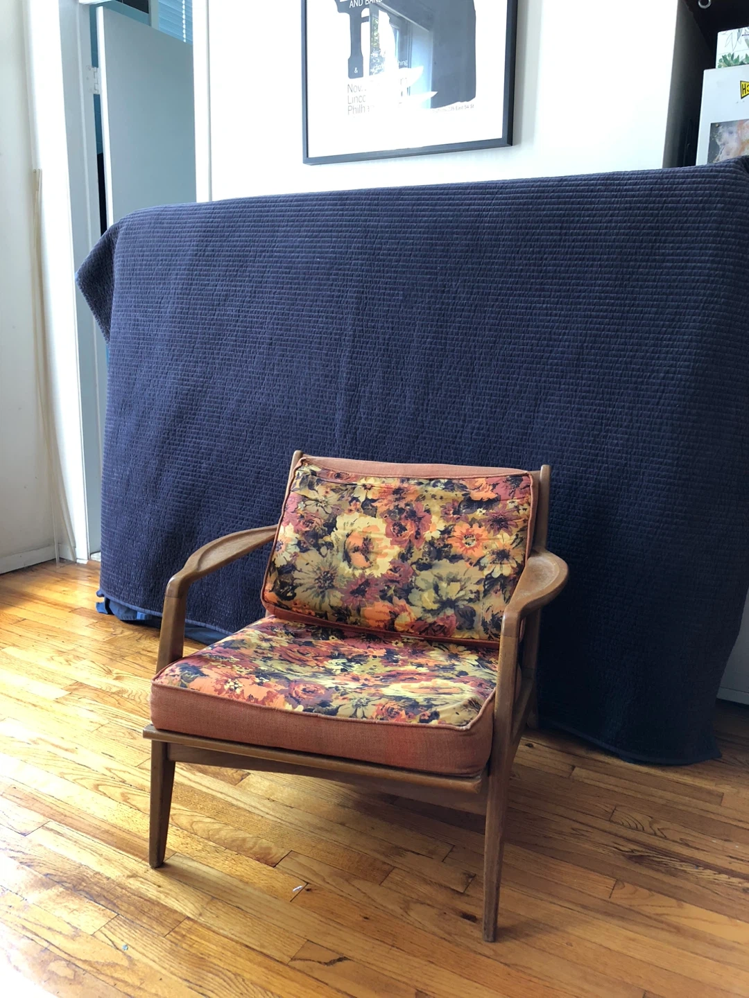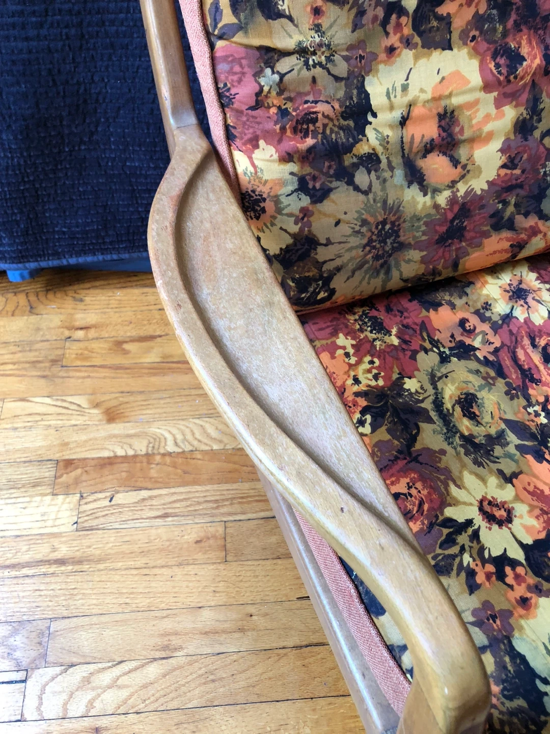 Mid-century modern chair with hardwood frame. Authentic vintage item; shows some wear to the finish as might be expected but nothing egregious. Cushions are a bit flat but you can always replace the foam rubber. Pick on Central Park North.