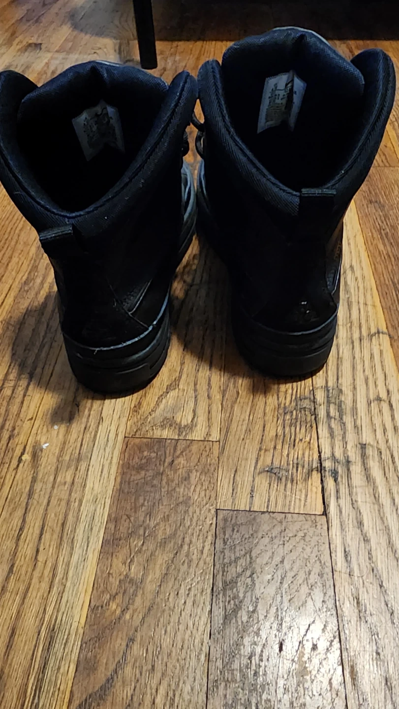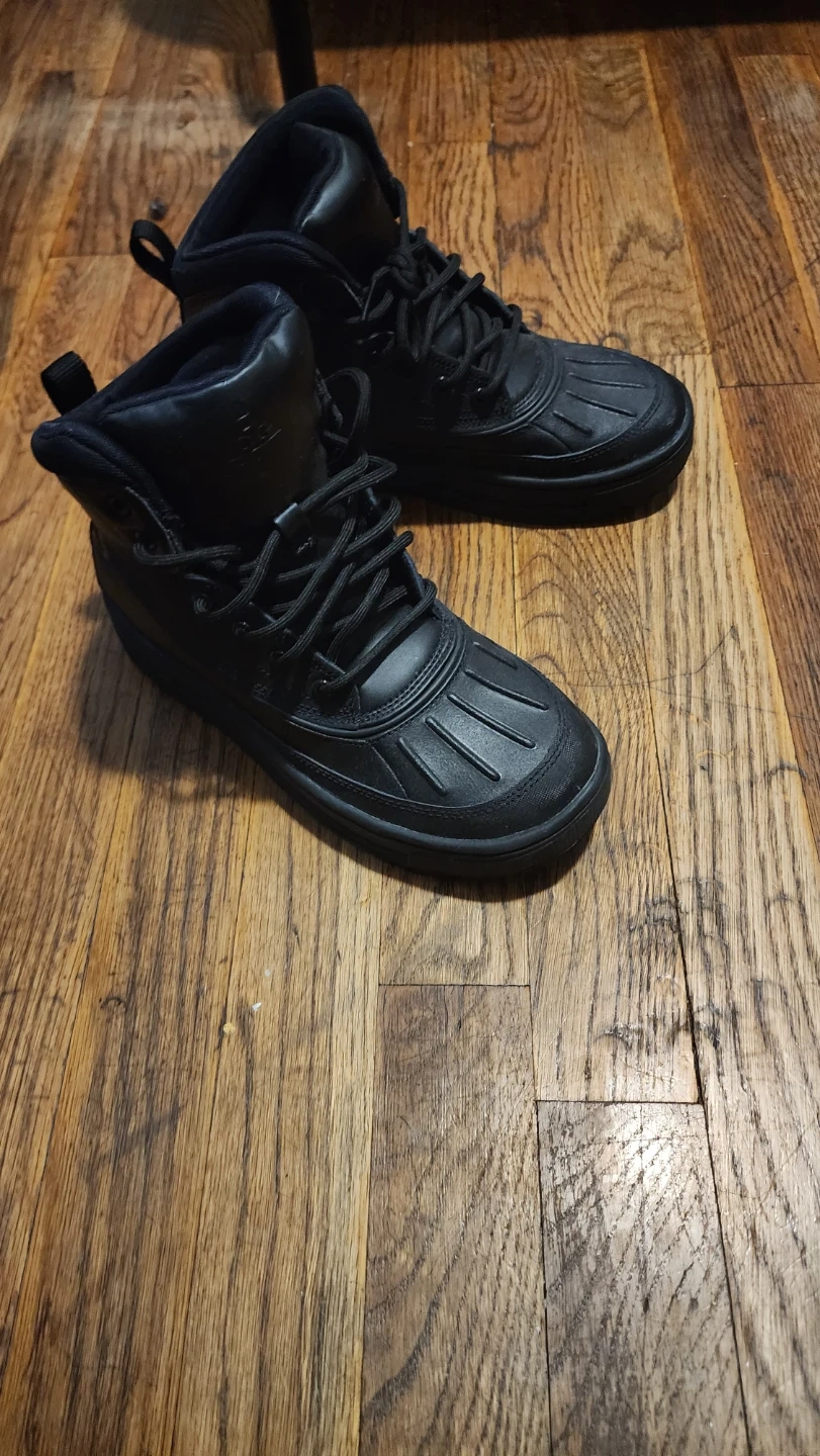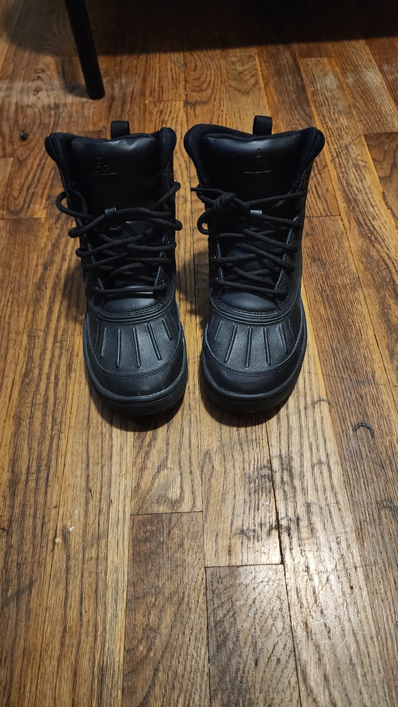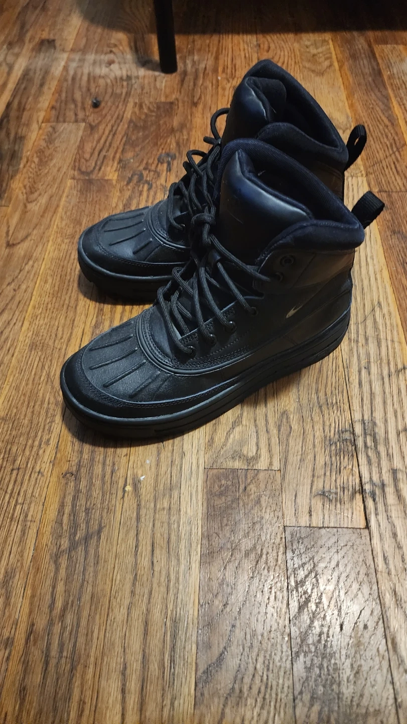 These are black Nike high top boots. They're constructed with durable materials for tough wear. The non-marking sole provides good traction. They're great for outdoor activities and hardly worn.