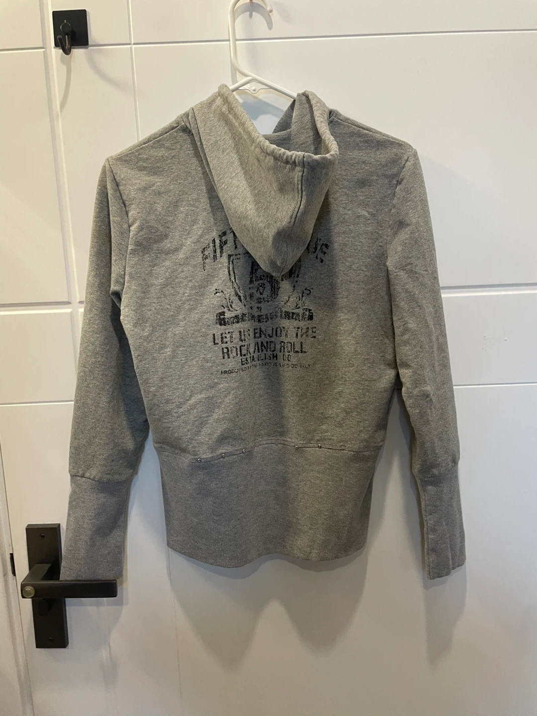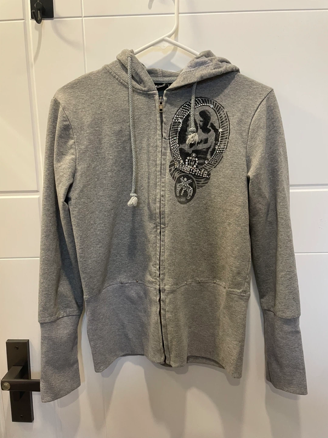 Selling a zip-up hoodie in a size medium! It's a comfy grey colour and features a unique design on the front and back. Perfect for adding a bit of edge to your casual outfits