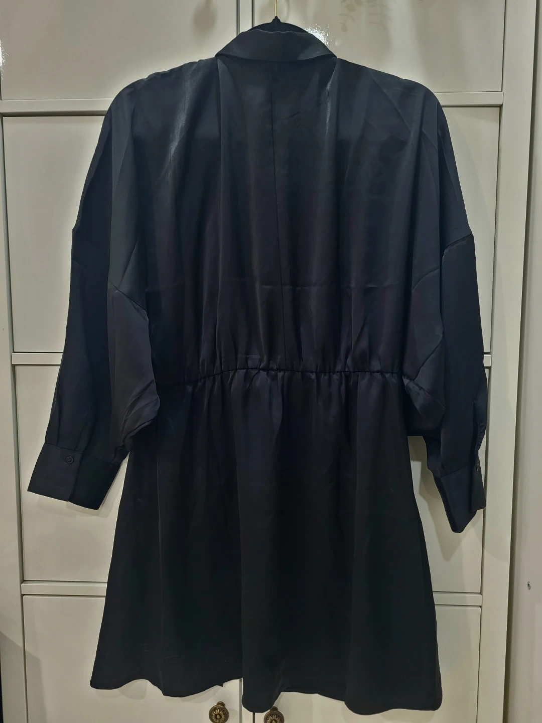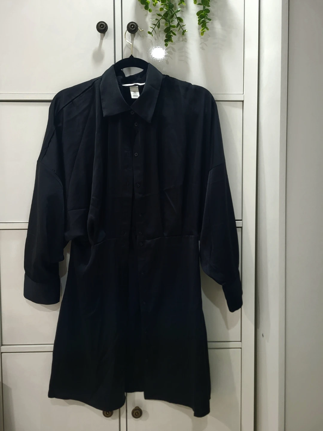 This H&M black shirt dress is versatile and can be worn either on its own, with tights, or with leggings.The dress features a button-down front and a cinched elastic waistband for a flattering fit.It's a size medium. Worn once.