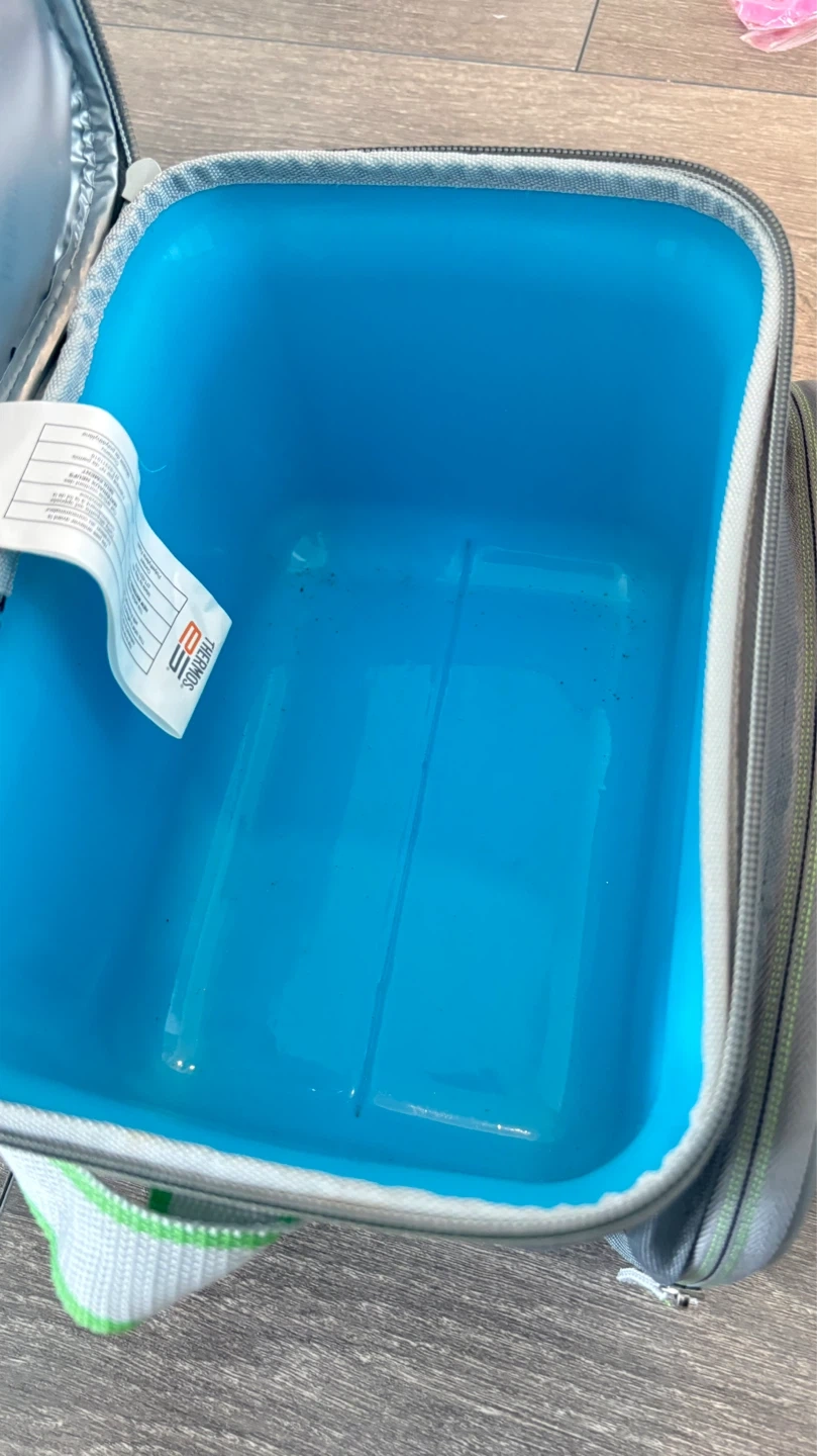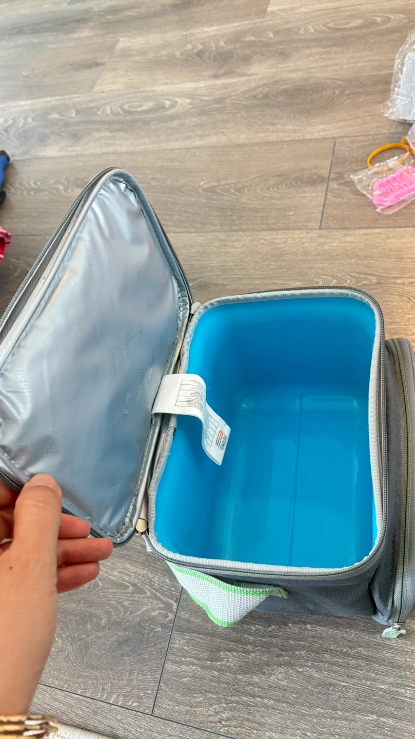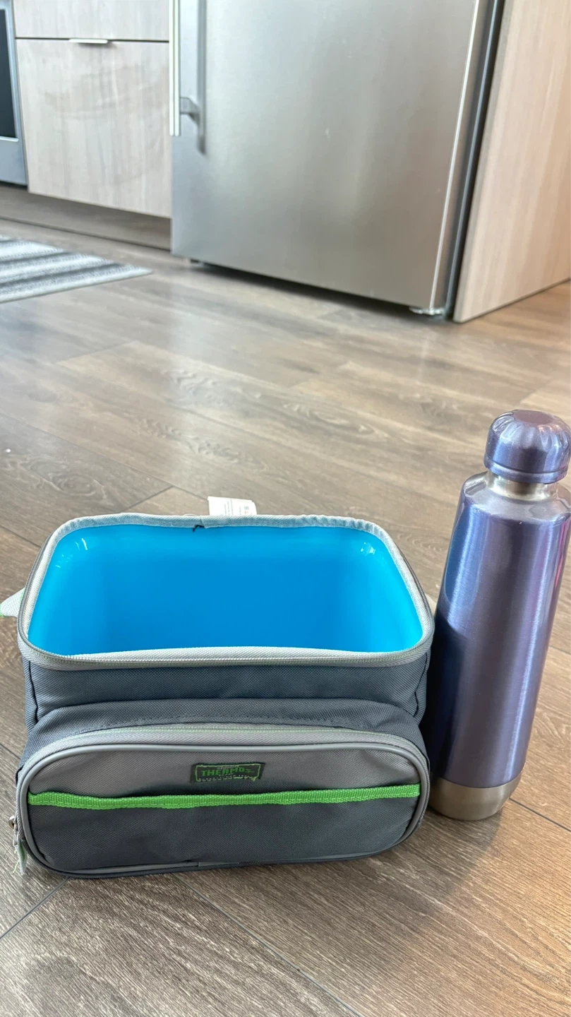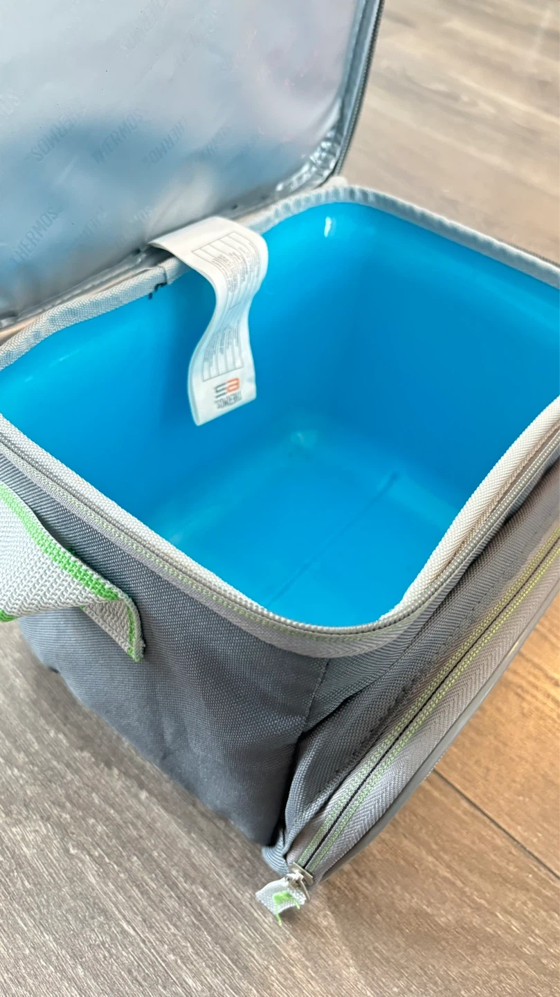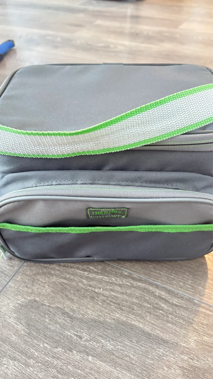 This is a gray and green Thermos lunch bag. It's insulated and has a zippered main compartment and a front pocket. The interior is blue and easy to clean. It's great for keeping lunches cool on the go!