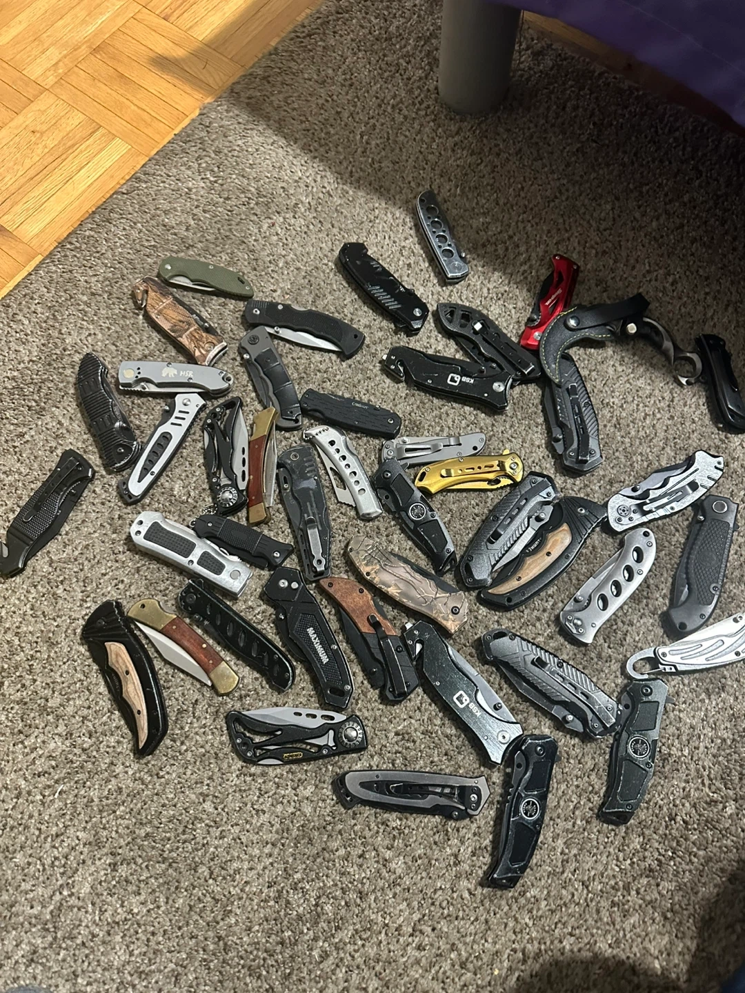 This is a collection of assorted folding pocket knives. Various brands and styles are included. They appear to be made from metal and composite materials.