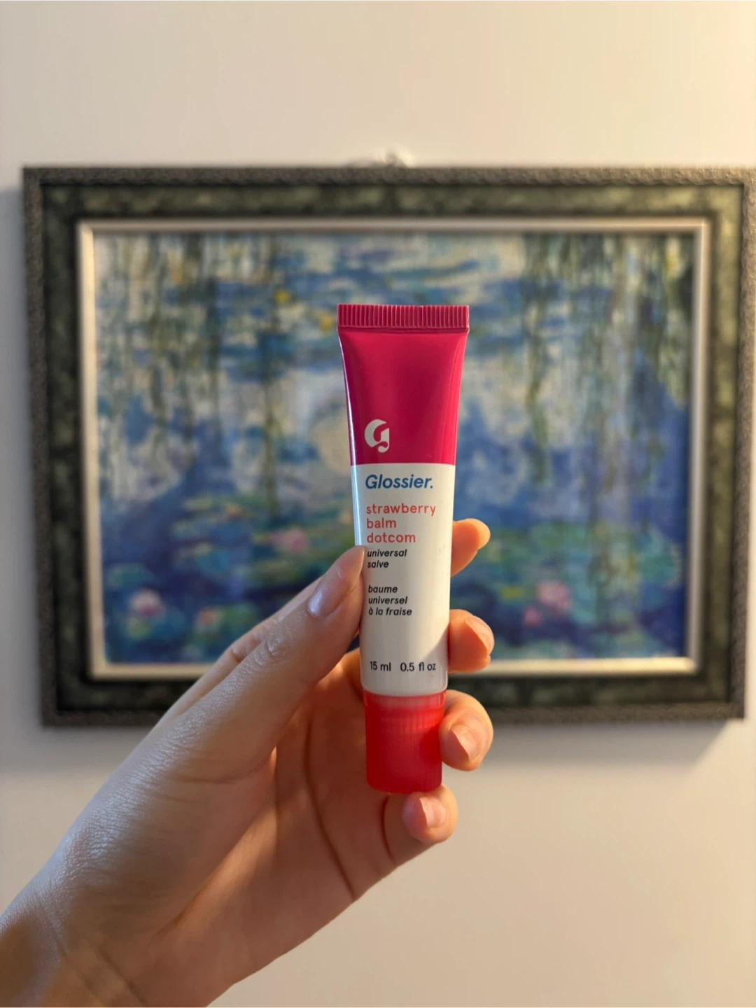 This is the Glossier Balm Dotcom in the Strawberry shade. It's a universal salve for lips and skin. Size is 0.5 oz / 15 mL. Sheer berry red colour with a satin finish.