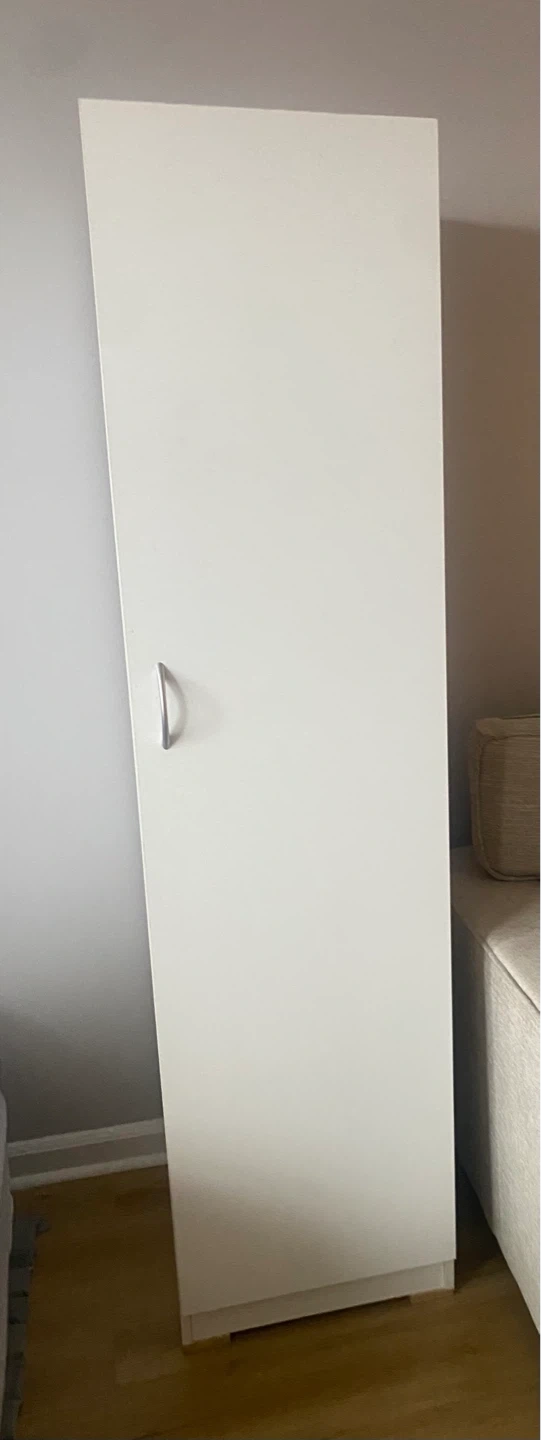 This tall, white storage cabinet offers ample shelving space for organization. It features a single door with a modern silver handle. Perfect for storing books, household items, or linens!