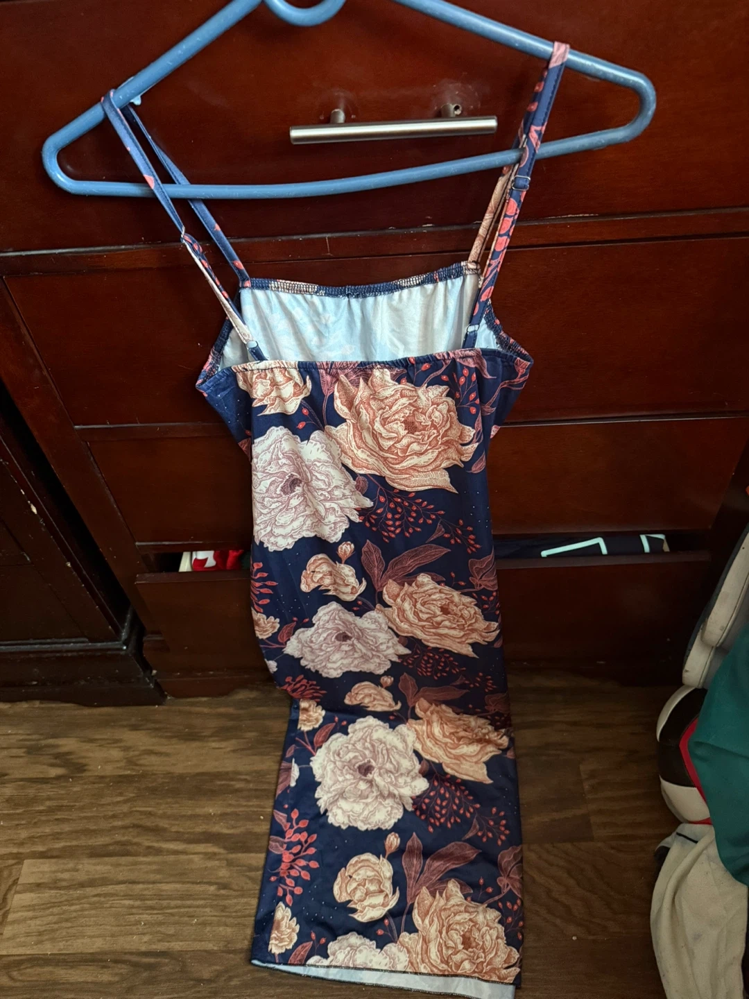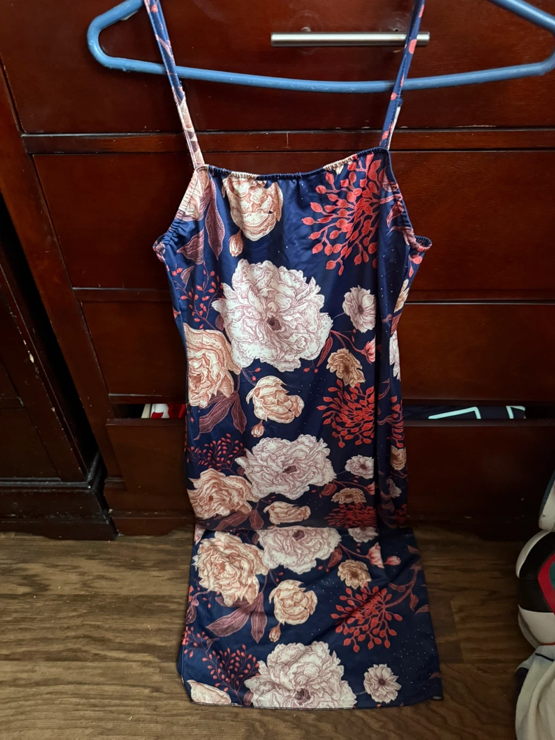 This slip dress features a beautiful floral print. It's made with thin spaghetti straps and a silky material. Great for layering or wearing on its own!