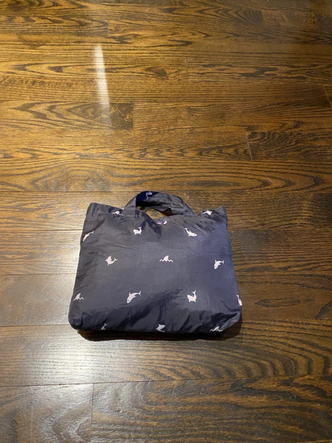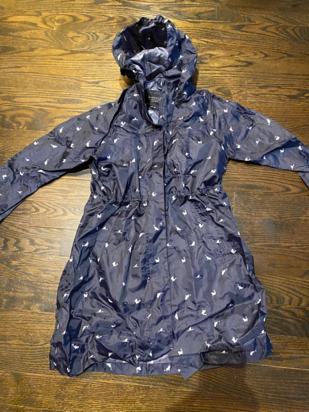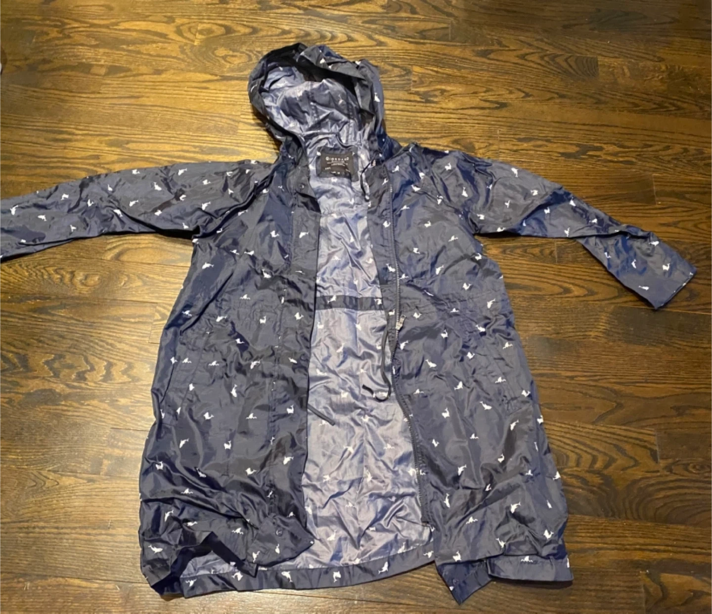 Giodano navy raincoat featuring a cute white whale print all over. It's a hooded, lightweight jacket with a drawstring waist for a flattering fit. It even comes with a matching pouch for easy storage. Great for unpredictable weather days!