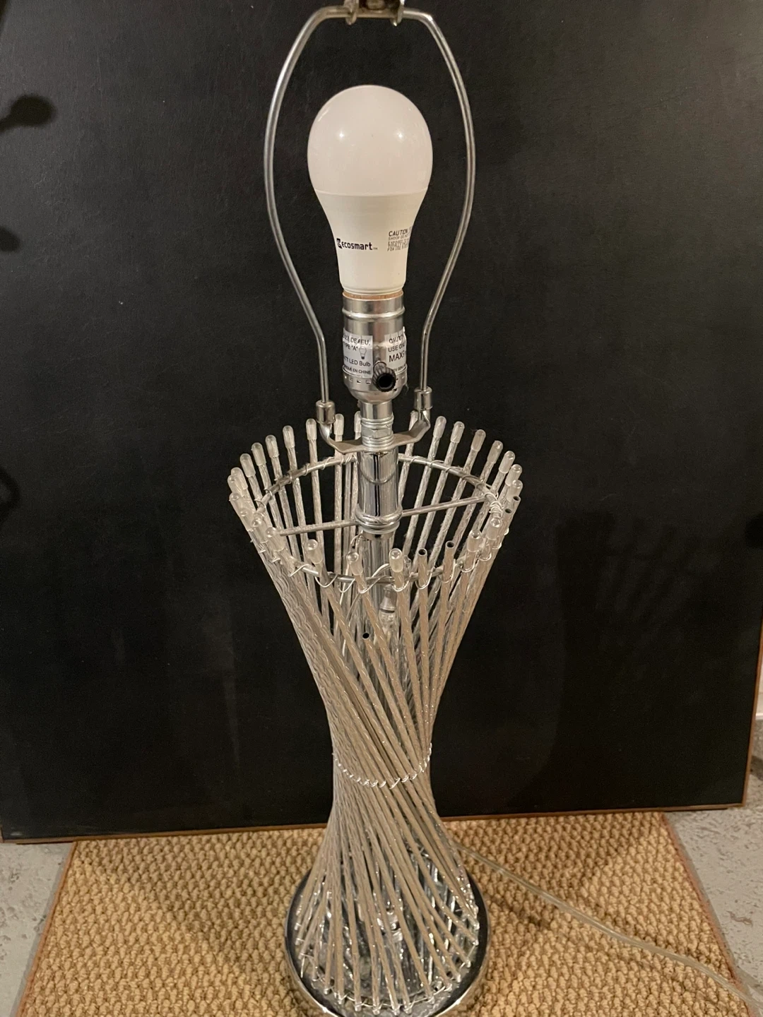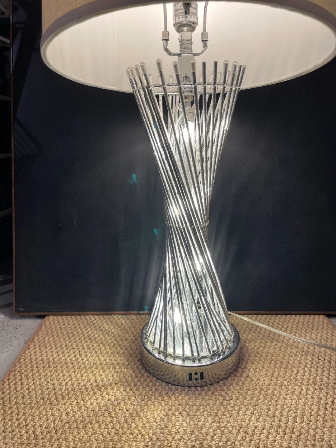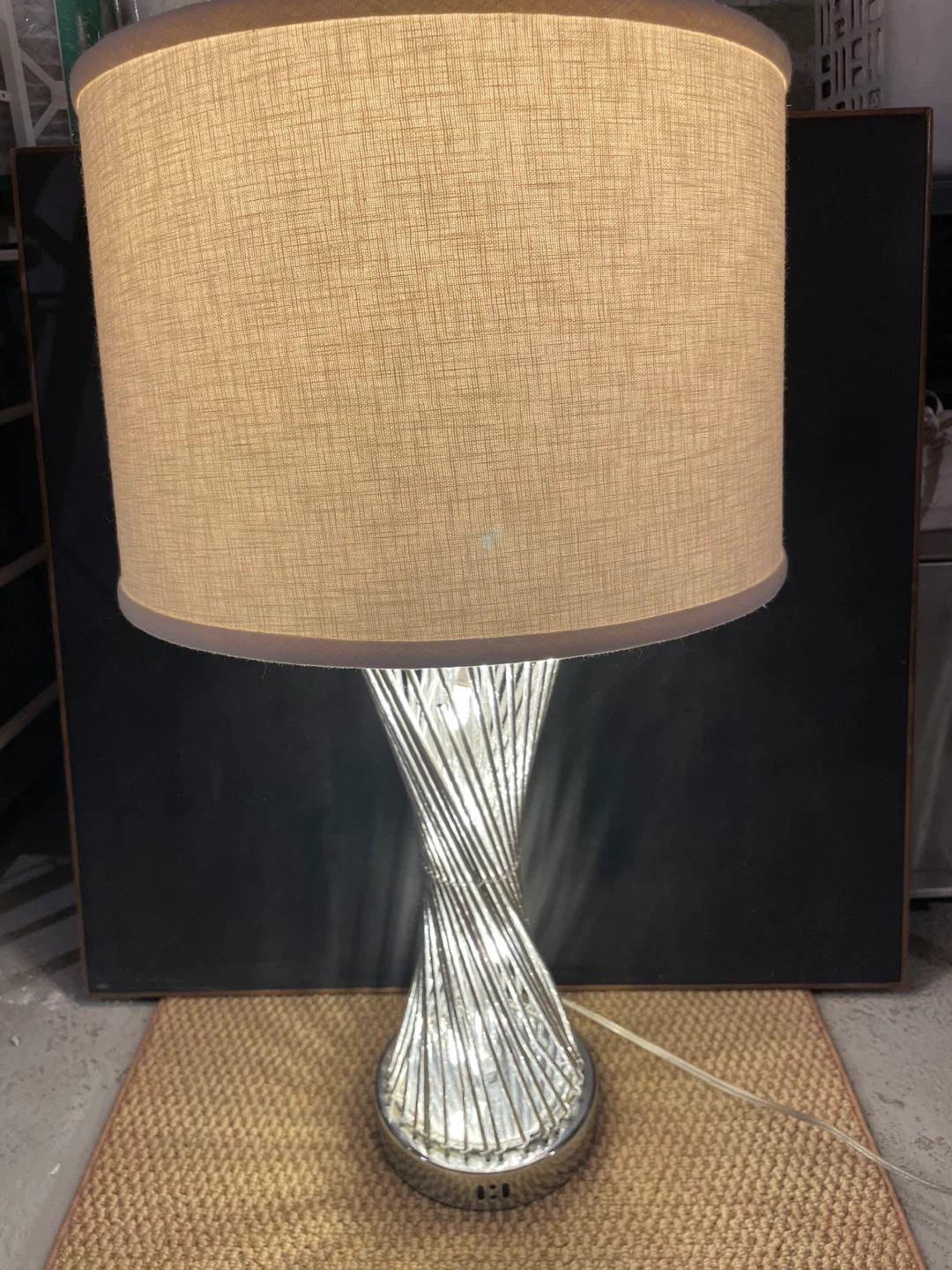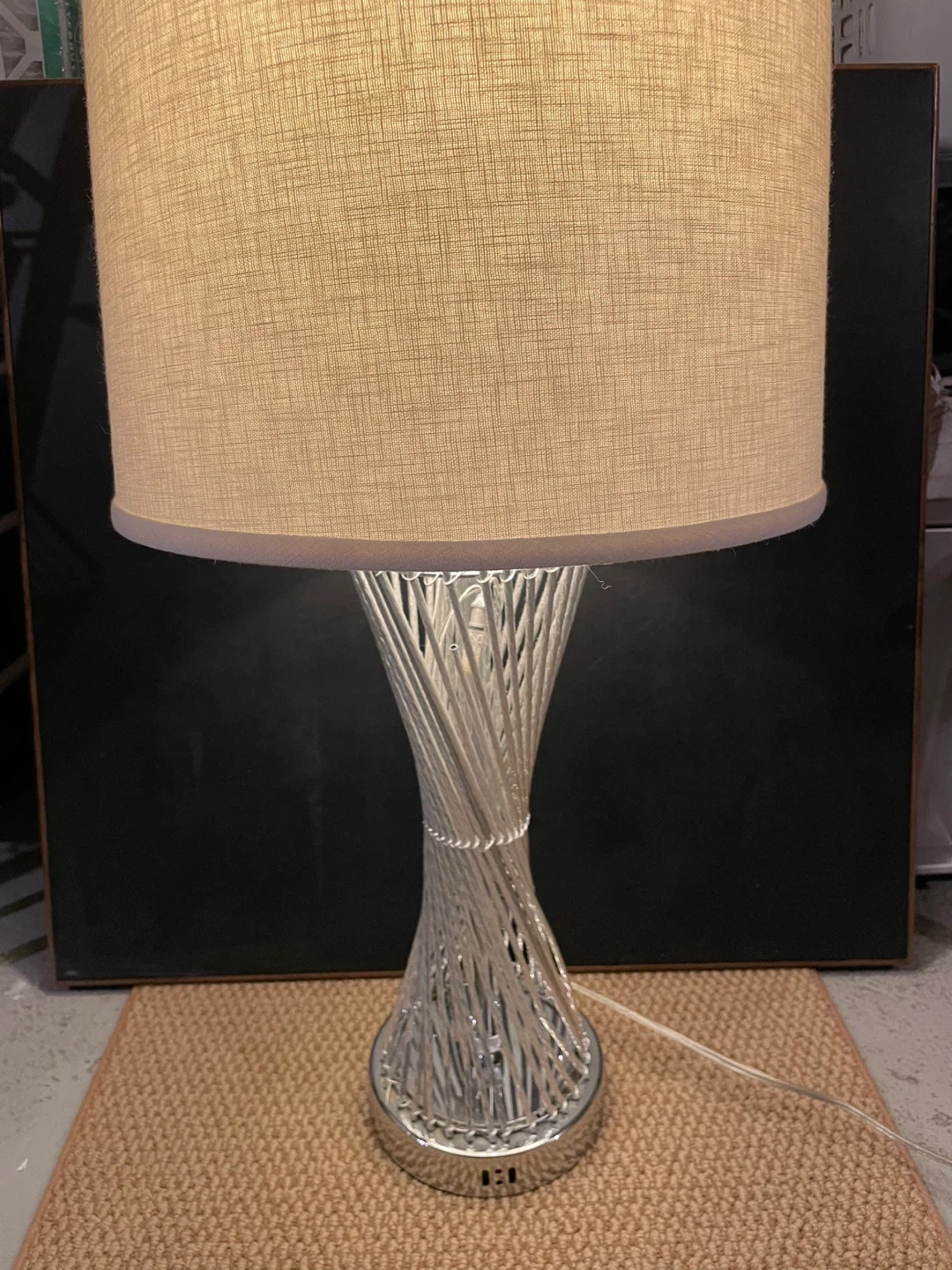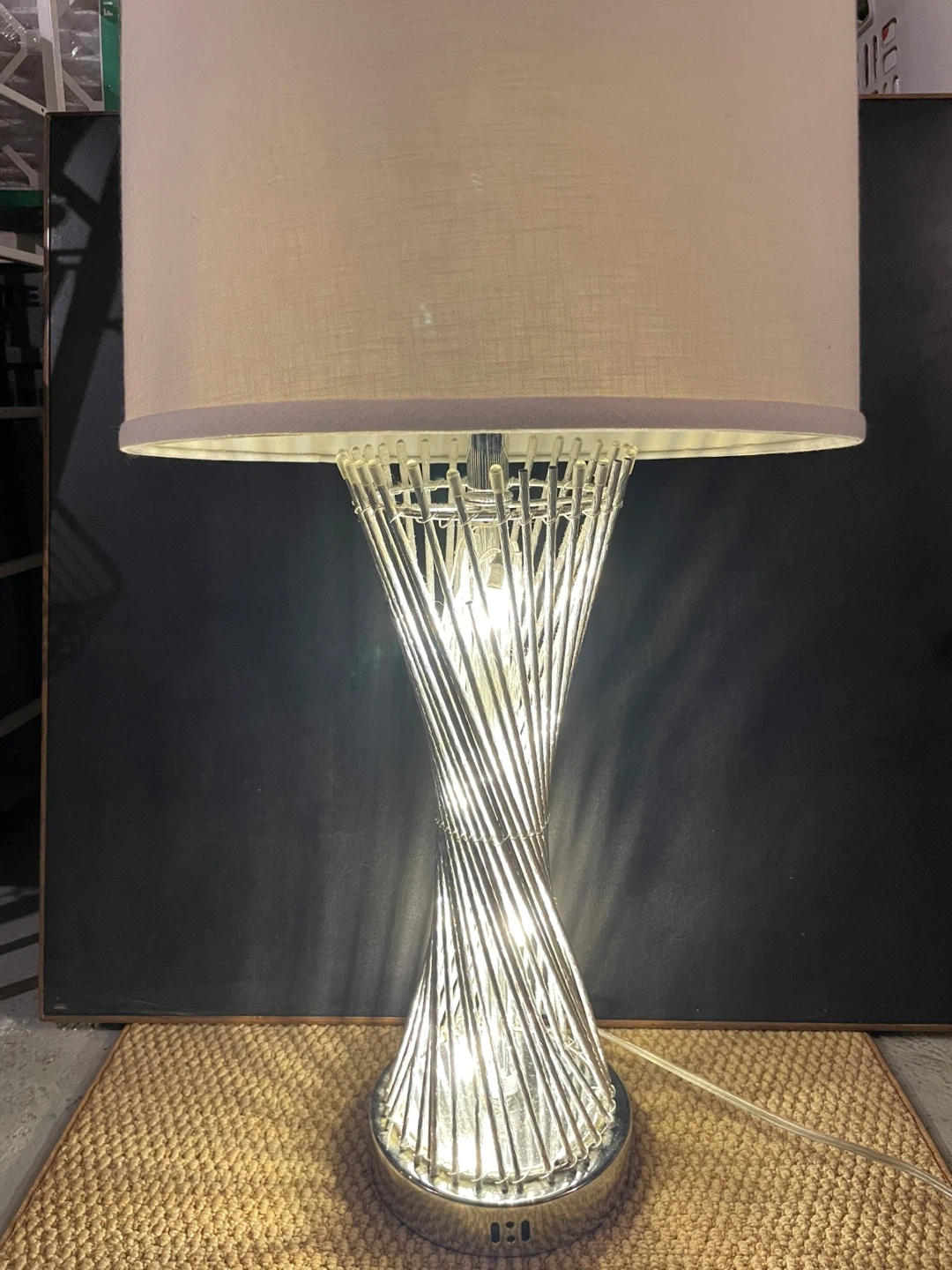 This table lamp has a unique spiral chrome base. It includes a neutral-toned drum shade. It's a great accent piece for any room!