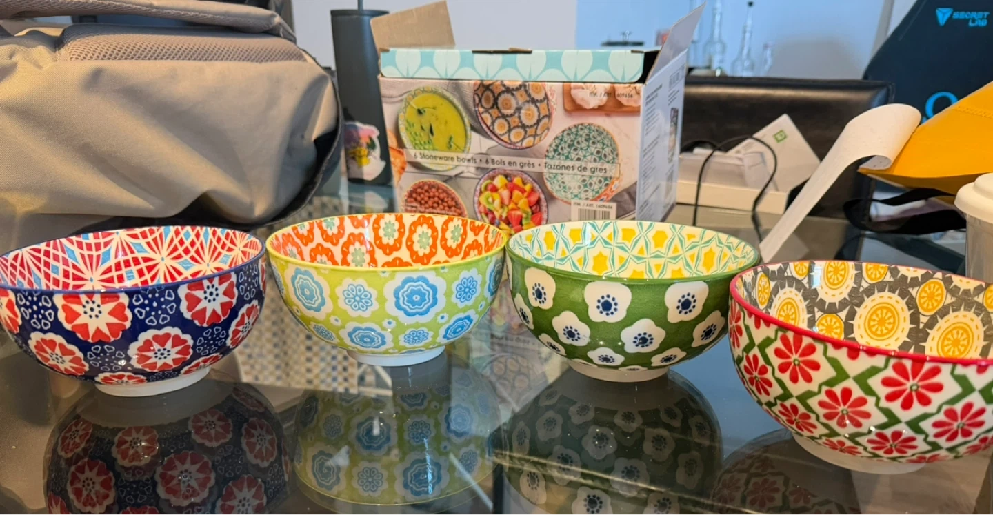 This is a set of 6 colourful stoneware bowls. Each bowl has a unique floral pattern. They're perfect for serving snacks or small meals.