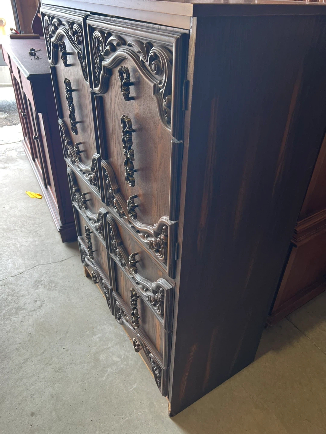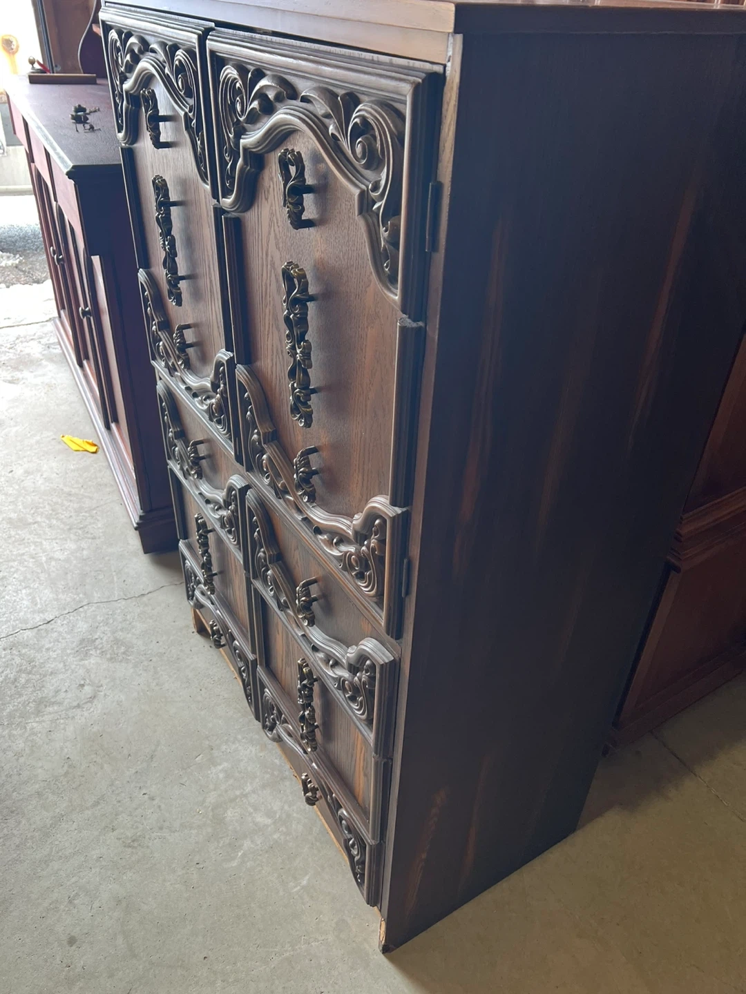 A beautiful dark wood dresser with ornate carvings and brass hardware. It features six drawers and two cabinets for ample storage. This piece would add a classic touch to any bedroom.