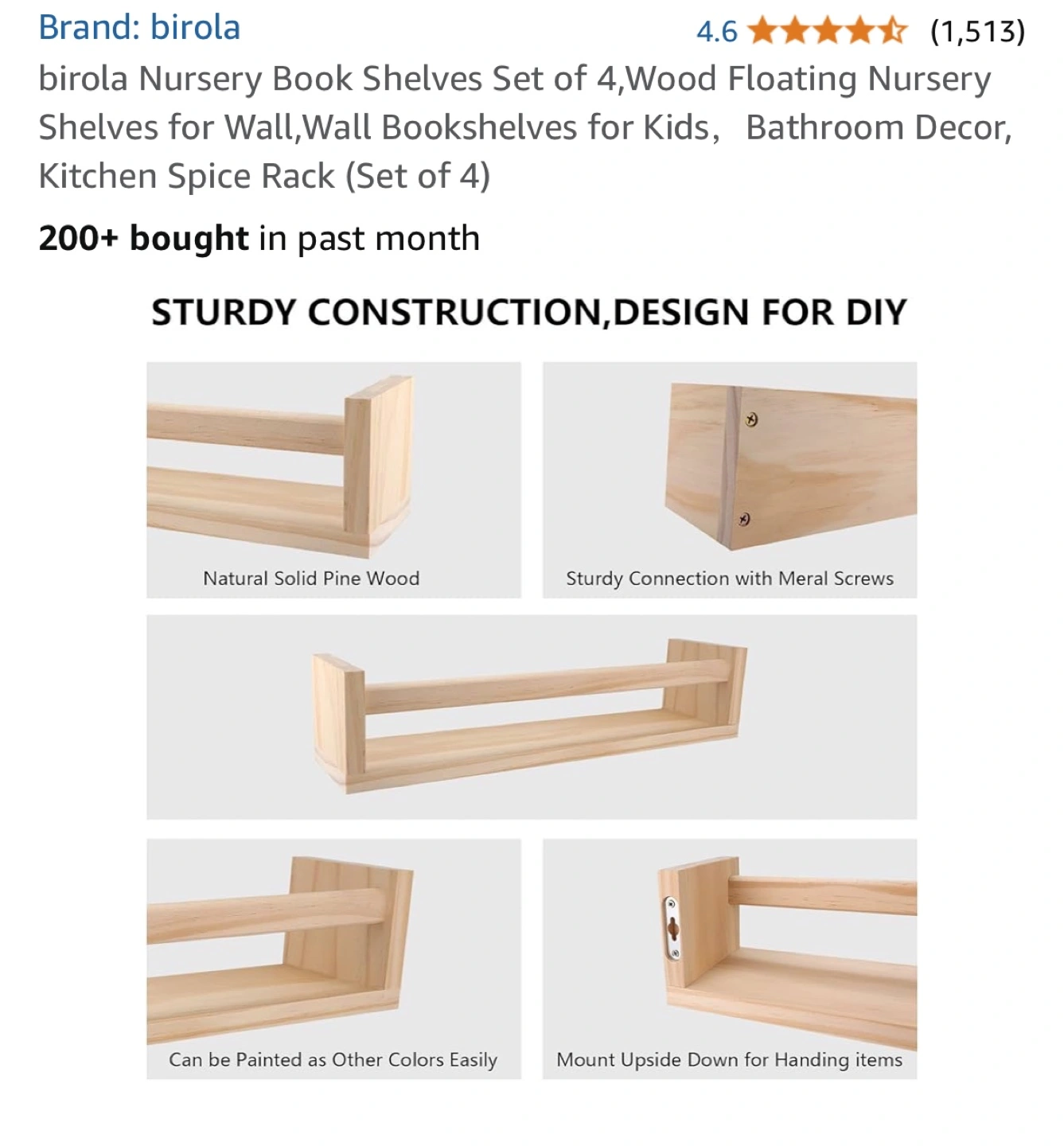 Set of 4 and 2 wooden shelves. Great for a nursery, bathroom, or kitchen. Made of natural solid pine wood.( brand new)