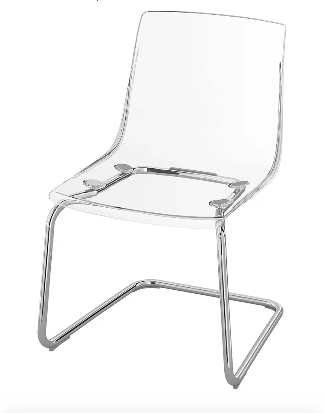 Selling a clear IKEA Tobias chair. It's in great condition and ready for a new home! The chair has a sleek, modern design with a transparent seat and chrome-plated legs. It measures 42cm wide, 82cm high, and 55cm deep.