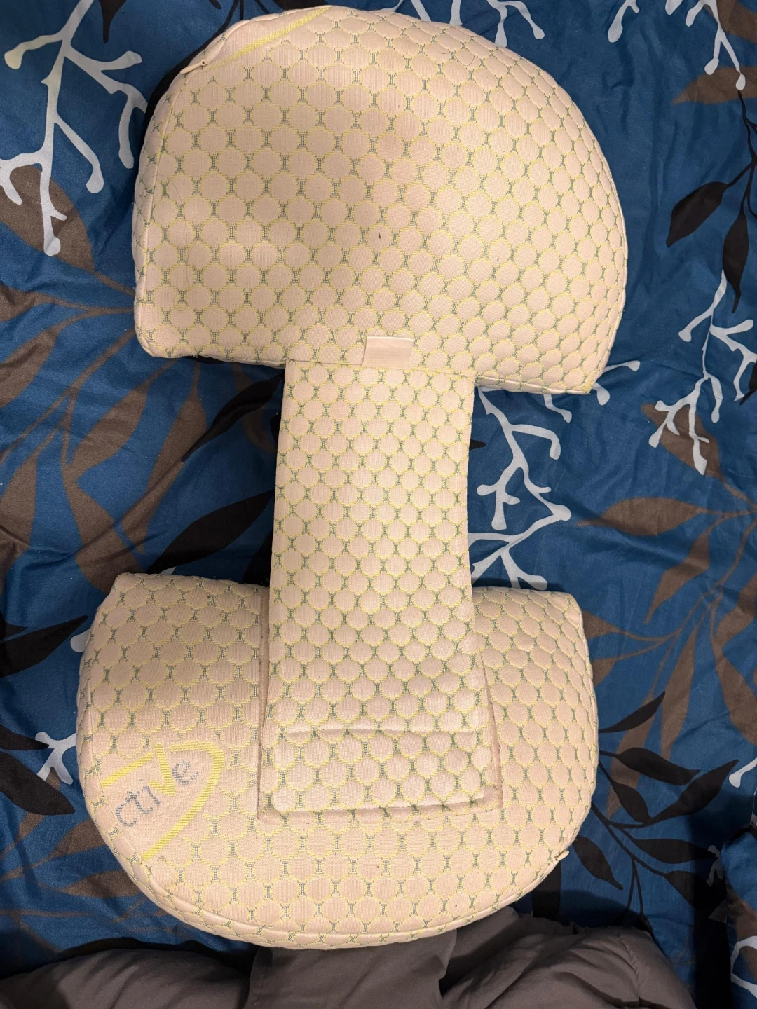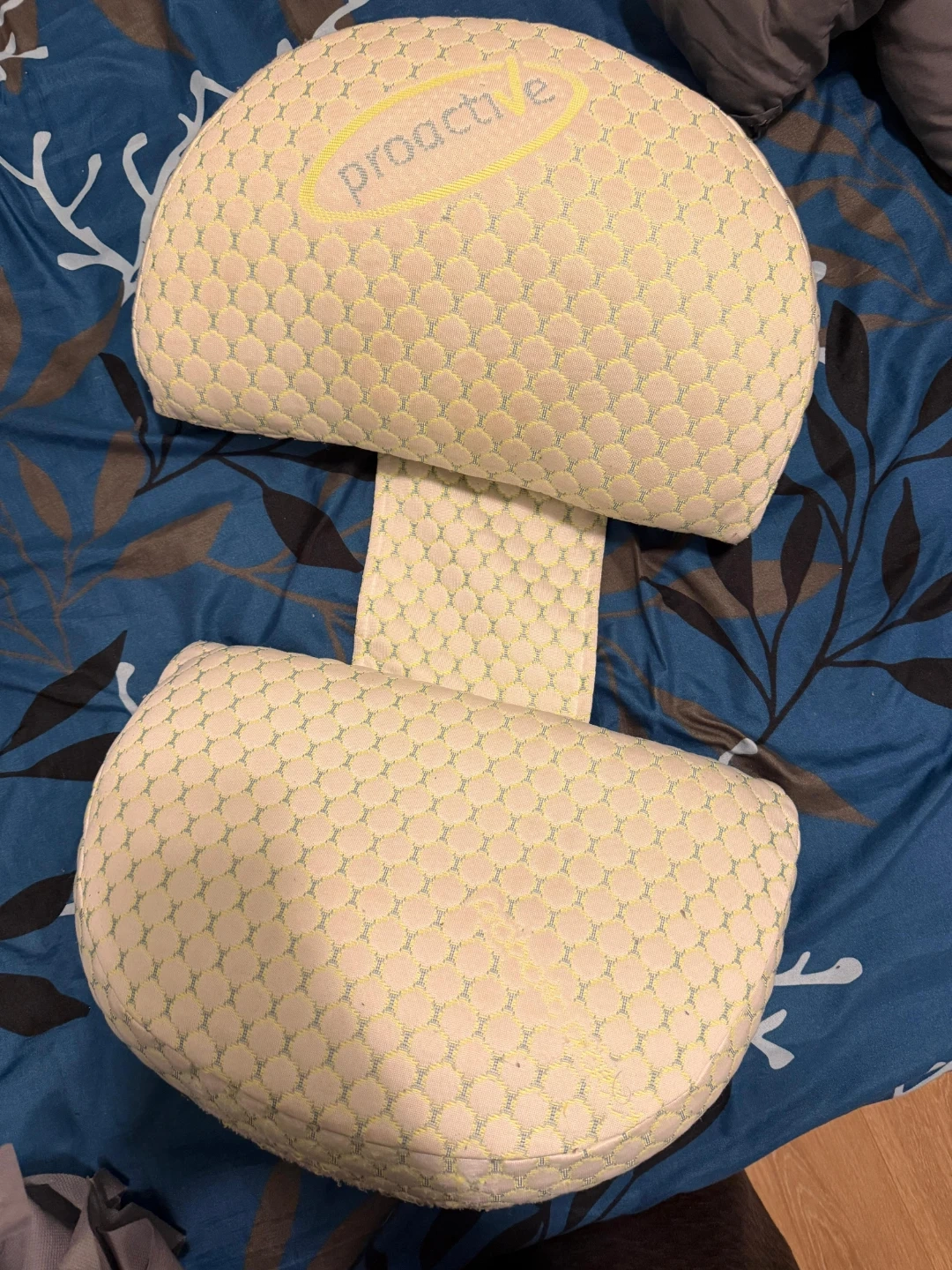 This Proactive pregnancy pillow offers comfort and support. It features a distinctive patterned fabric. The pillow's H-shape design is intended for optimal ergonomic positioning.