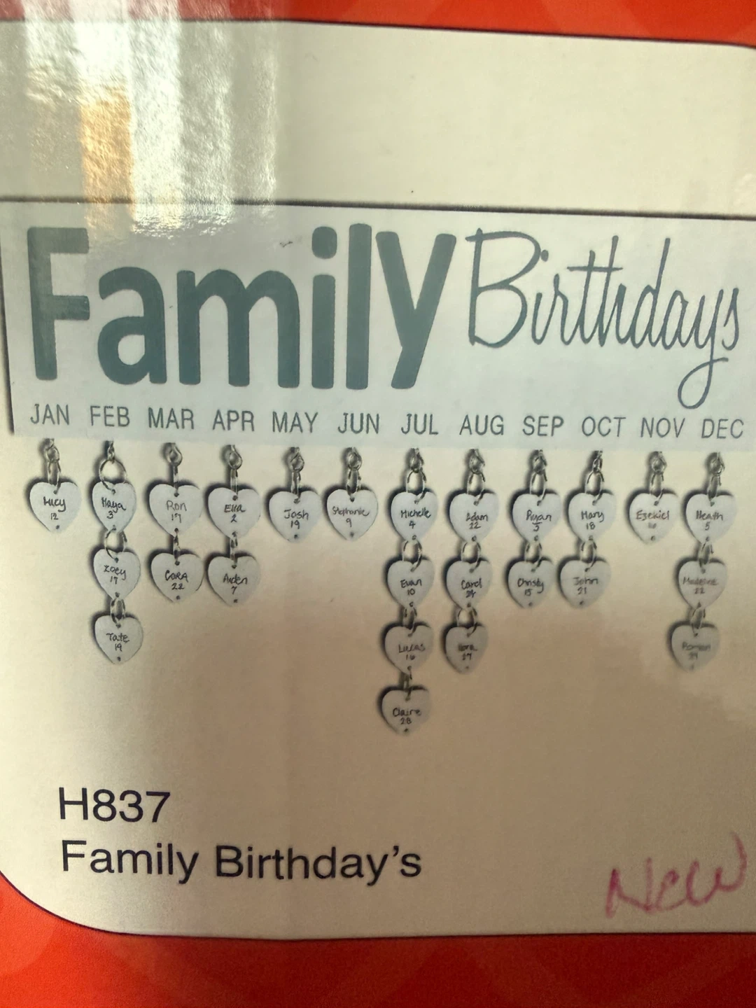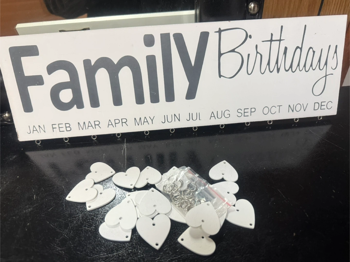 Keep track of important dates with this 'Family Birthdays' sign. It includes a wooden board with months and an assortment of blank heart-shaped charms and jump rings to customize. Great for remembering family and friend birthdays!