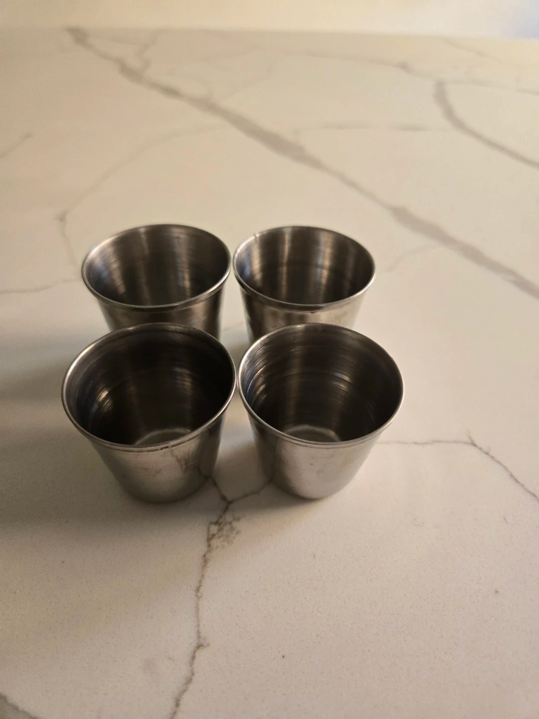 Selling a set of 4 stainless steel ramekins. They're in great condition and perfect for baking, cooking, or serving dips and sauces. They are made of stainless steel and are easy to clean
