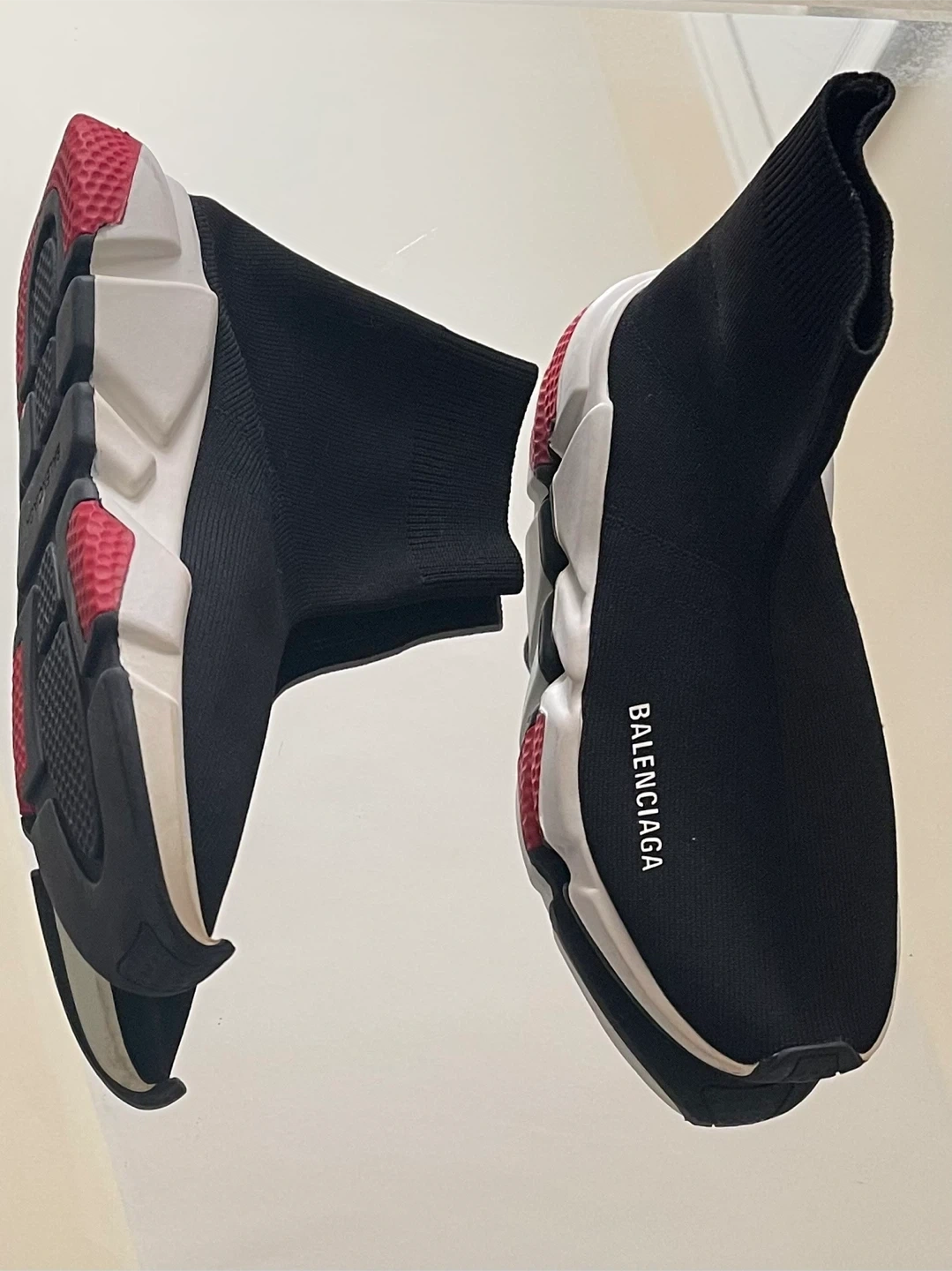 Selling a pair of Balenciaga Speed Sock sneakers! They're black with a white and red sole. Stylish and comfortable, these are sure to turn heads
