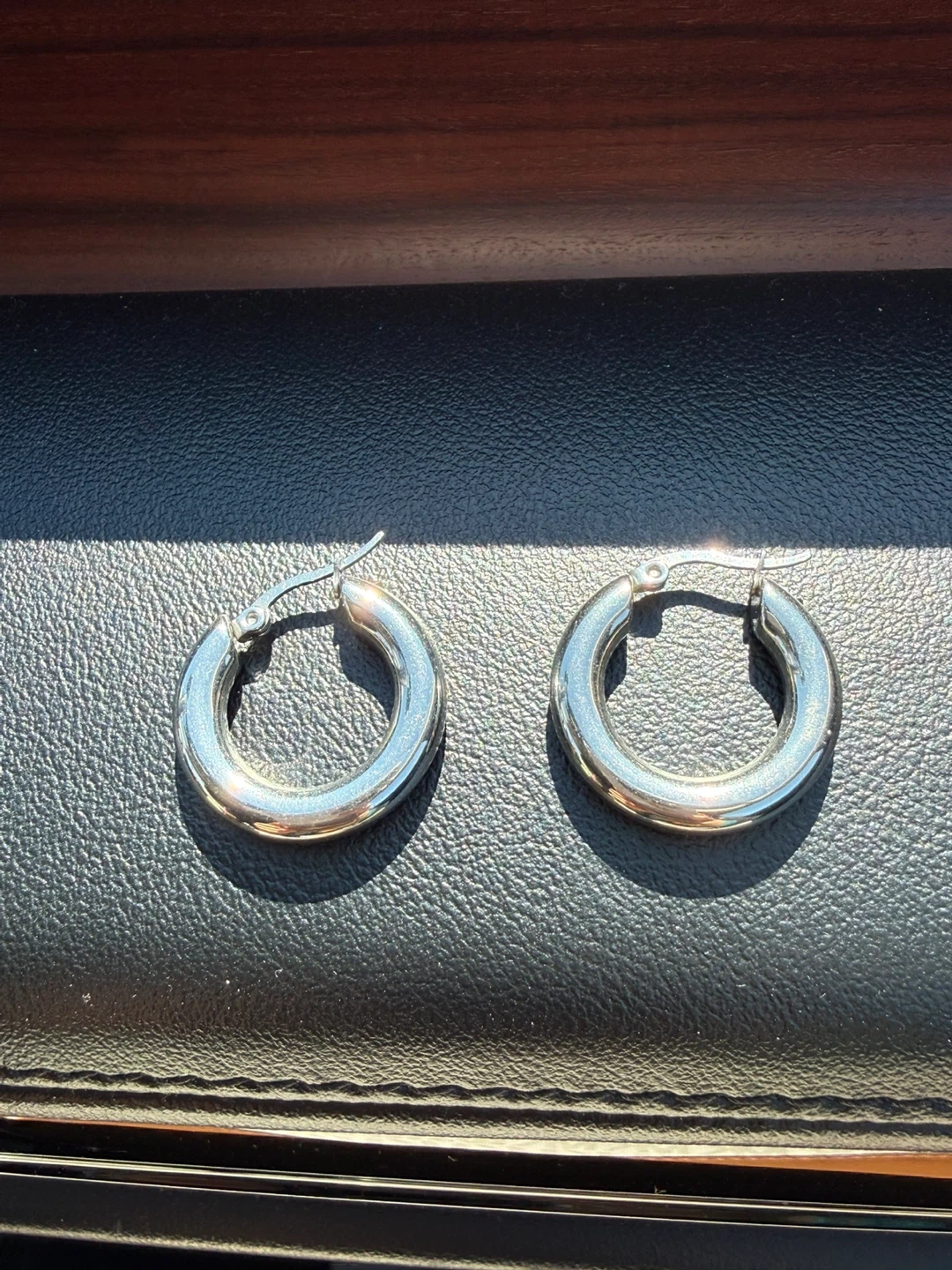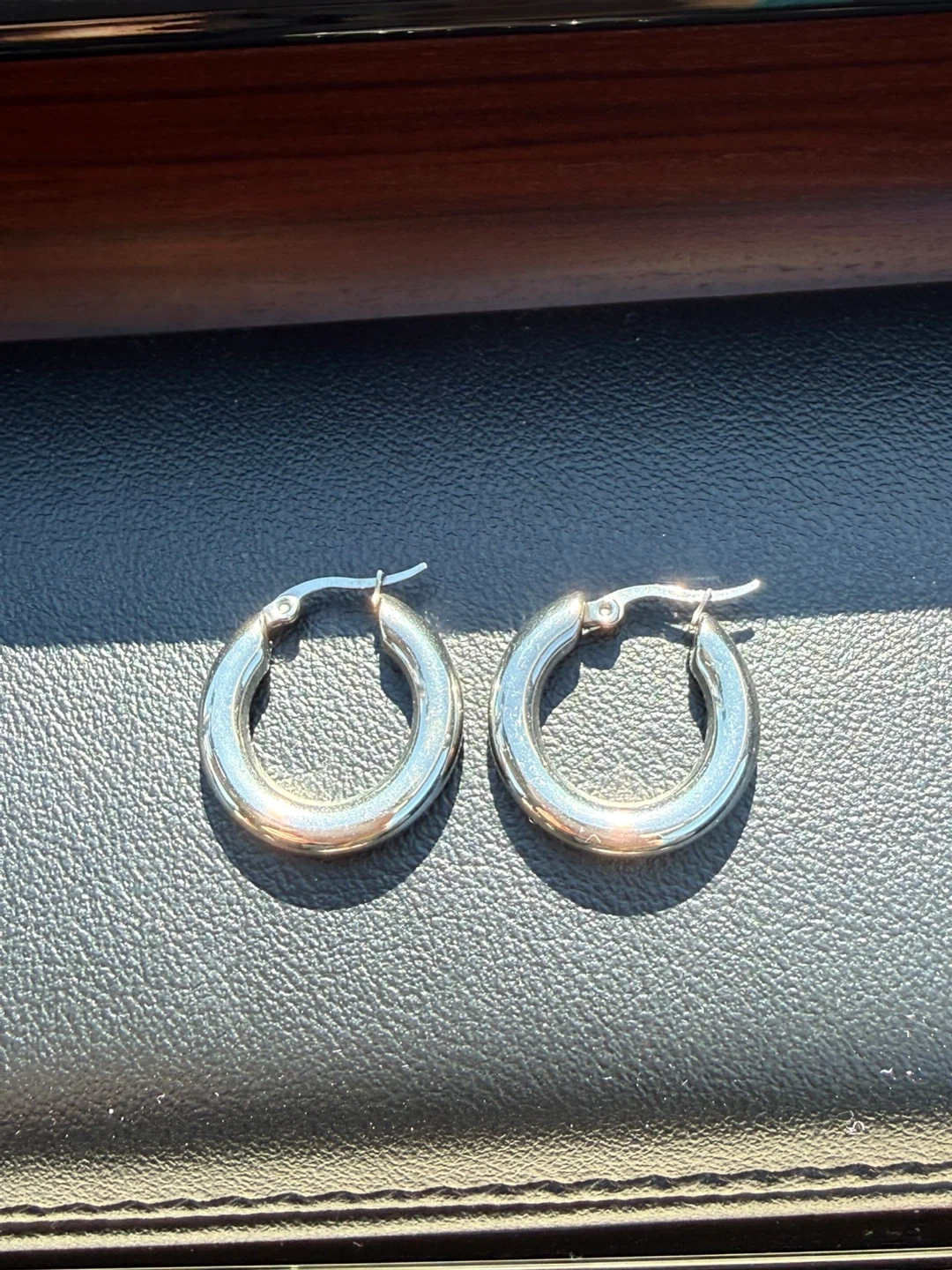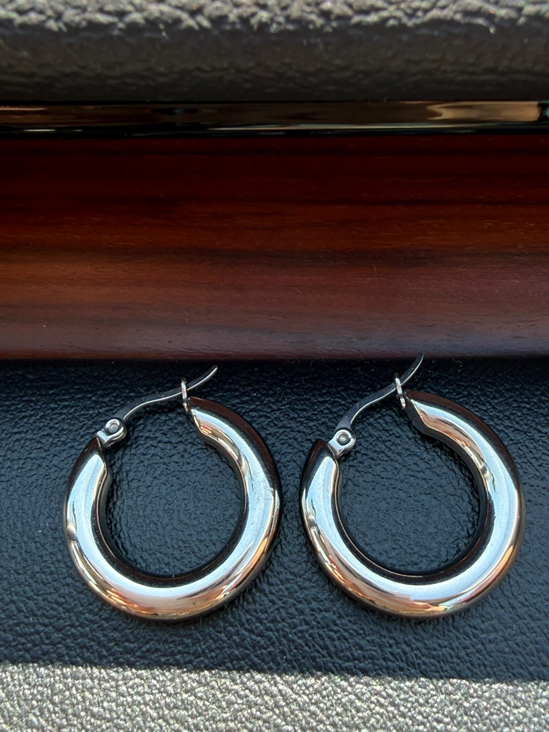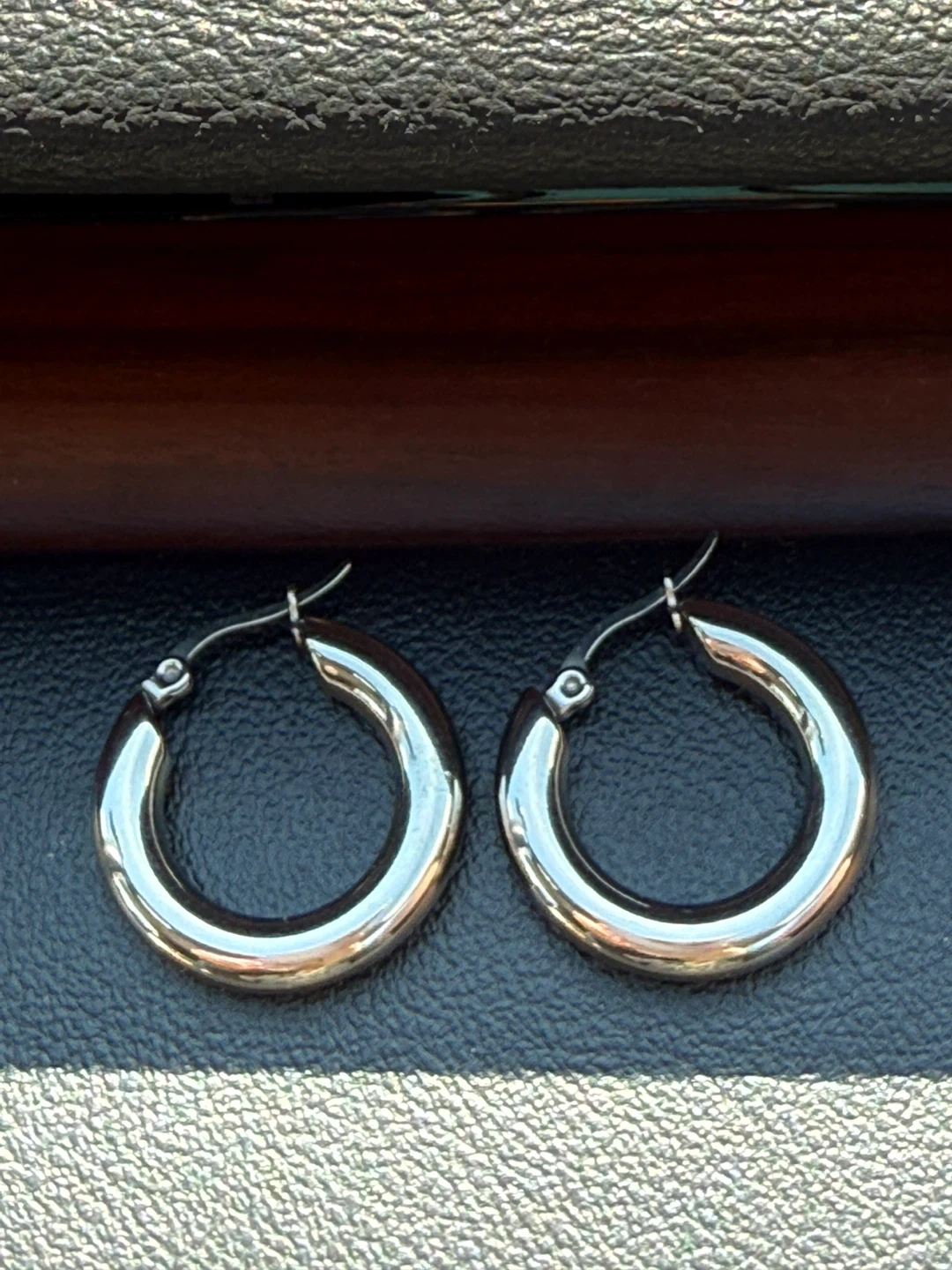 Chunky silver hoop earrings. These earrings have a polished silver tone and a secure latch closure. They're a classic accessory for everyday wear!