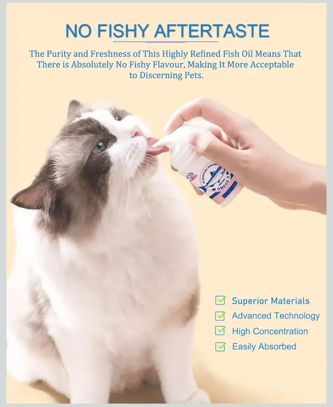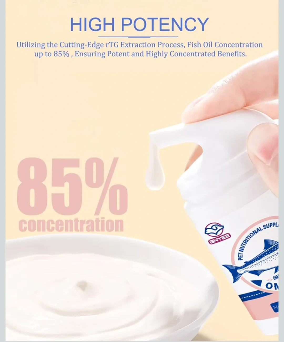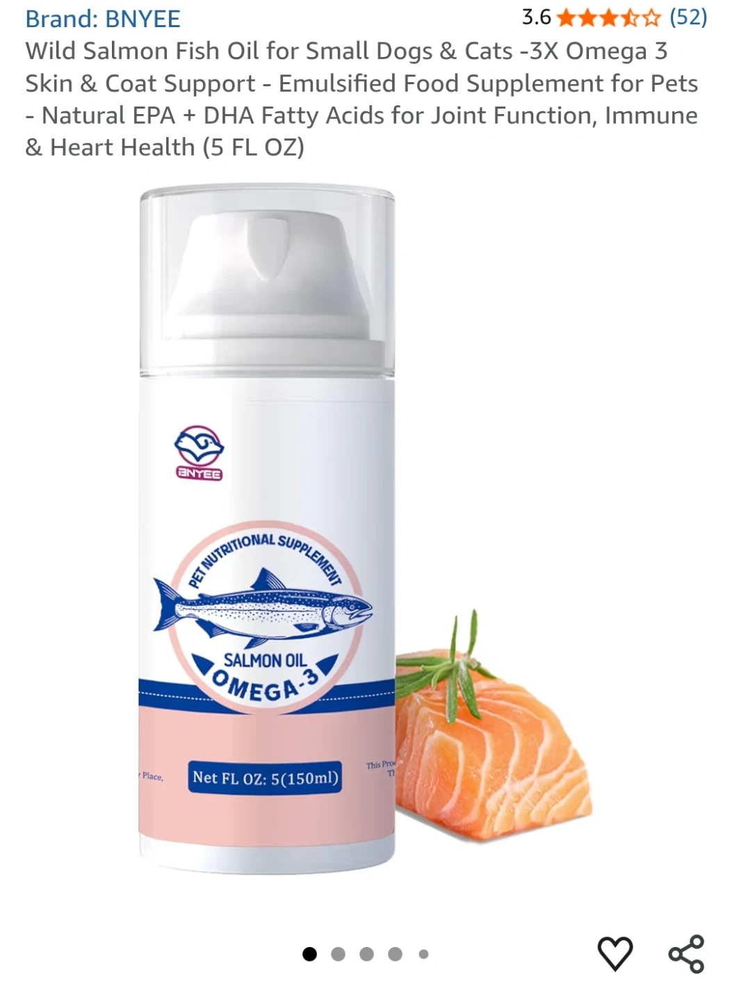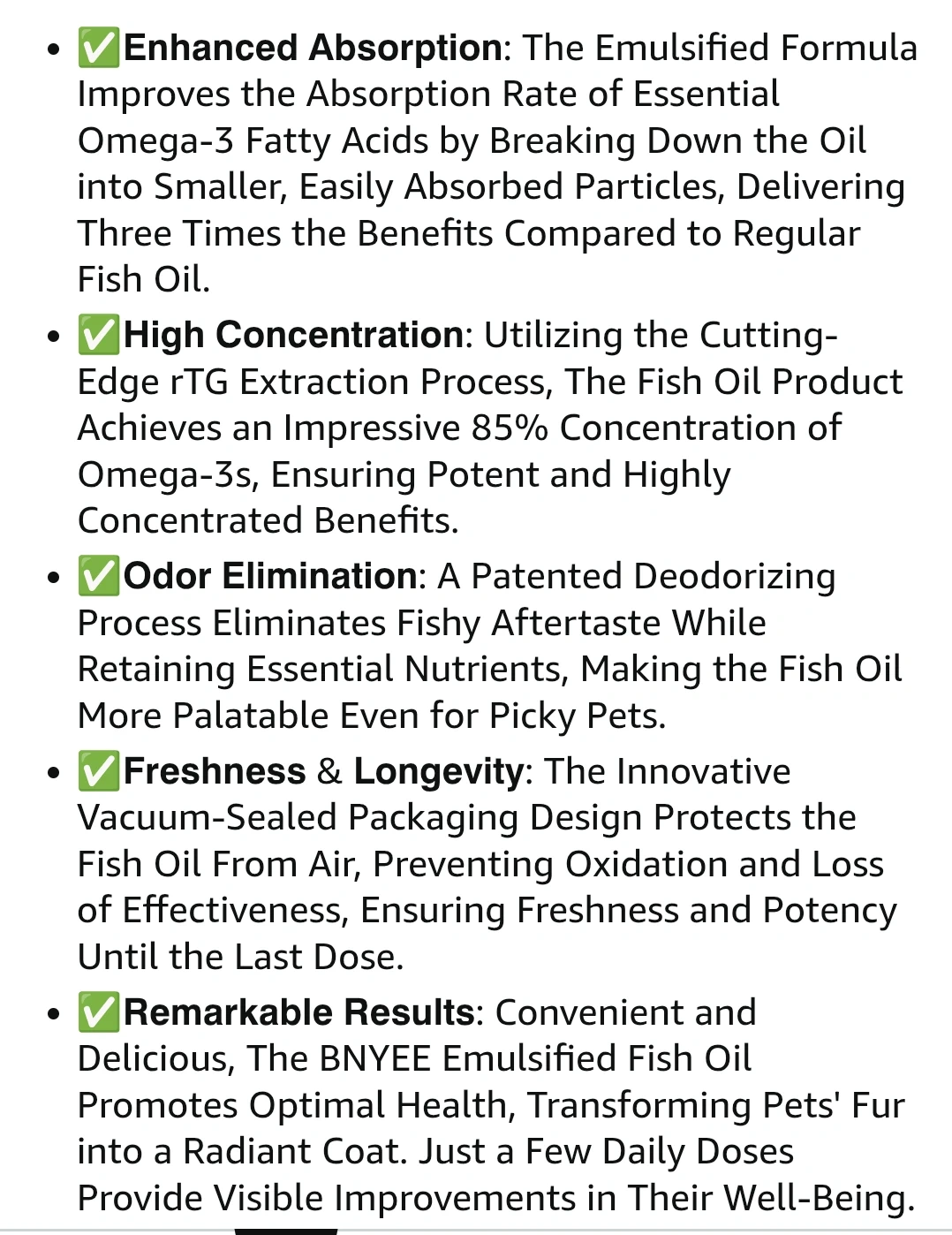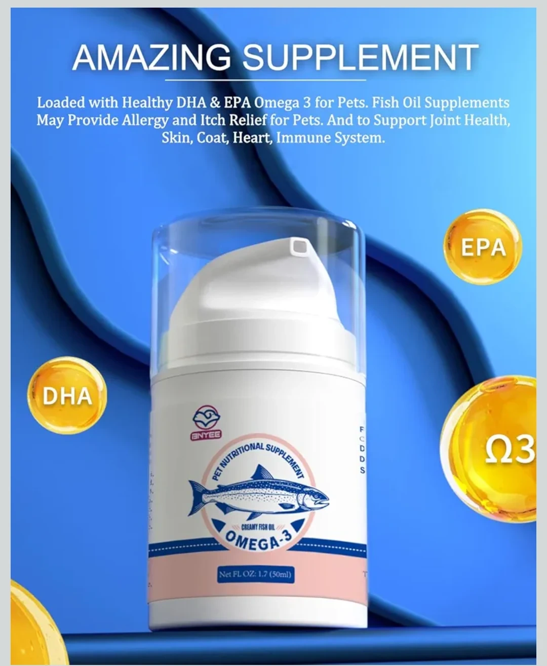 This Bnyee wild salmon oil is made with superior materials and has a high concentration of Omega-3 for pets. It's formulated with natural EPA and DHA fatty acids to support joint function, skin, coat, and immune health. The formula has no fishy aftertaste, making it more acceptable to discerning pets.