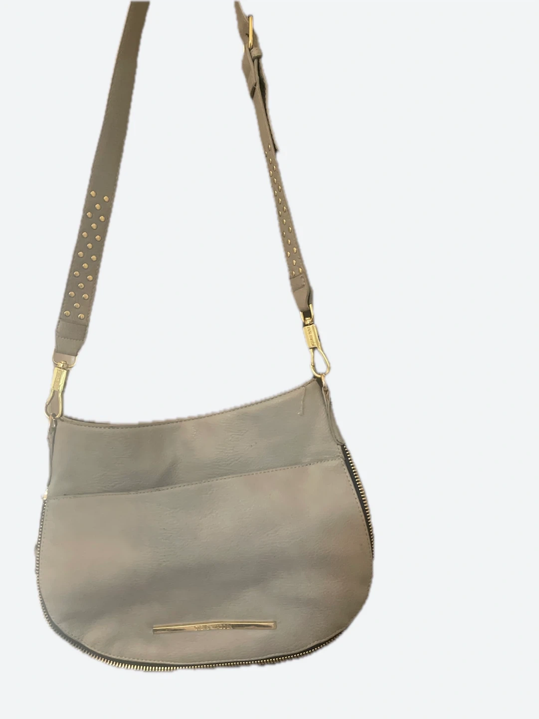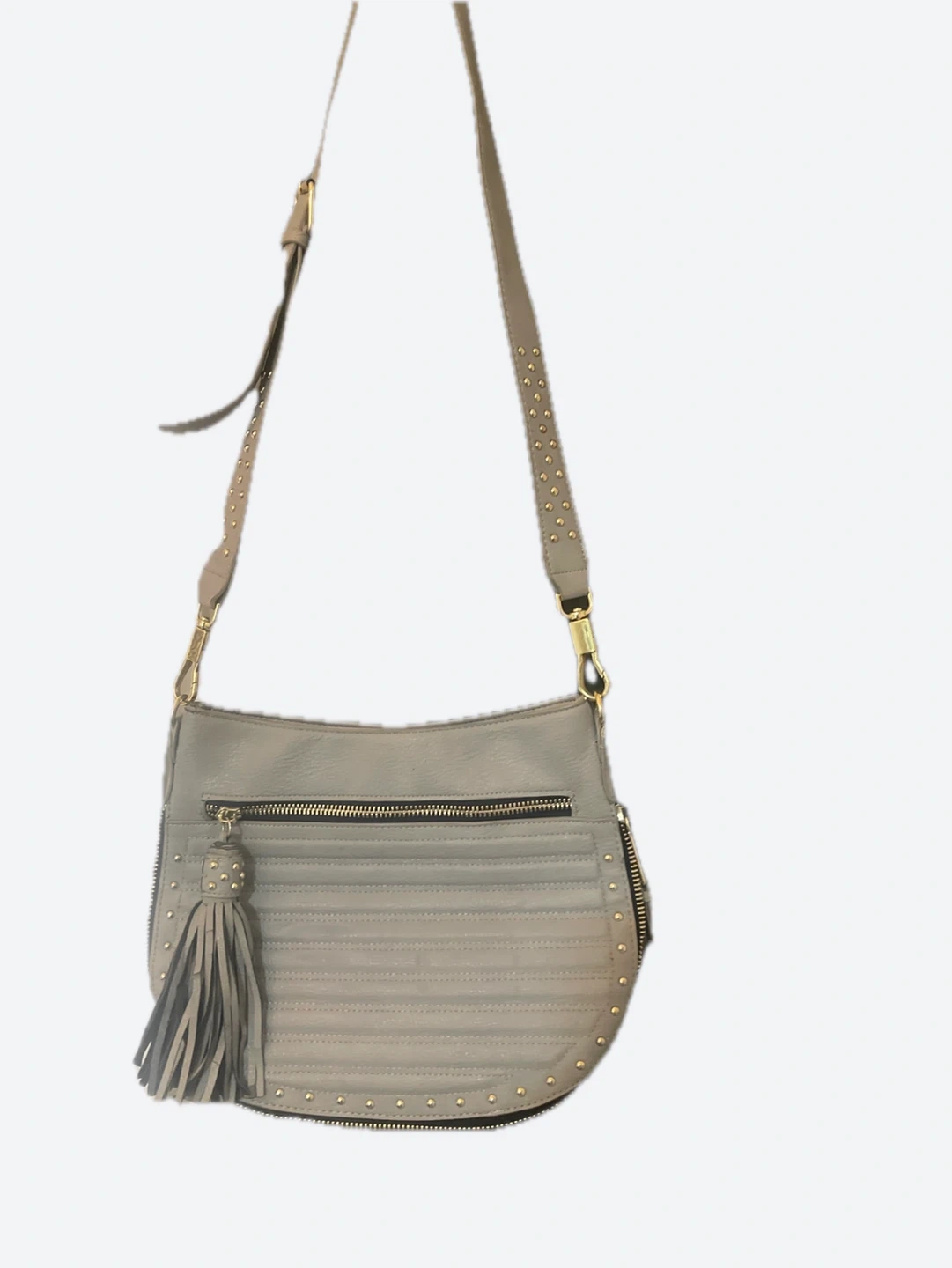 Steve Madden crossbody bag in a light gray color. It's accented with gold studs and a tassel detail. This bag features multiple zippered compartments for organization.